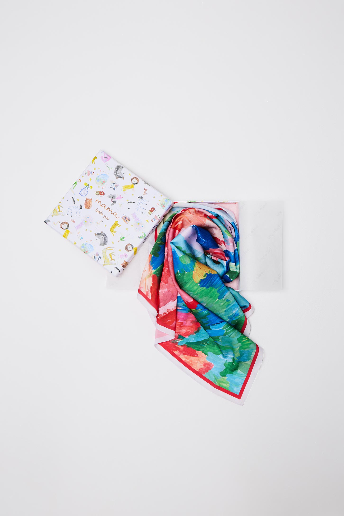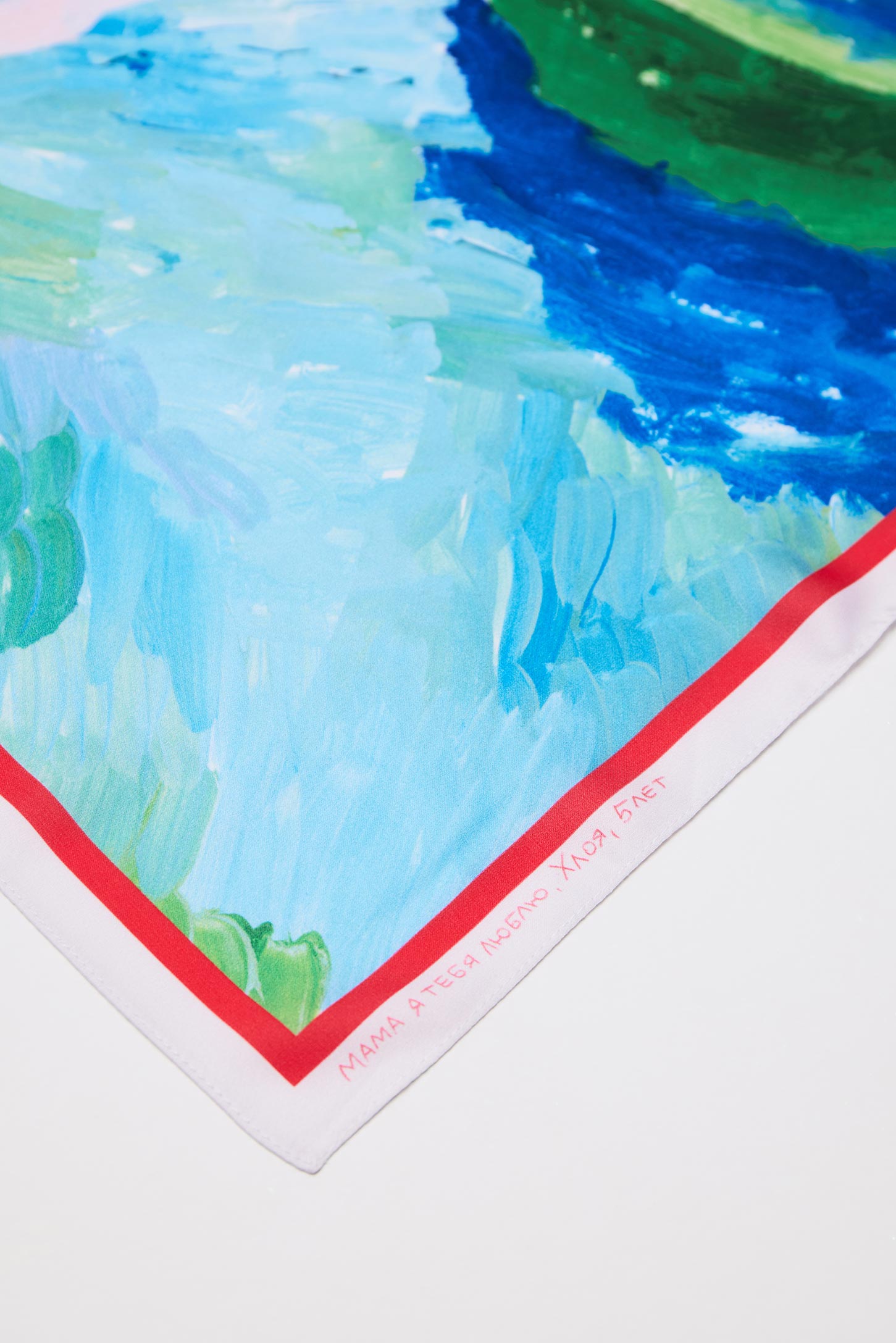 Шелковистый платок станет отличным акцентом при создании актуального стильного образа. Универсальный размер и форма платка позволяет носить аксессуар различными способами: повязав его на голову, на шею или на запястье. Оригинальный принт с детскими рисунками делает этот аксессуар уникальным. Гладкая фактура материала имеет благородный блеск.