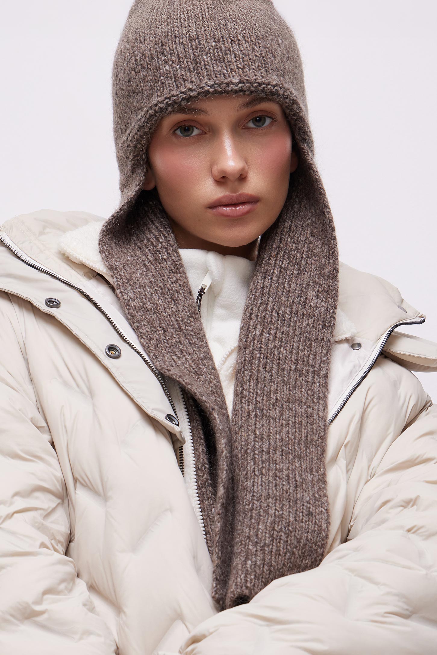 Модель дополнена вязаными длинными ушками по бокам которые можно использовать в качестве шарфа. Подходит для холодного времени года.