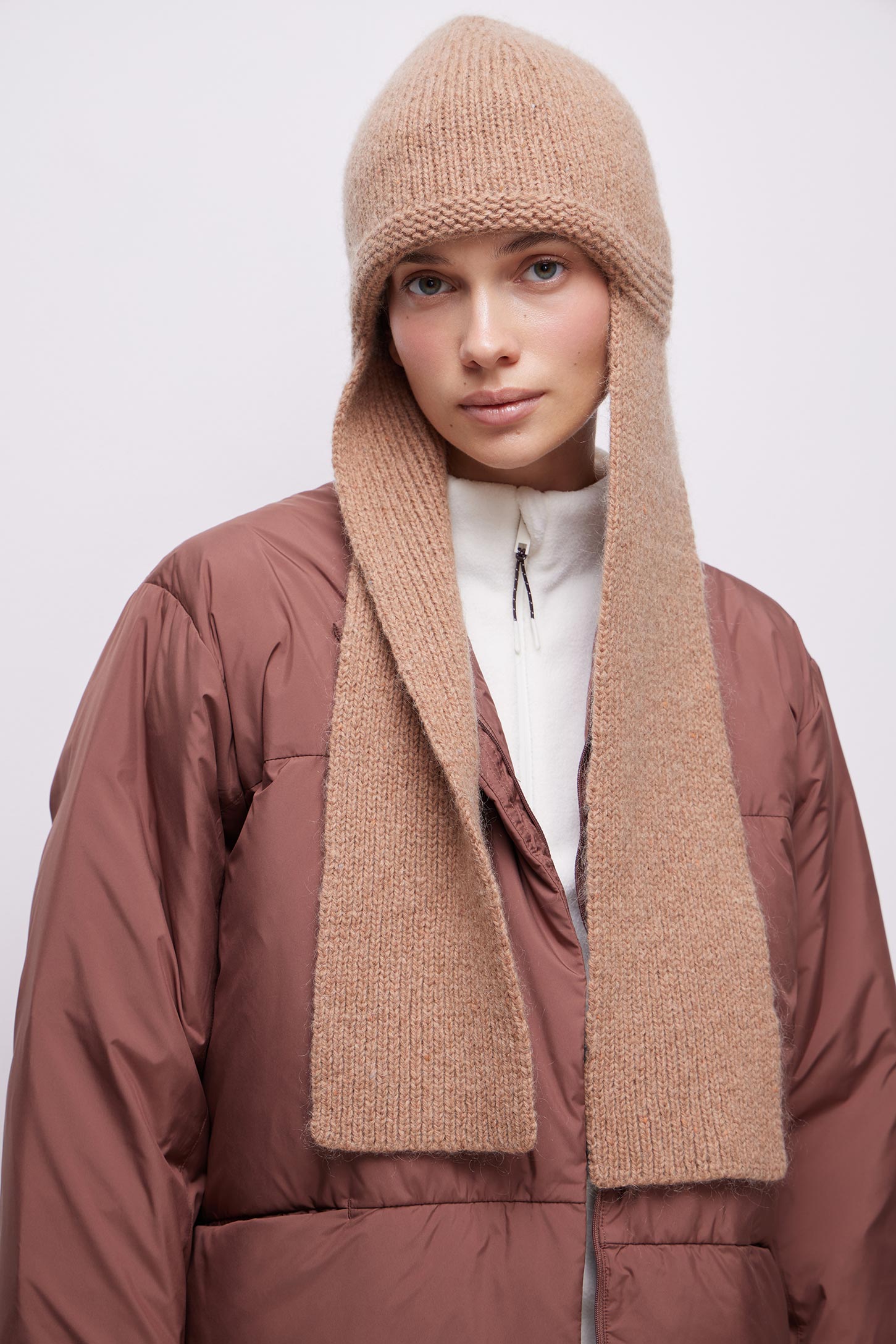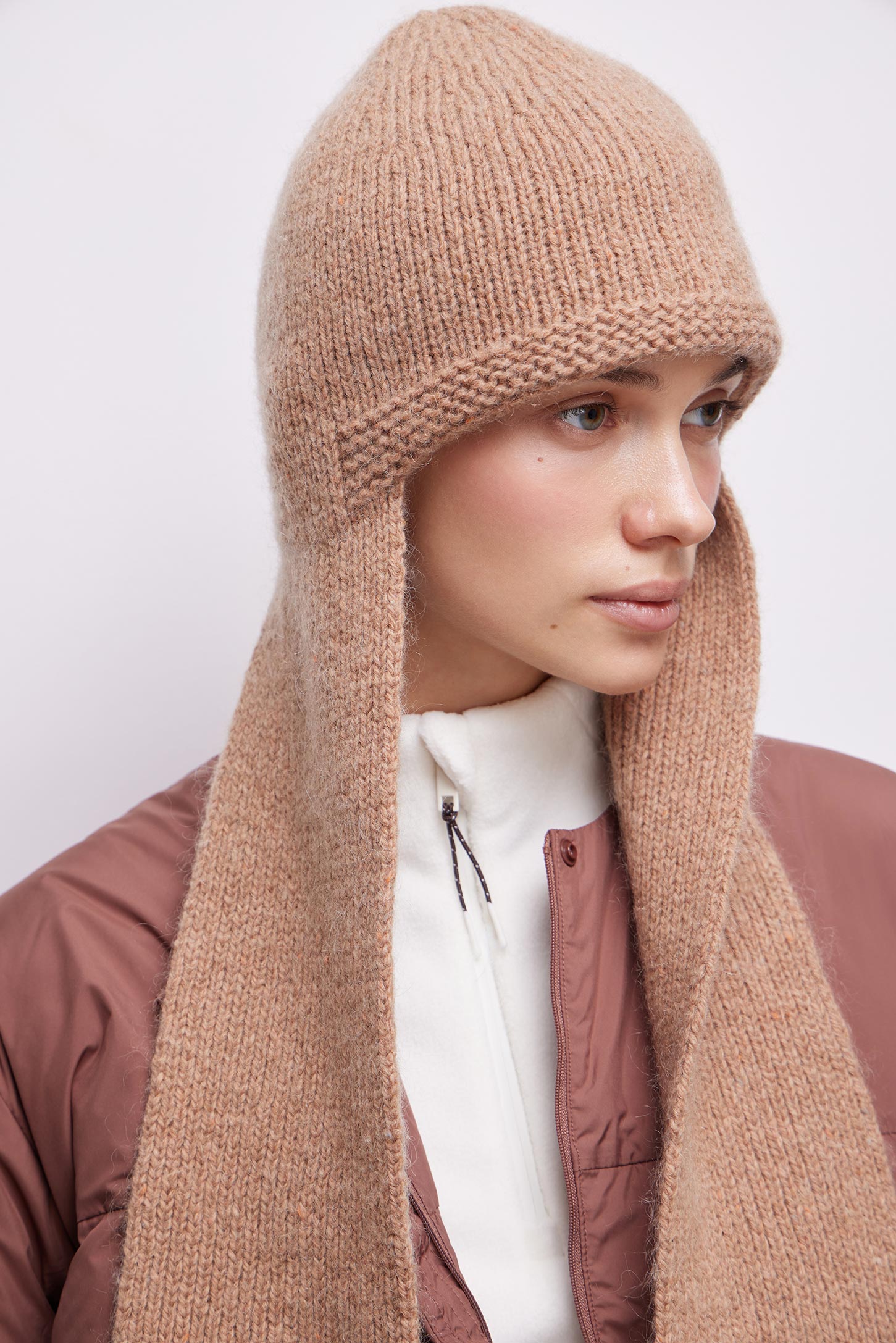 Модель дополнена вязаными длинными ушками по бокам которые можно использовать в качестве шарфа. Подходит для холодного времени года.