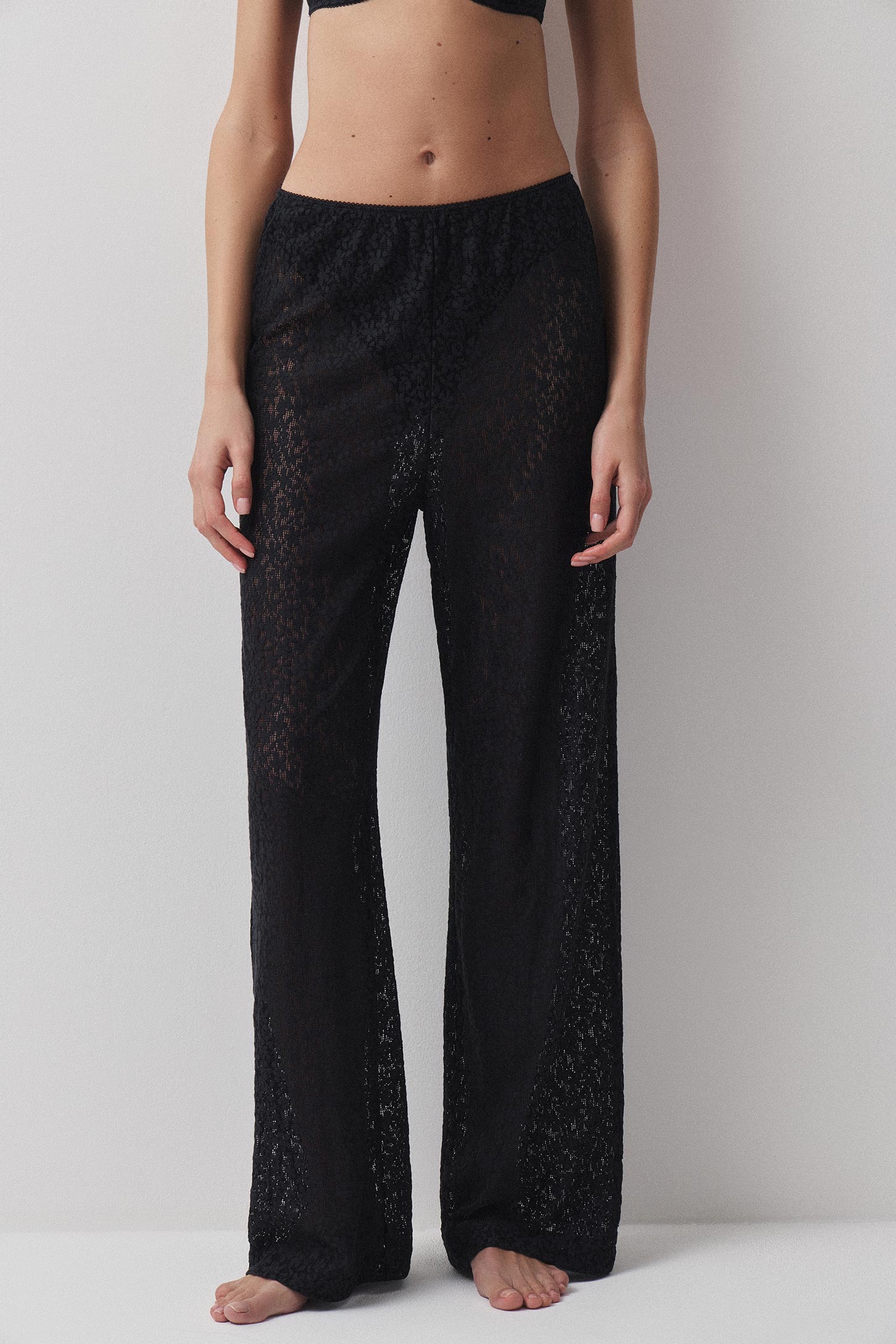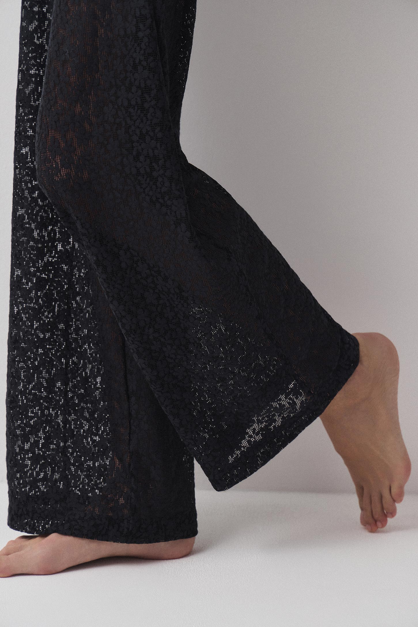 Брюки изготовлены из эластичного, ажурного кружева с натуральным составом. Модель свободного силуэта с небольшой сборкой по талии. Длина изделия классическая. Пояс обработан эластичной тесьмой с фестонами. Изделие без подкладки.