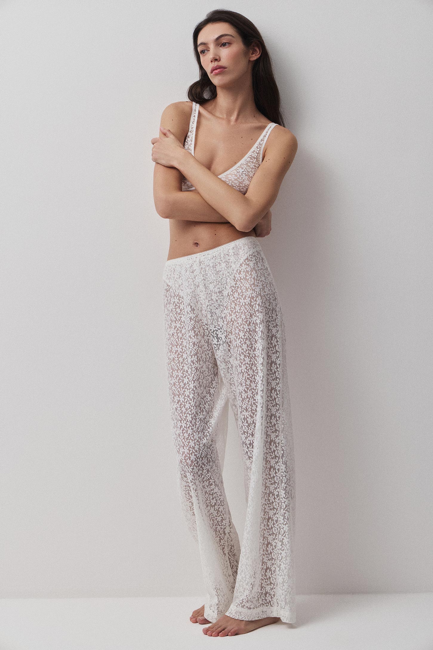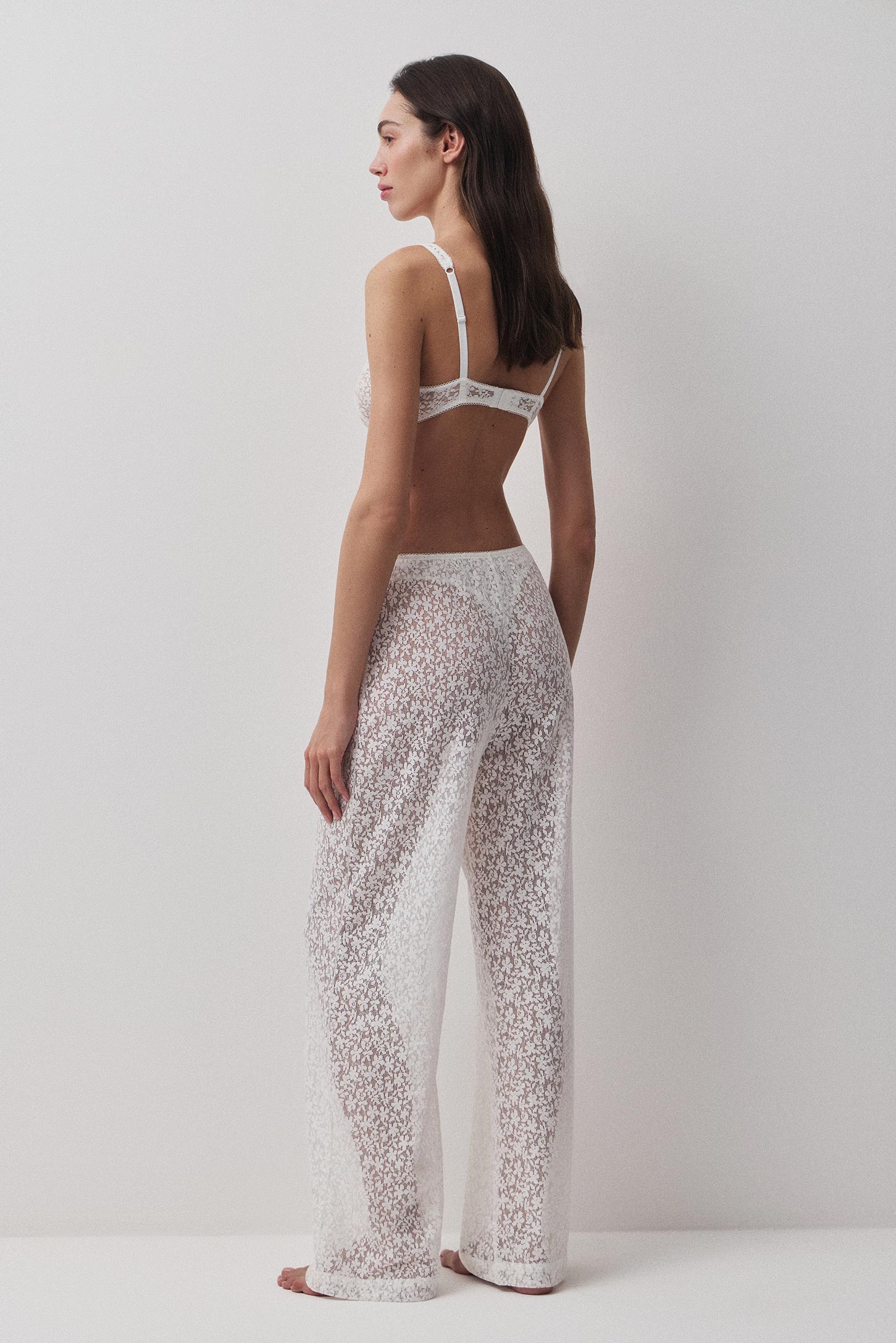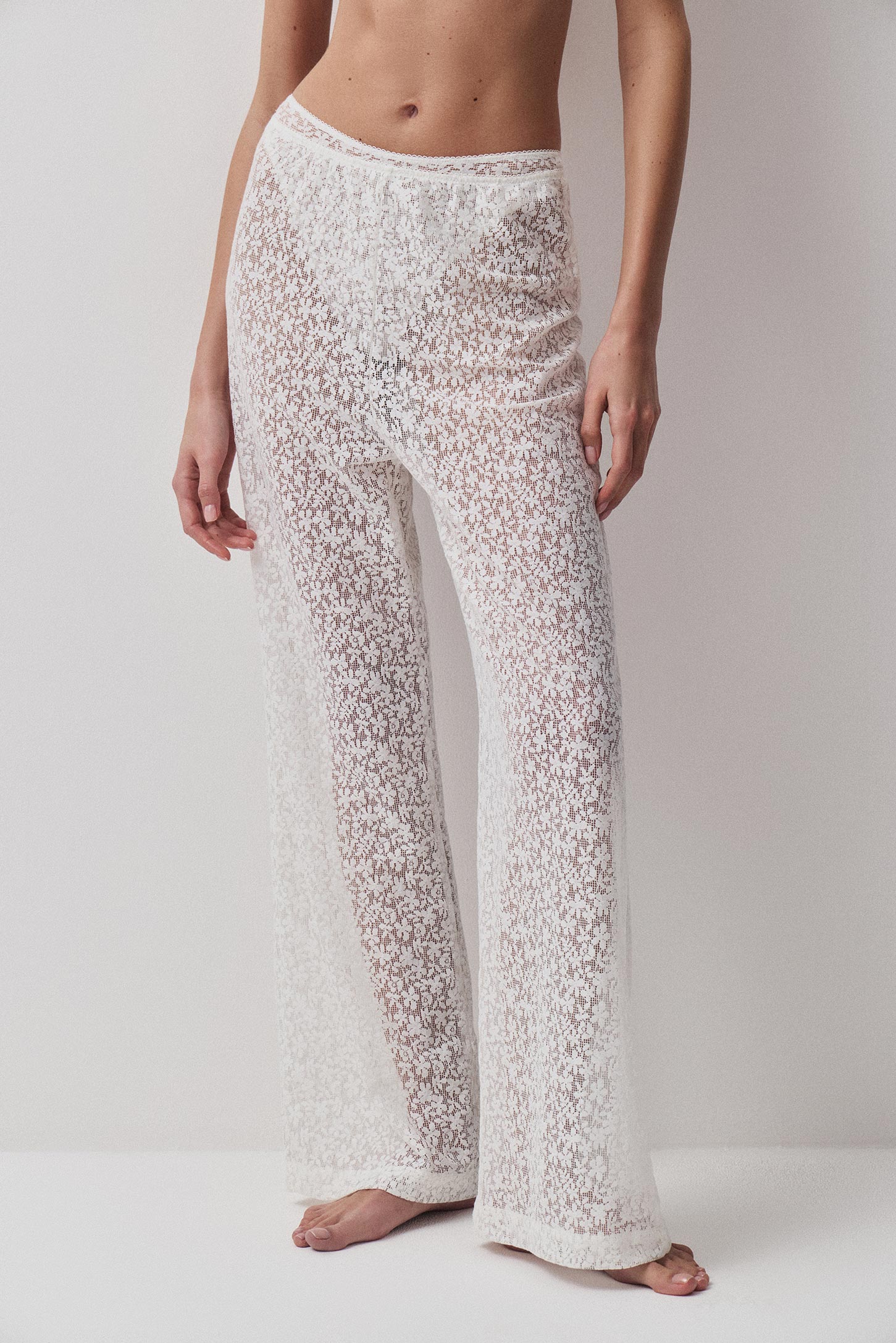 Брюки изготовлены из эластичного, ажурного кружева с натуральным составом. Модель свободного силуэта с небольшой сборкой по талии. Длина изделия классическая. Пояс обработан эластичной тесьмой с фестонами. Изделие без подкладки.