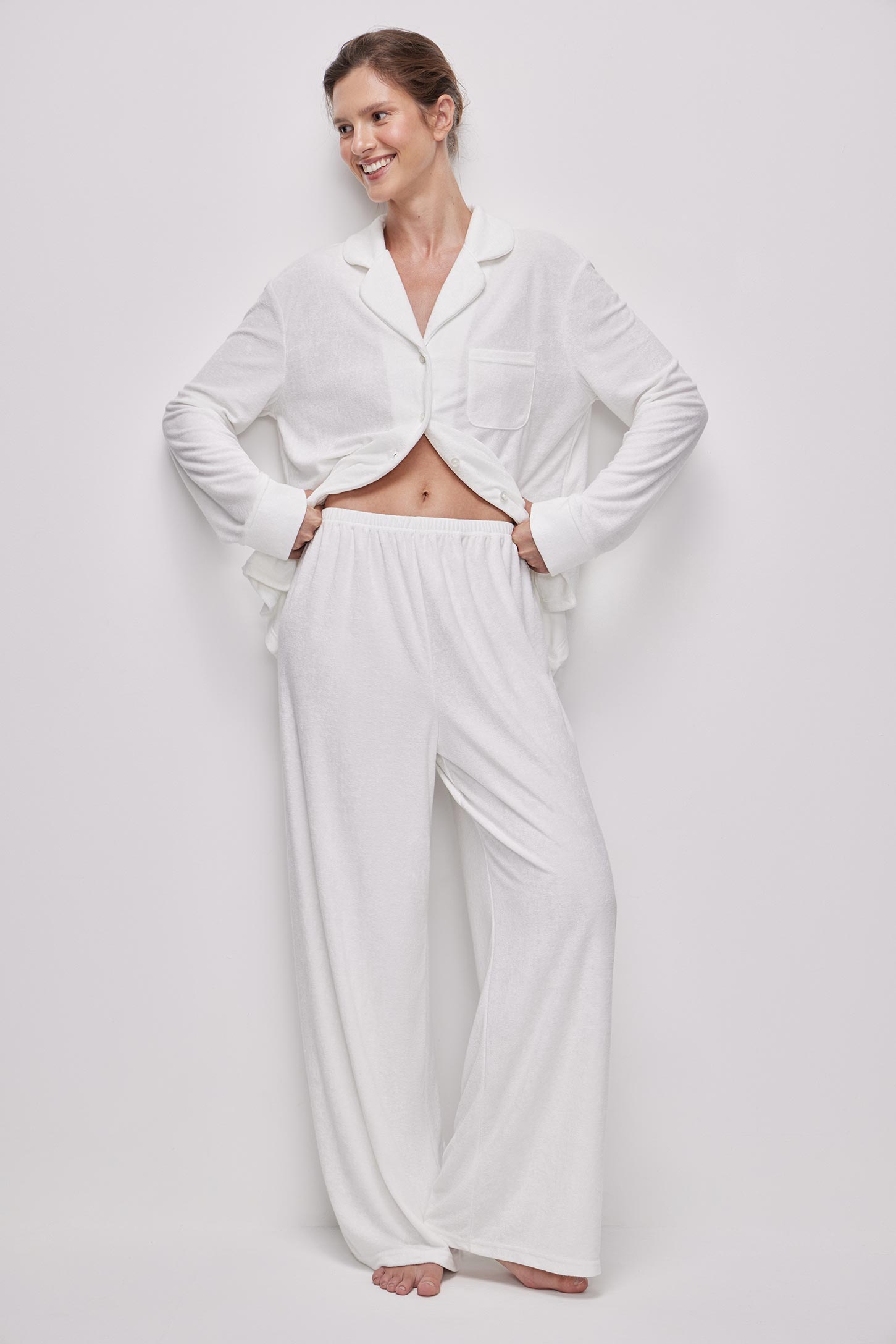 Пижамные брюки прямого силуэта из тонкой махры приятной на ощупь. Эластичный пояс на резинке равномерно фиксирует изделие и обеспечивает удобную посадку без давления. Прямой силуэт визуально вытягивает ноги и не сковывает движений. Посадка на талии обеспечивает комфорт и универсальность.