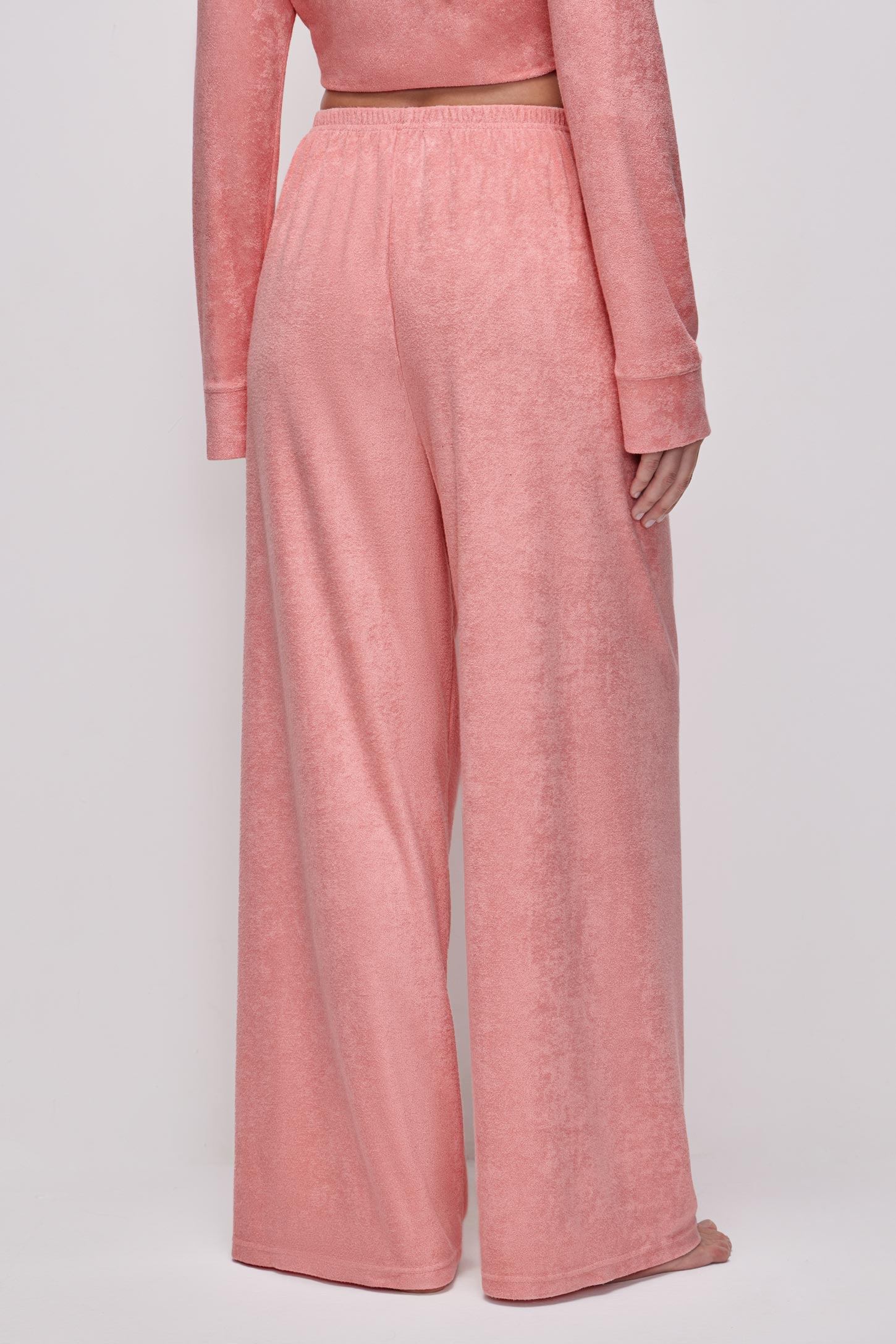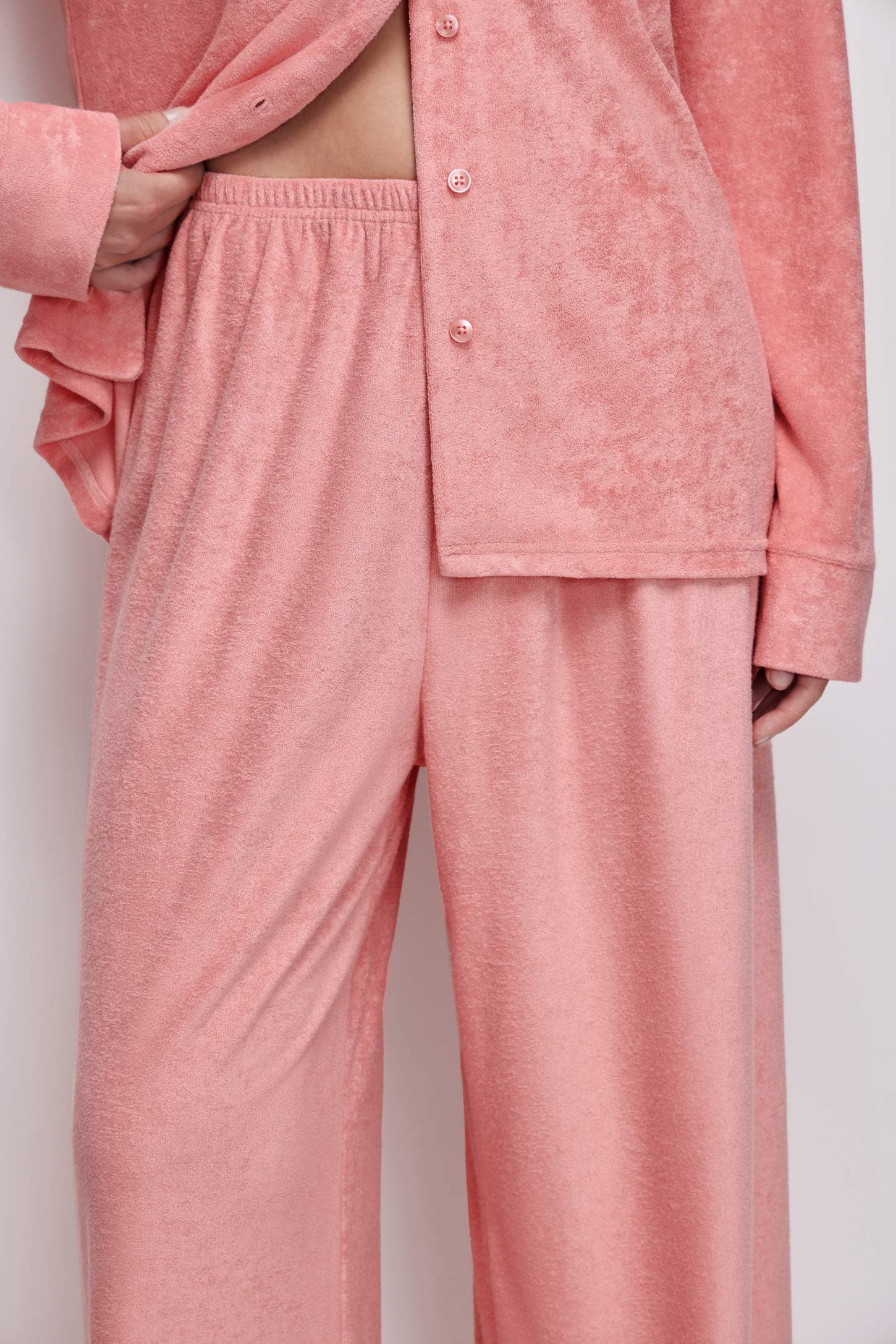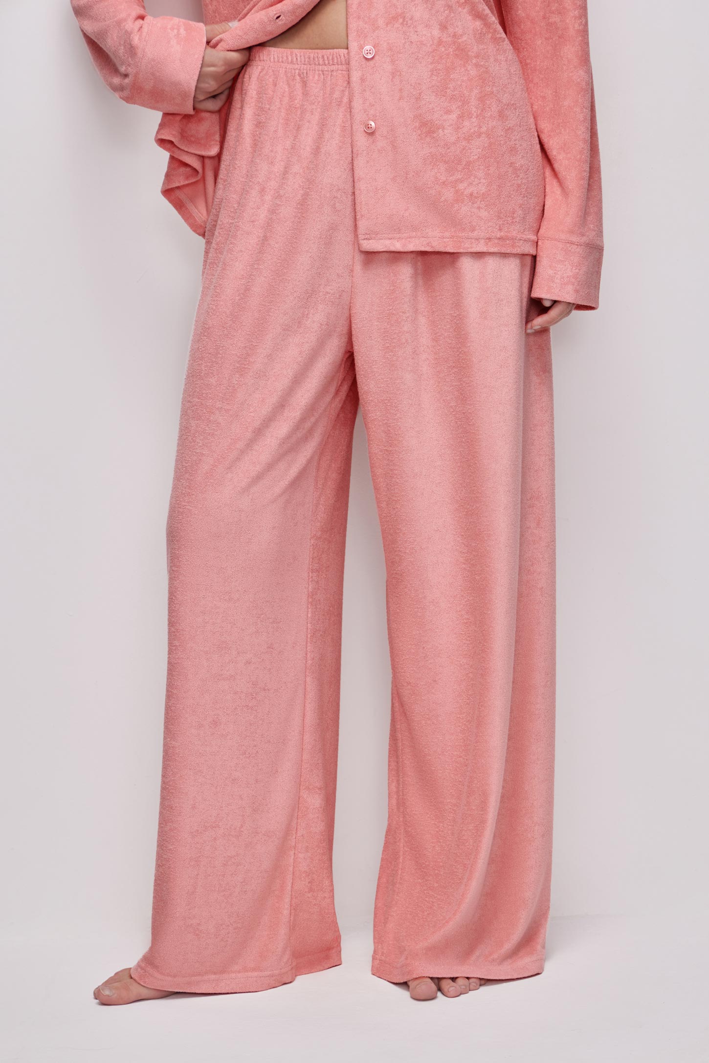 Пижамные брюки прямого силуэта из тонкой махры приятной на ощупь. Эластичный пояс на резинке равномерно фиксирует изделие и обеспечивает удобную посадку без давления. Прямой силуэт визуально вытягивает ноги и не сковывает движений. Посадка на талии обеспечивает комфорт и универсальность.