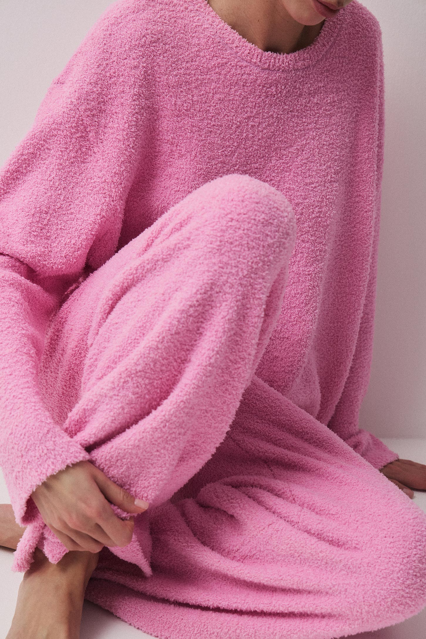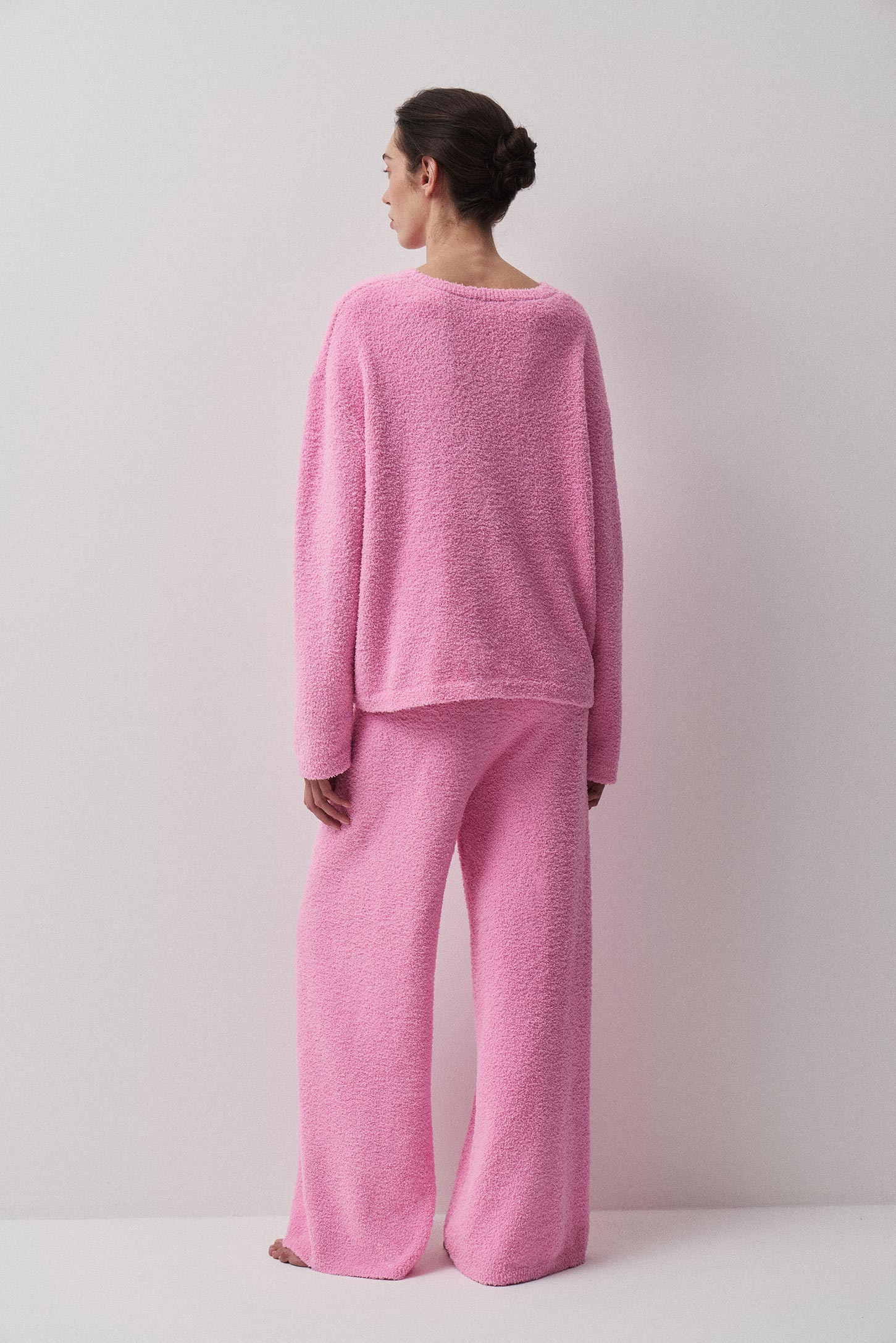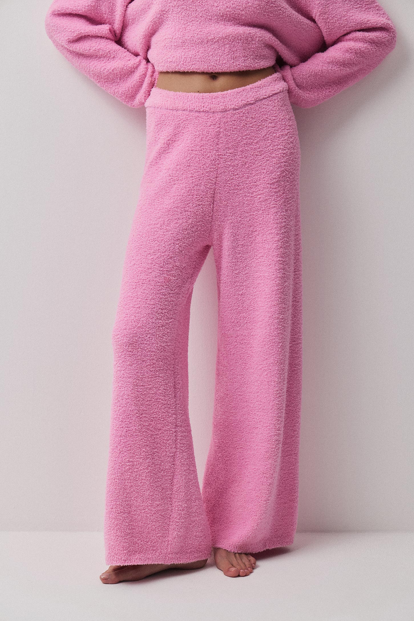 Пижамные брюки из вязаного буклированного трикотажа, прямого силуэта с удобной широкой резинкой по талии. Прямой силуэт и мягкий фактурный трикотаж обеспечивают комфорт и свободу движений. Широкая резинка на талии надежно держит посадку и делает брюки удобными для сна и отдыха.