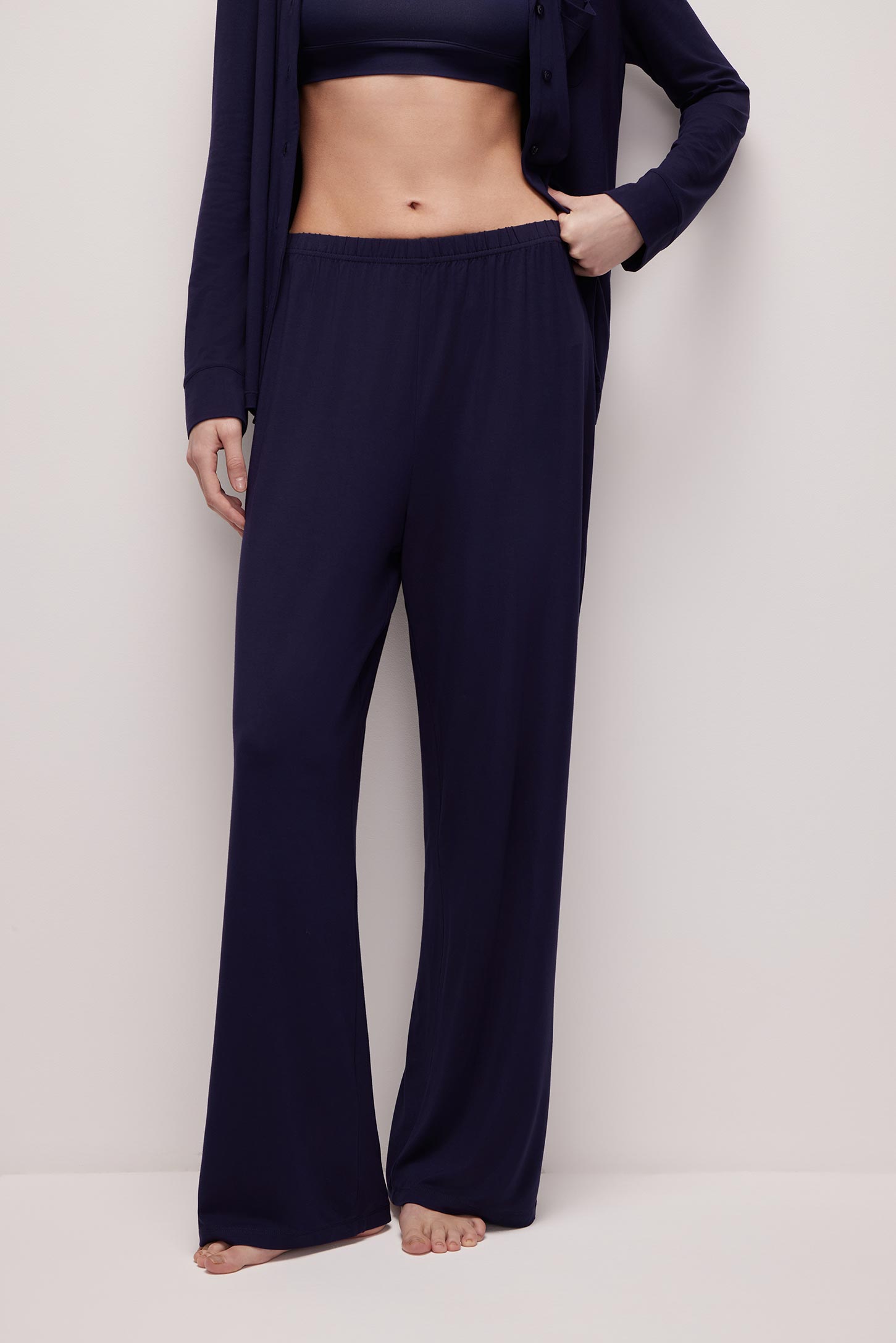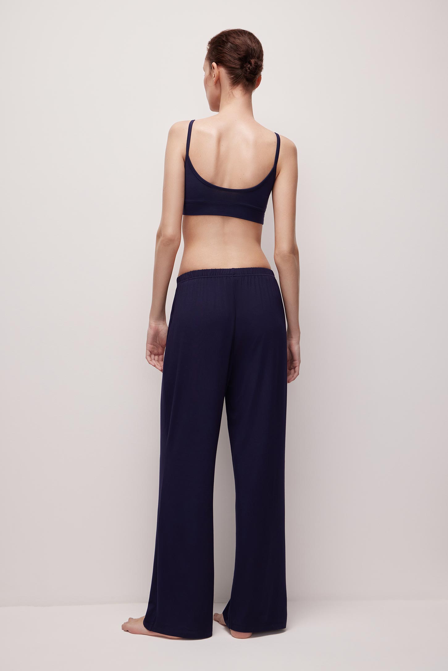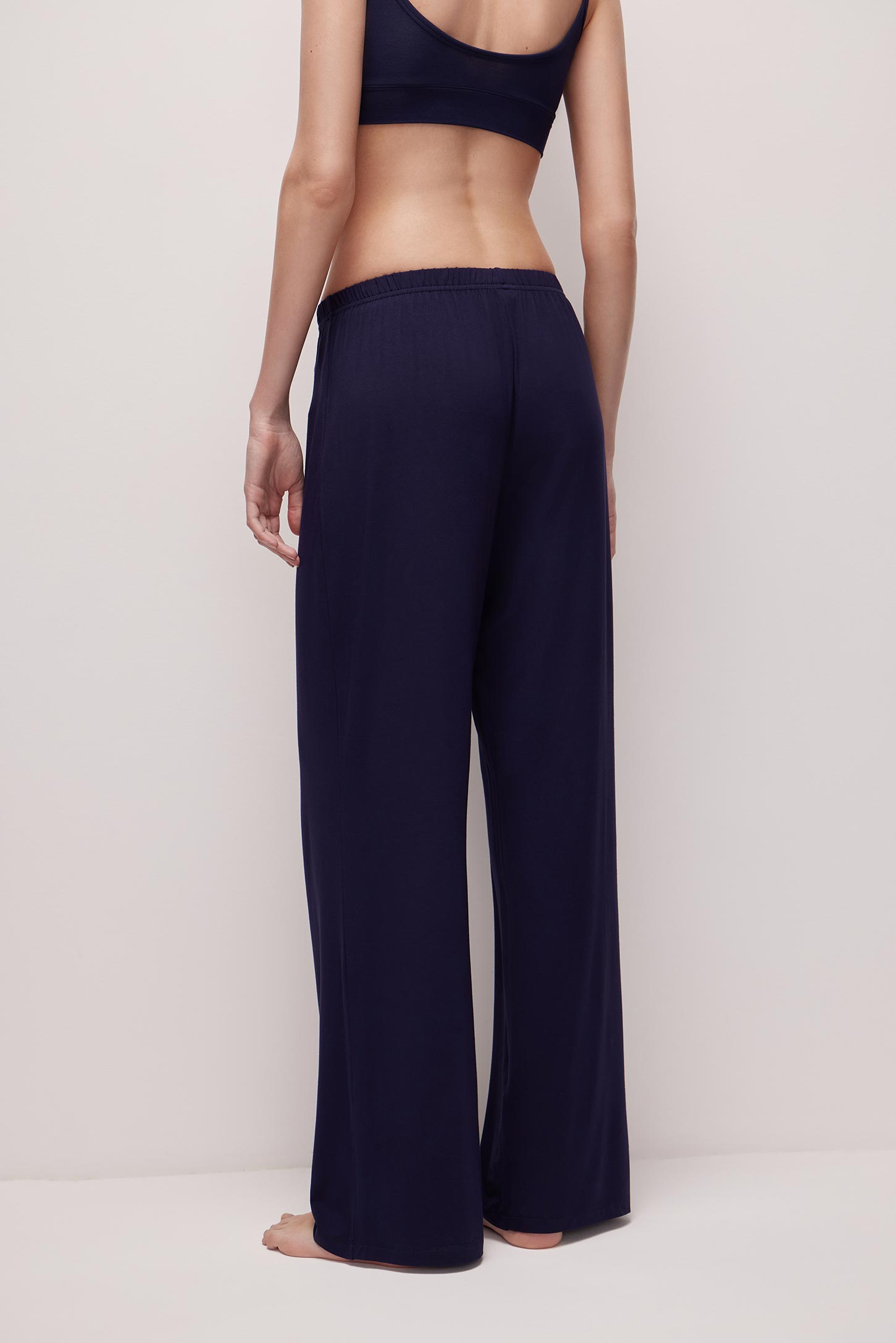 Свободные брюки изготовлены из шелковистого бамбукового трикотажа. Пояс с мягкой резинкой обеспечивает комфортную посадку изделия. Лаконичная модель идеальна для создания повседневных и домашних образов.