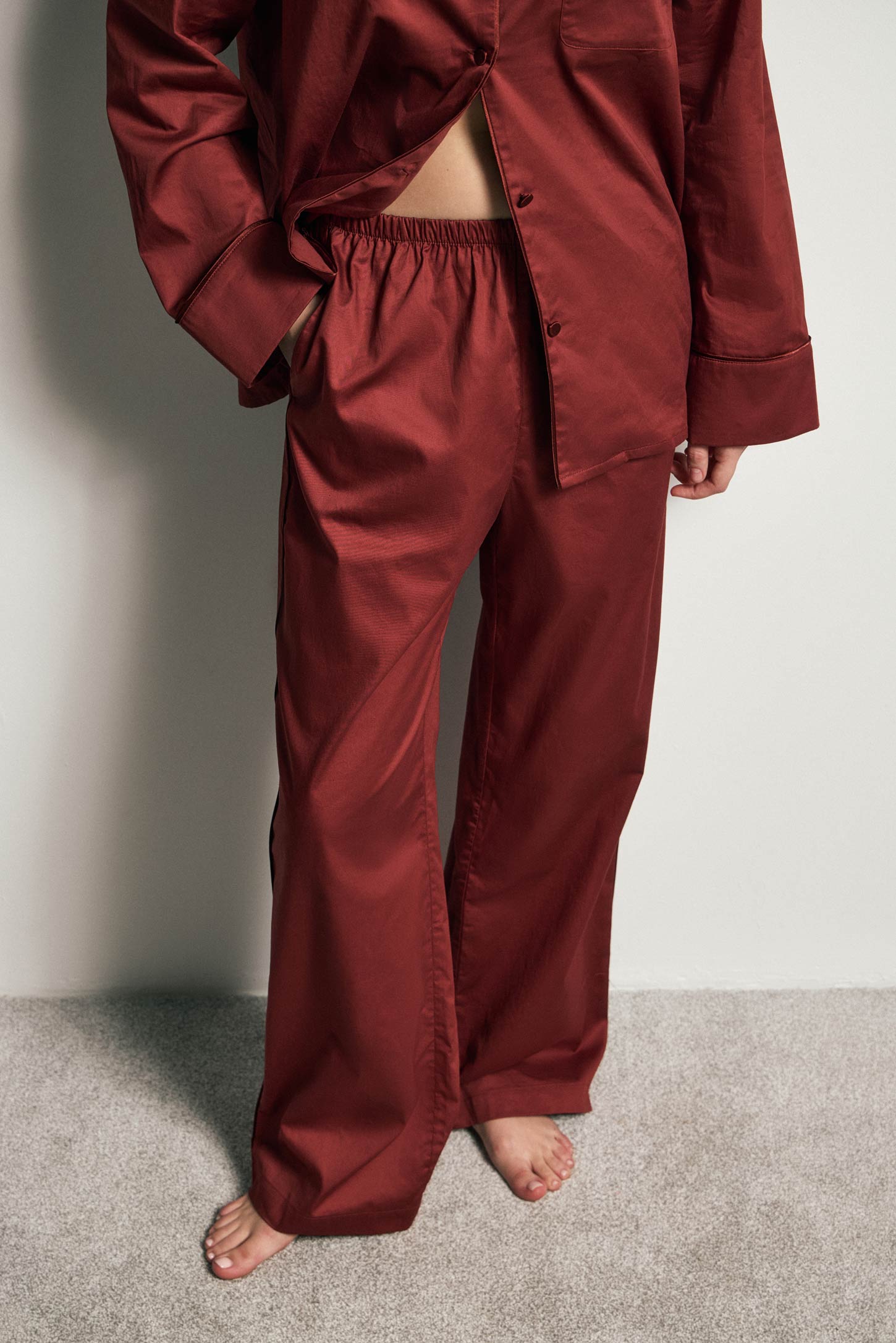 Пижамные брюки прямого силуэта с посадкой на линии талии. Пояс на мягкой резинке обеспечивает комфортную посадку изделия на разные типы фигур. Модель разработана с карманами в боковых швах. Брюки декорированы контрастным кантом по боковым швам.