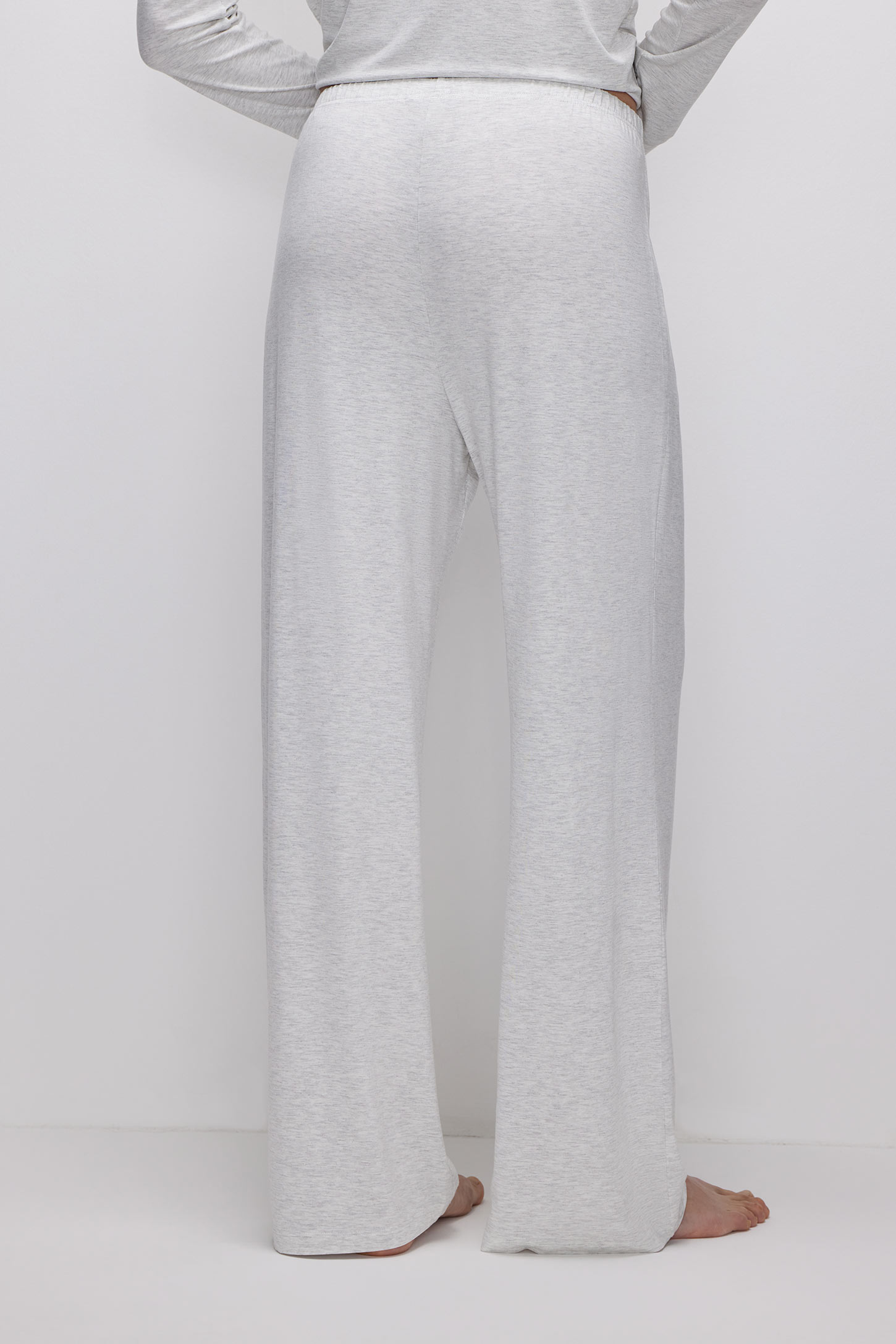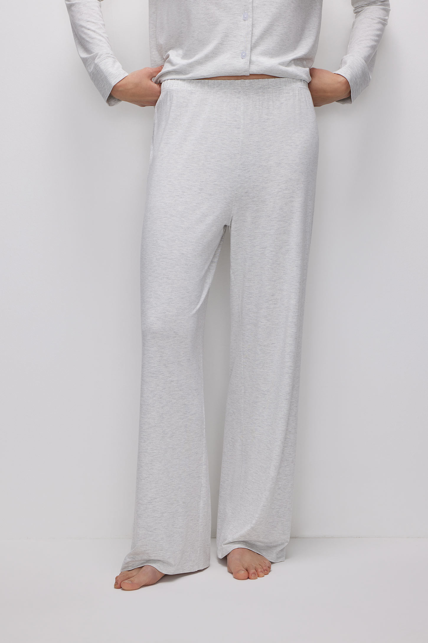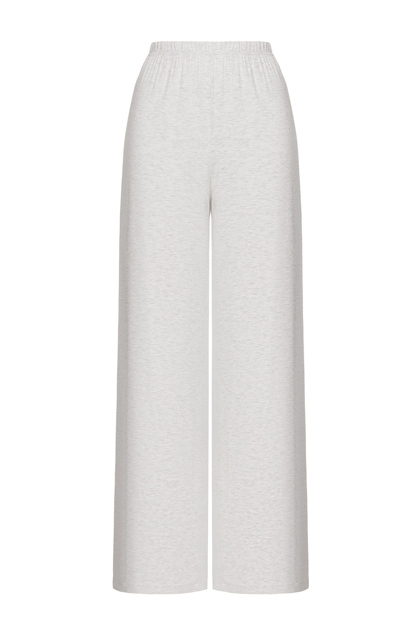 Свободные брюки изготовлены из шелковистого бамбукового трикотажа. Пояс с мягкой резинкой обеспечивает комфортную посадку изделия. Лаконичная модель идеальна для создания повседневных и домашних образов.