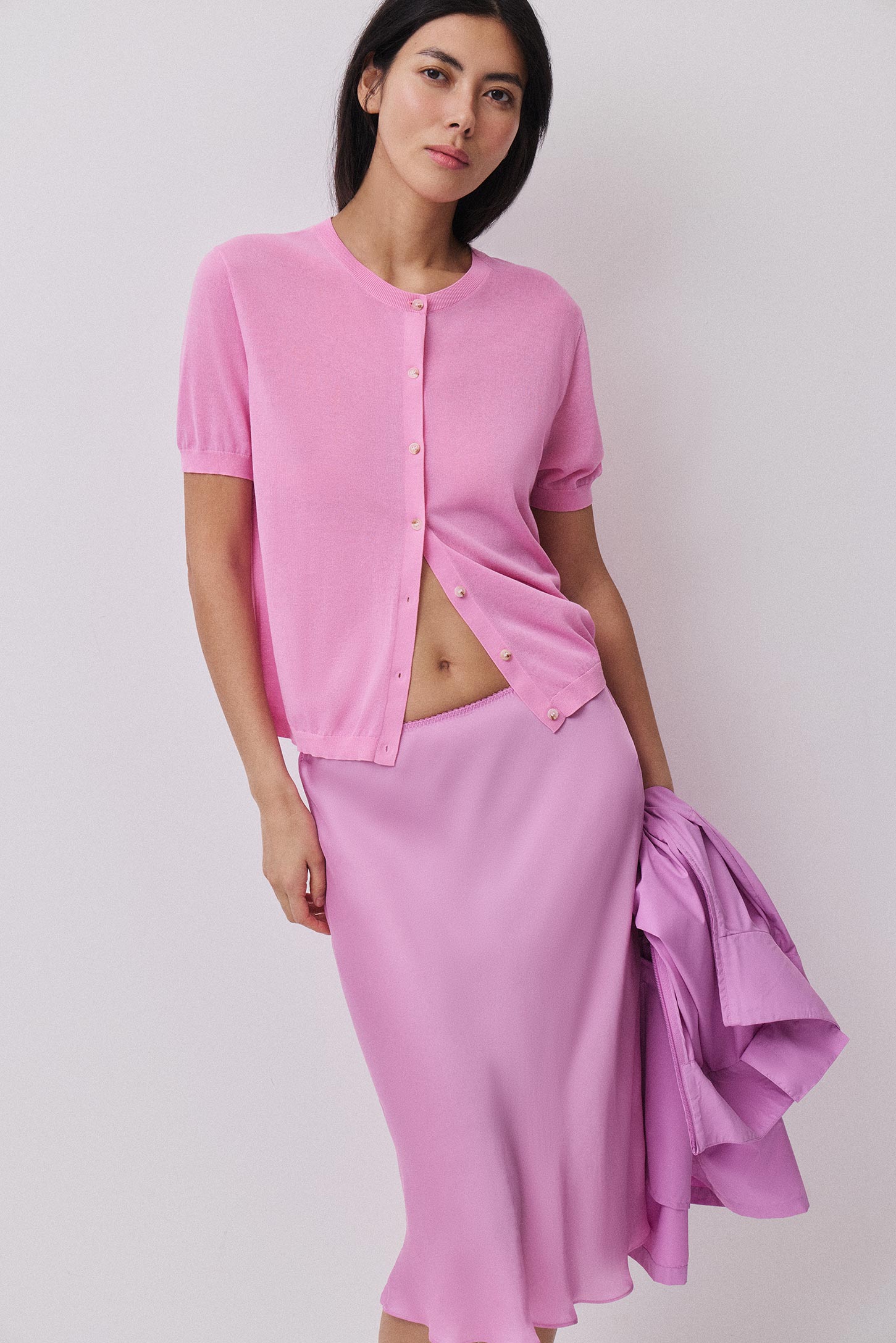 Кардиган с коротким рукавом из тонкого вязаного трикотажа с шелком в составе. Тонкое вывязанное полотно придает изделию полупрозрачный вид. Застежка спереди на роговые пуговицы. Кардиган идеален в сочетании с юбкой.