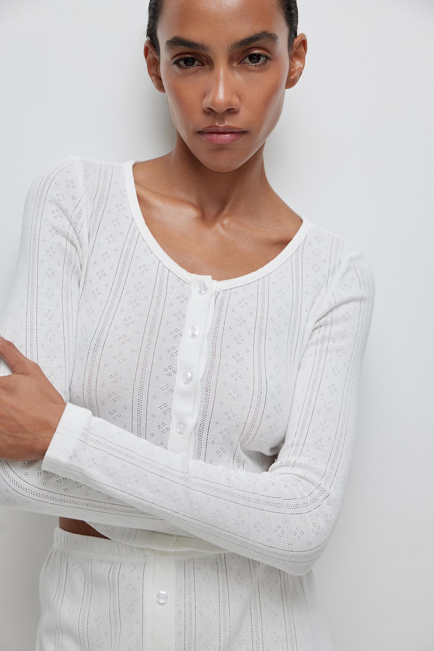 Укороченный кардиган изготовлен из мягкого 100% хлопка "пуантель" с мельчайшим геометрическим узором, напоминающим кружево. Силуэт модели облегающий, длинный втачной рукав , округлый вырез горловины и застежка с планкой на пуговицах. Кардиган идеально подходит для расслабленных домашних образов.