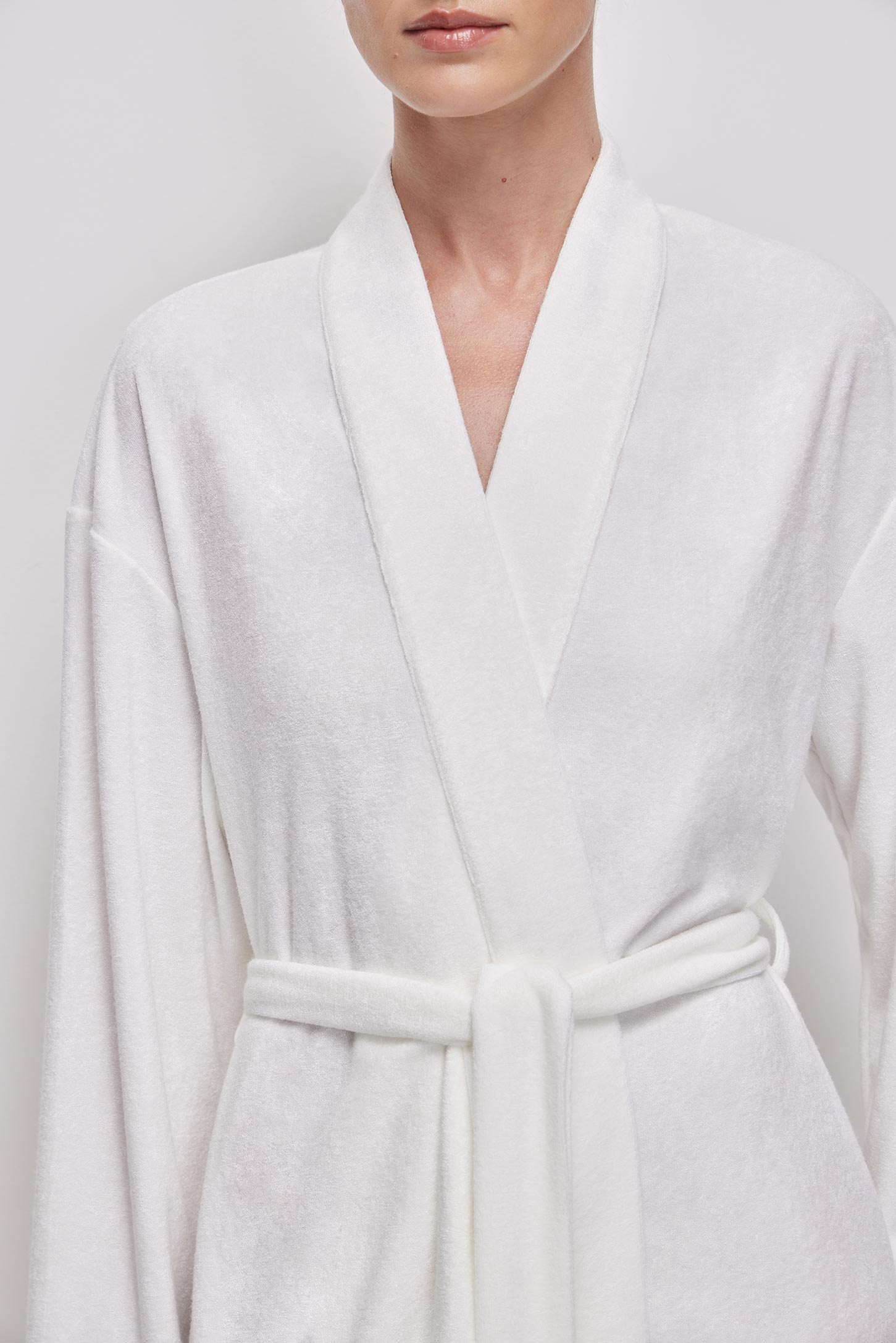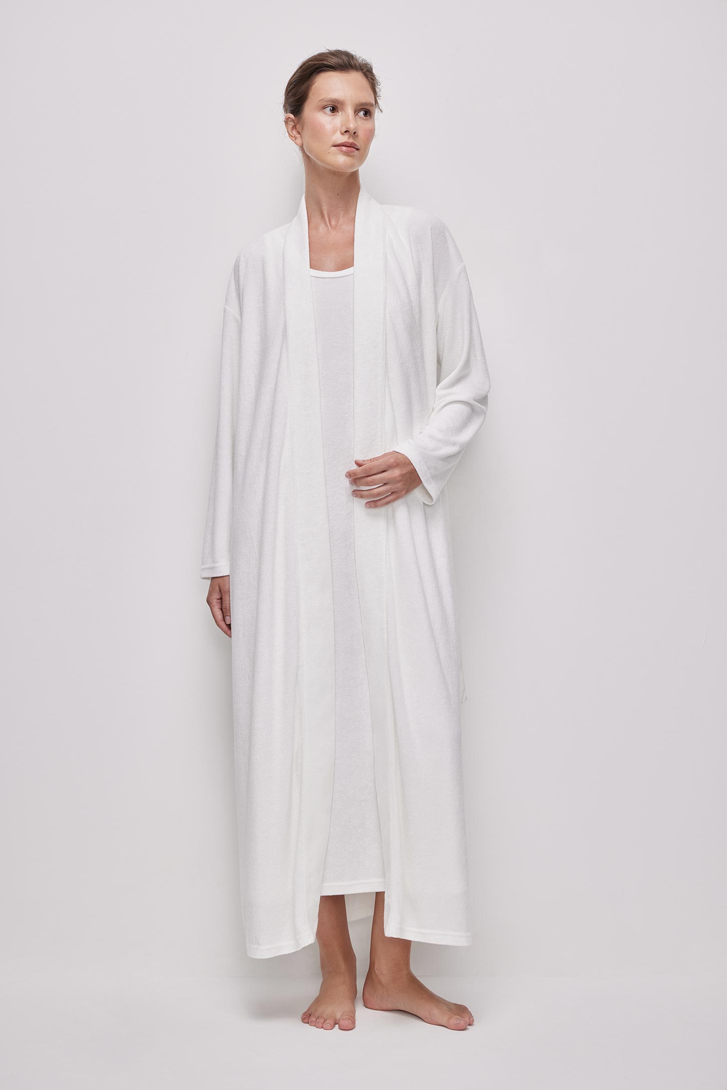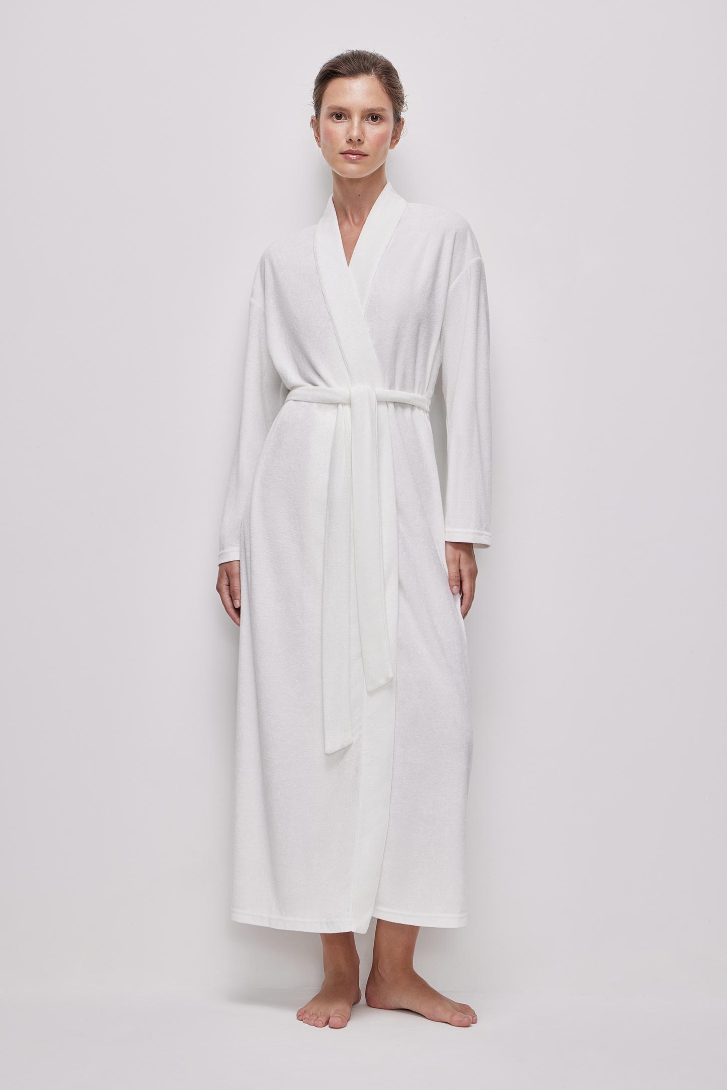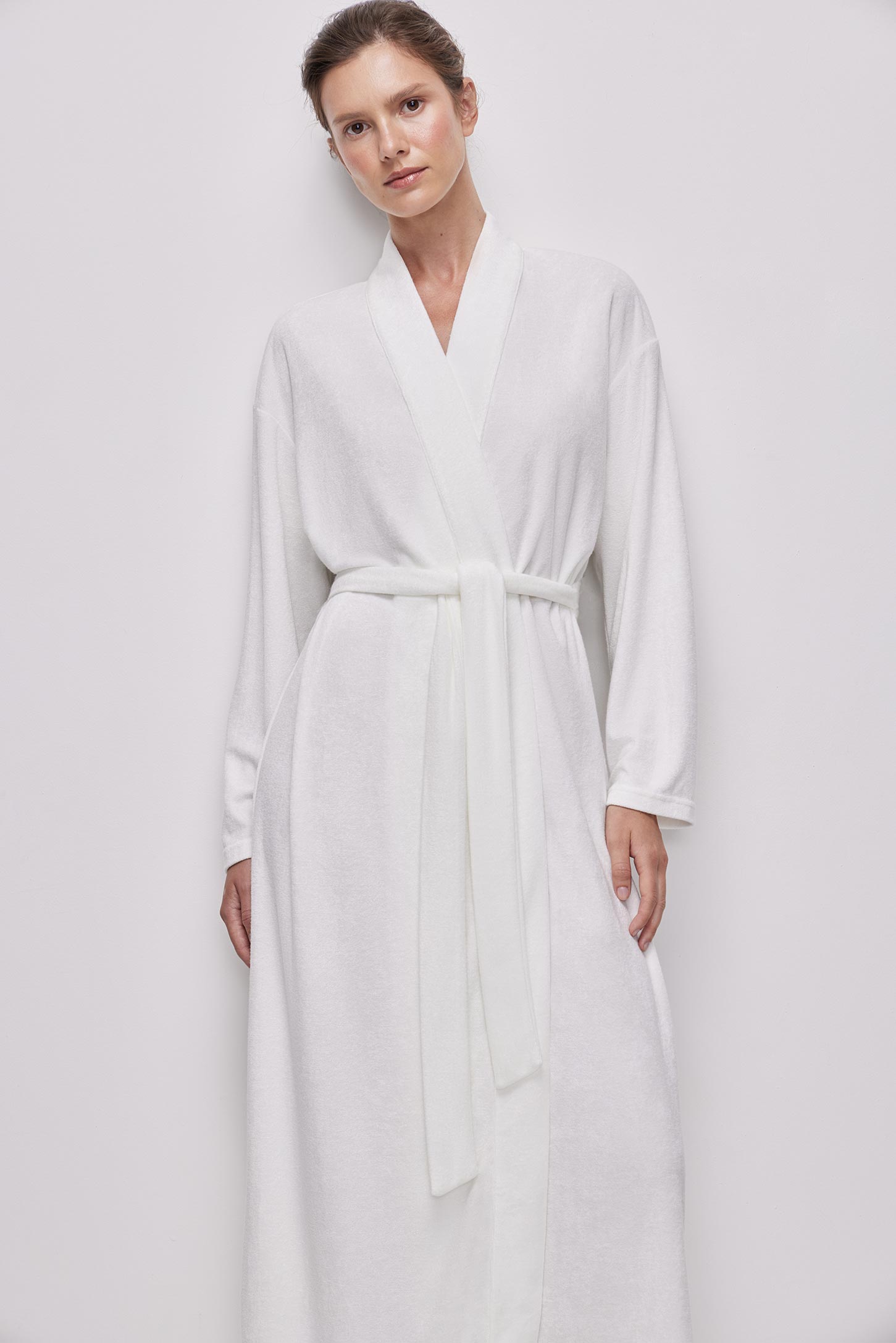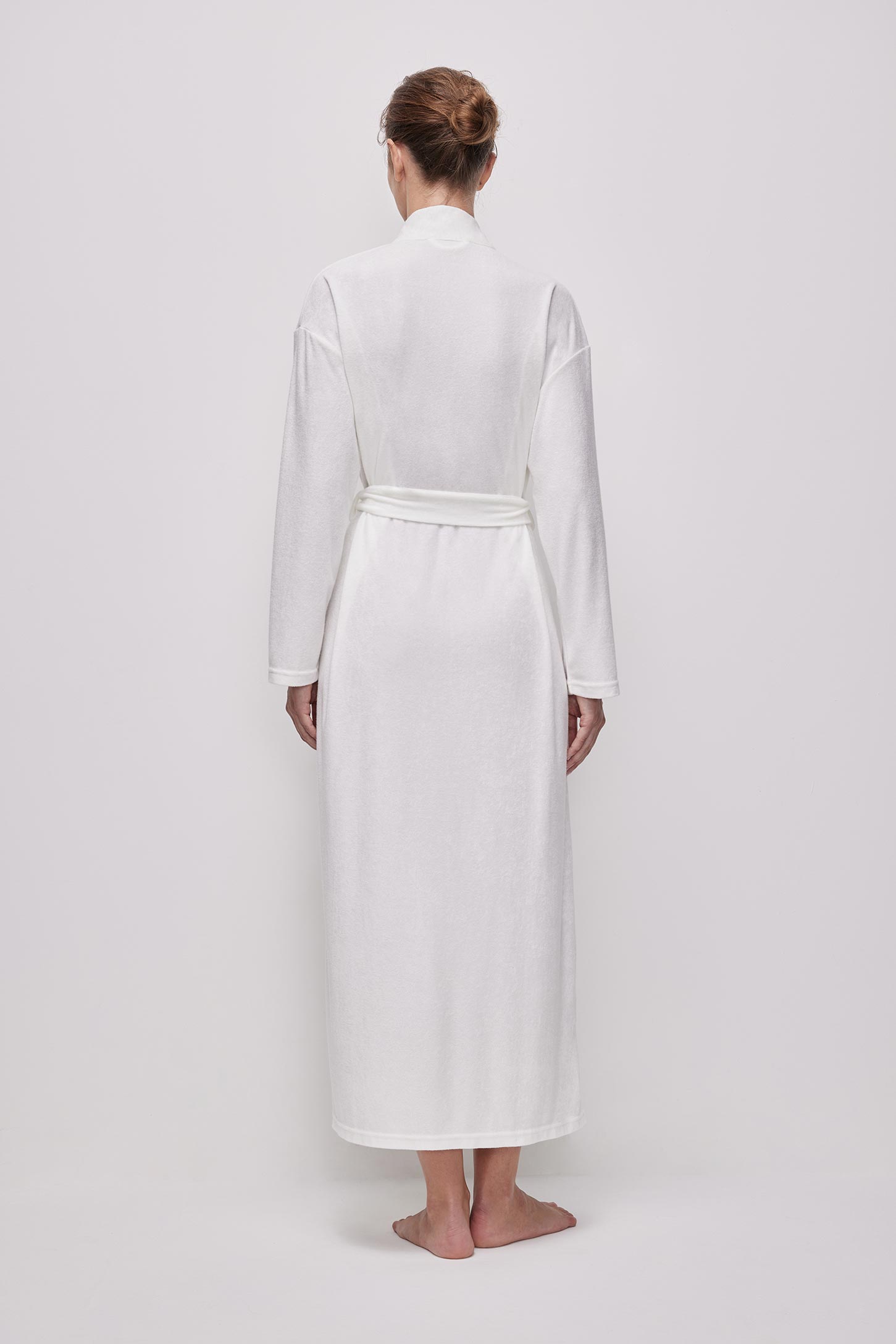 Халат длины макси из тонкой махры приятной на ощупь. Съёмный пояс из основной ткани позволяет регулировать посадку по талии. В боковых швах расположены шлевки, удерживающие пояс на месте и предотвращающие его смещение. Горловина и борта оформлены аккуратной планкой, придающей изделию завершенный вид. Изделие без карманов.