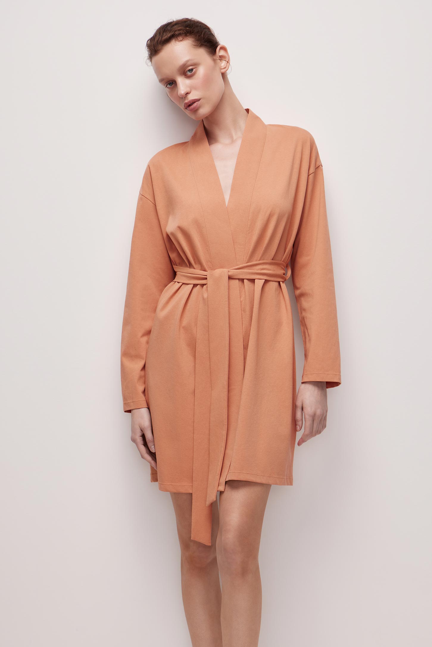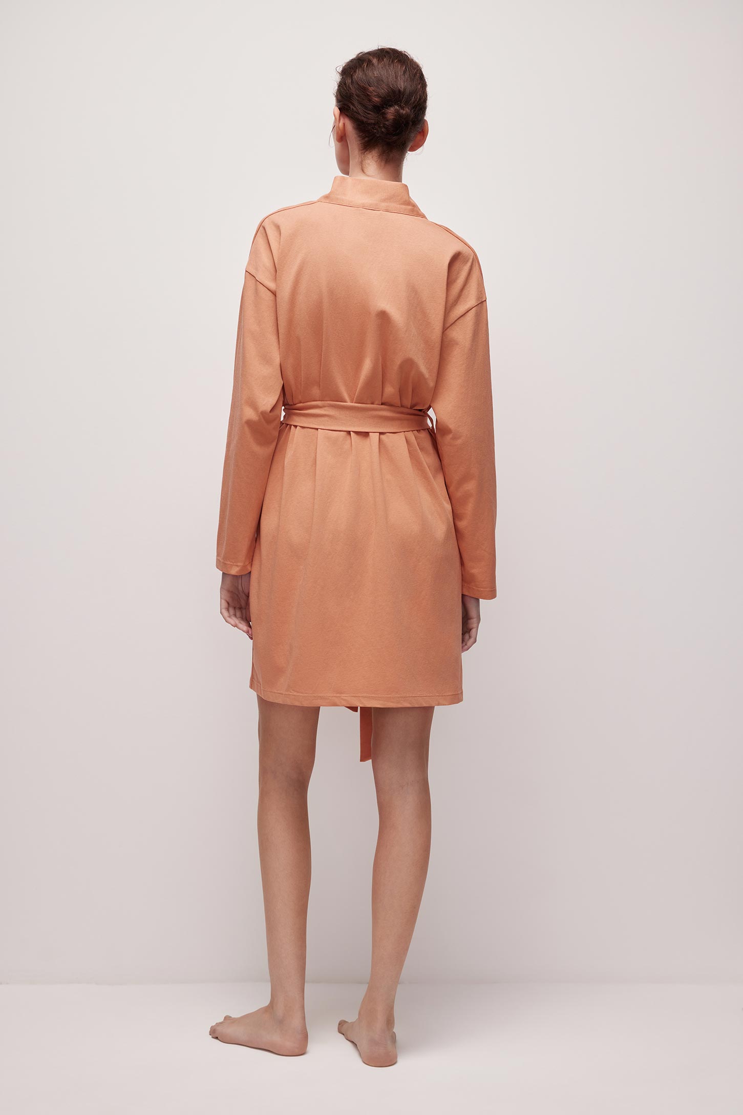 Халат укороченной длины выполнен из мягкого хлопкового трикотажа, обеспечивающего комфорт и лёгкость. Съёмный пояс из основной ткани позволяет регулировать посадку по талии. Горловина и борта оформлены аккуратной планкой, придающей изделию завершенный вид. В боковых швах расположены шлёвки, удерживающие пояс на месте и предотвращающие его смещение.