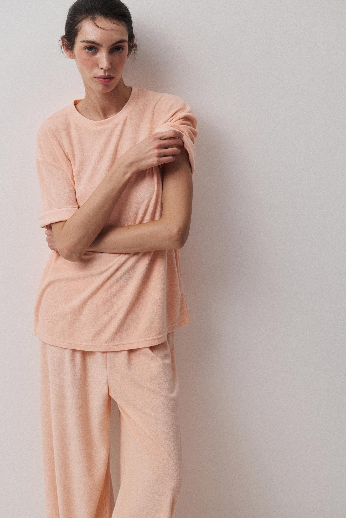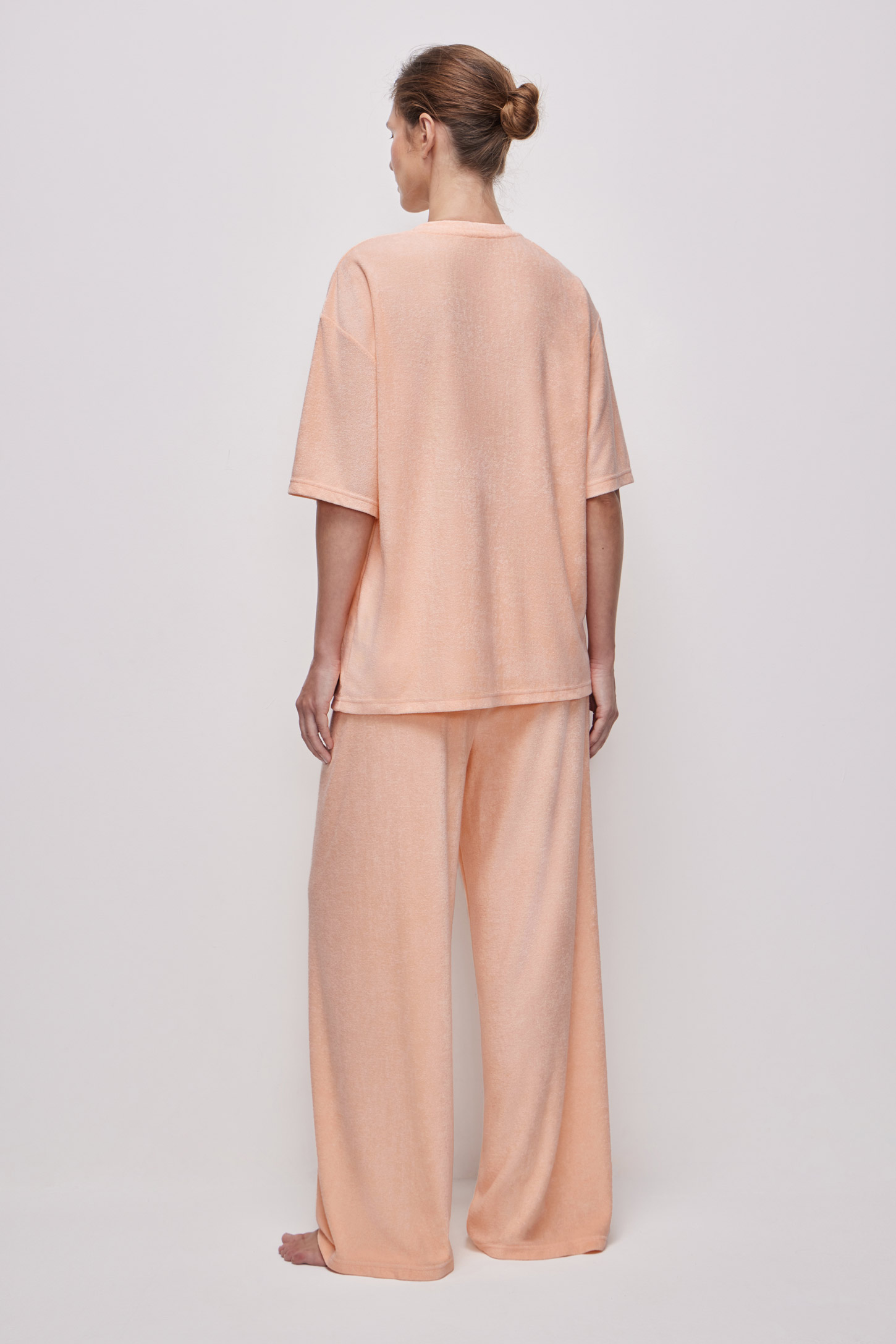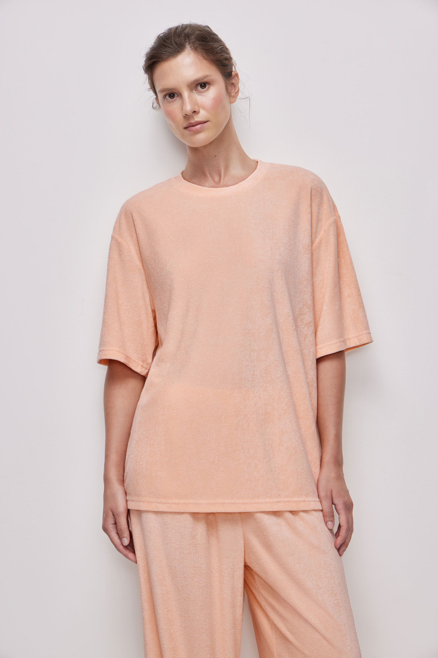 Пижамная футболка прямого силуэта из тонкой махры, приятной на ощупь. Расслабленный силуэт не сковывает движения, подходит для разных типов фигуры и обеспечивает свободу и удобство. Модель имеет круглую горловину с аккуратной обработкой сохраняет форму после стирок.