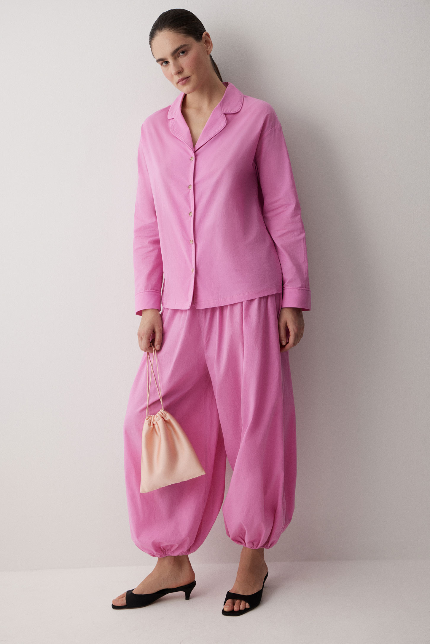Женская пижамная рубашка из тонкого хлопка-батиста с английским воротником и застёжкой на пуговицы. Акцентный кант чётко очерчивает линии и придаёт силуэту выразительность. Продуманный крой и лёгкая дышащая ткань обеспечивают удобство и свободу движений.