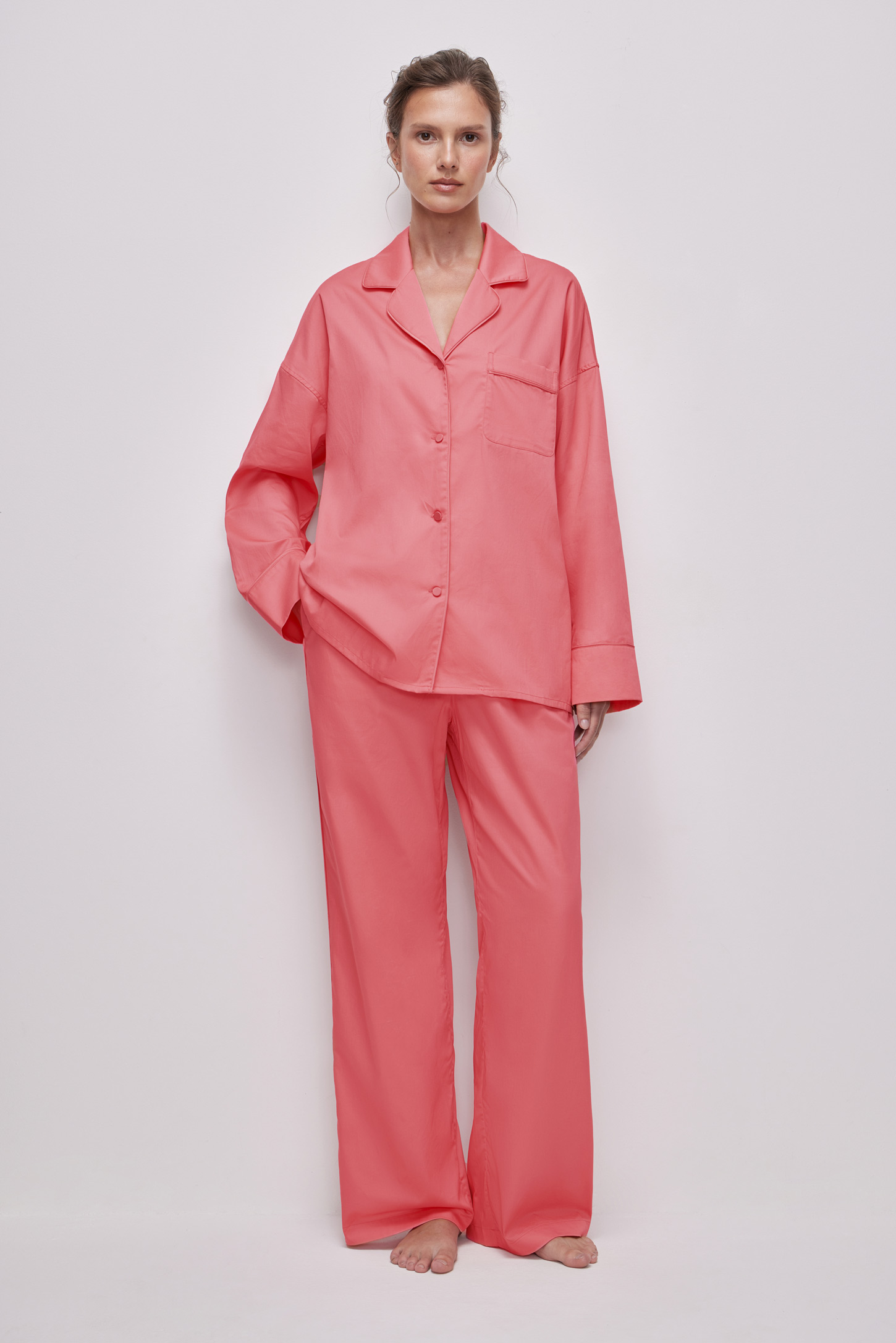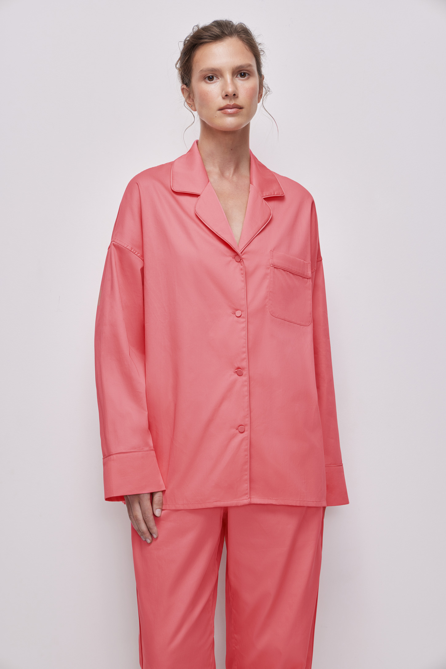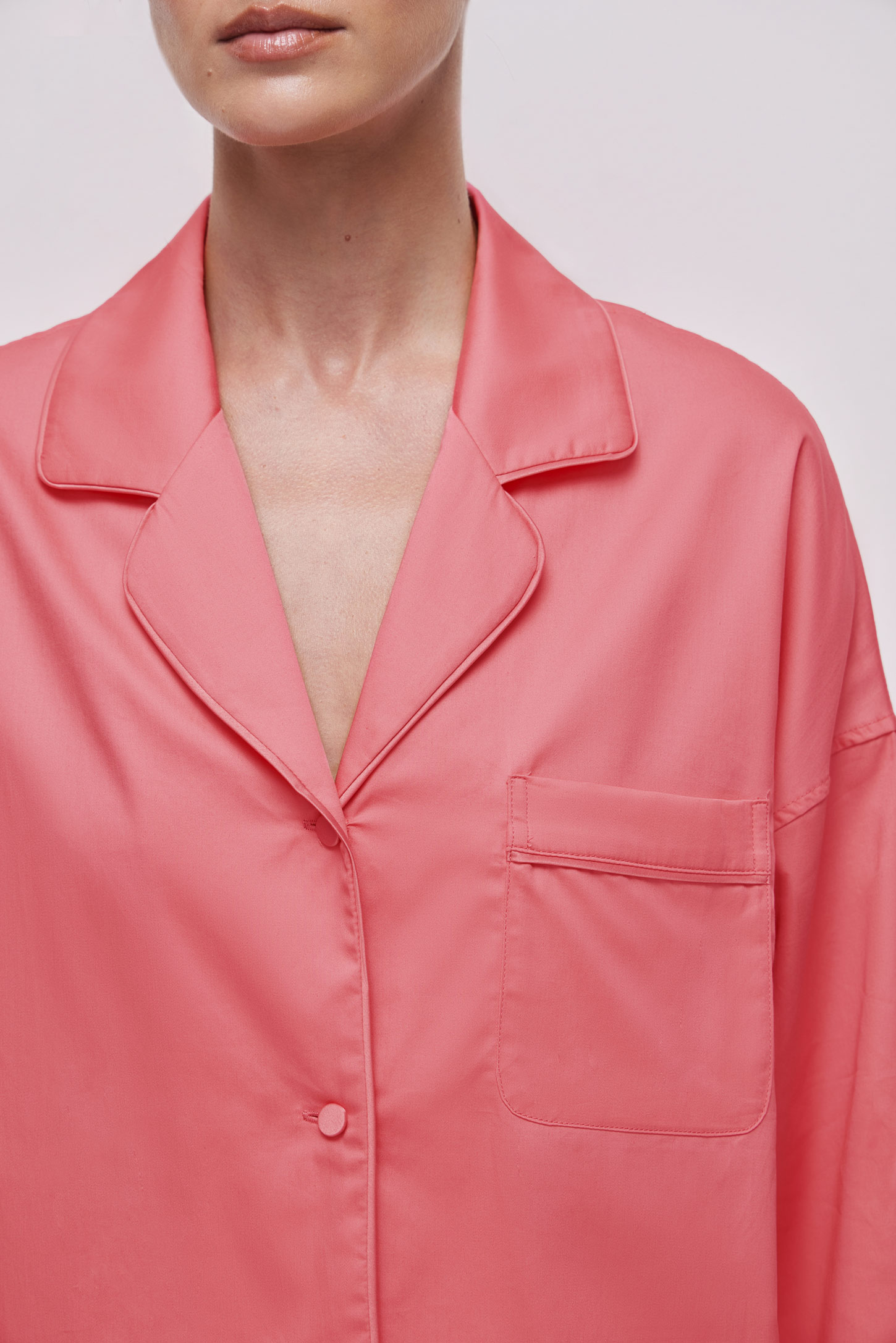 Пижамная рубашка прямого силуэта с отложным воротником. Модель разработана со спущенным плечом и длинным рукавом, имеет накладной карман. Изделие декорировано кантом в цвет основного полотна по воротнику, борту, манжетам и накладному карману.