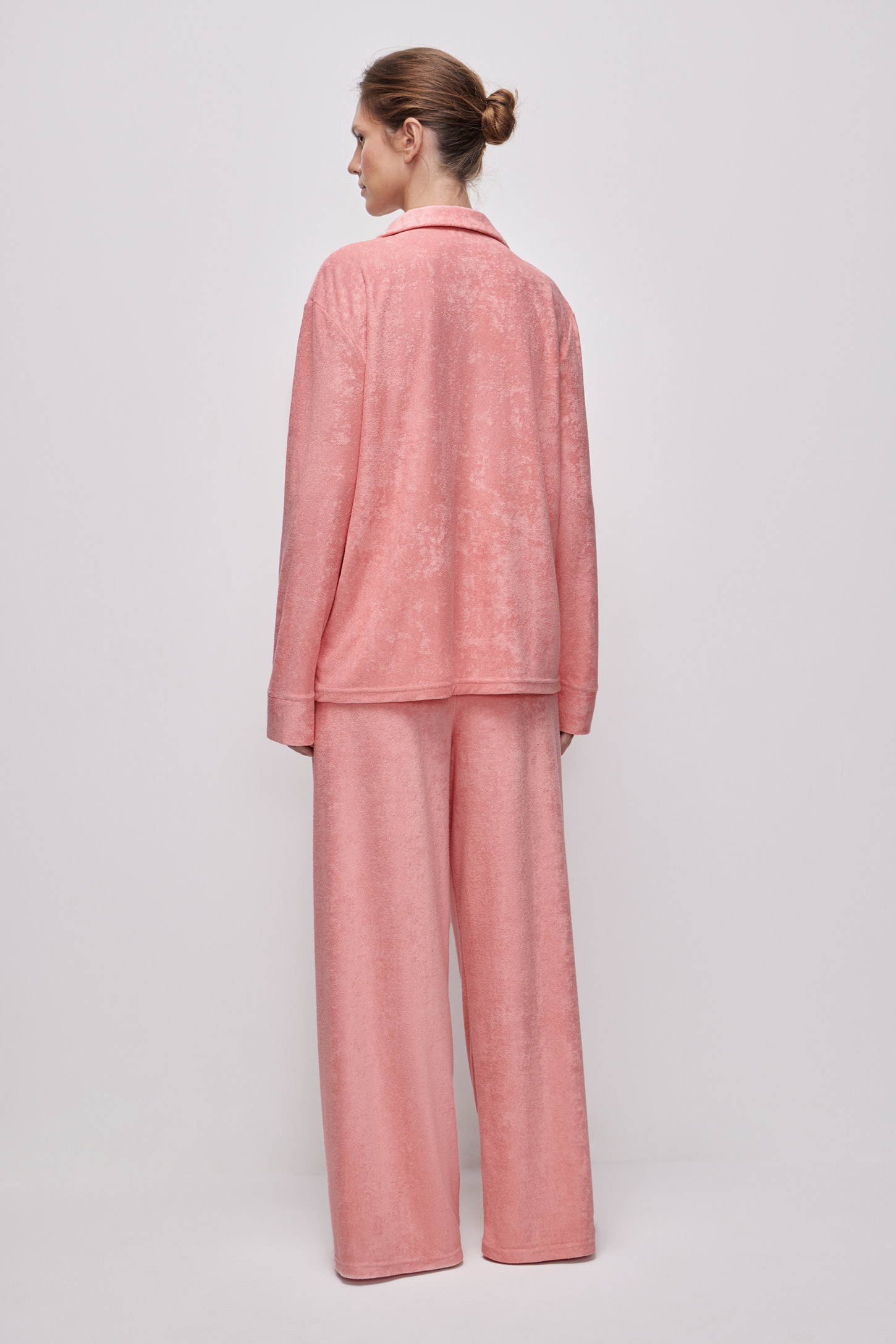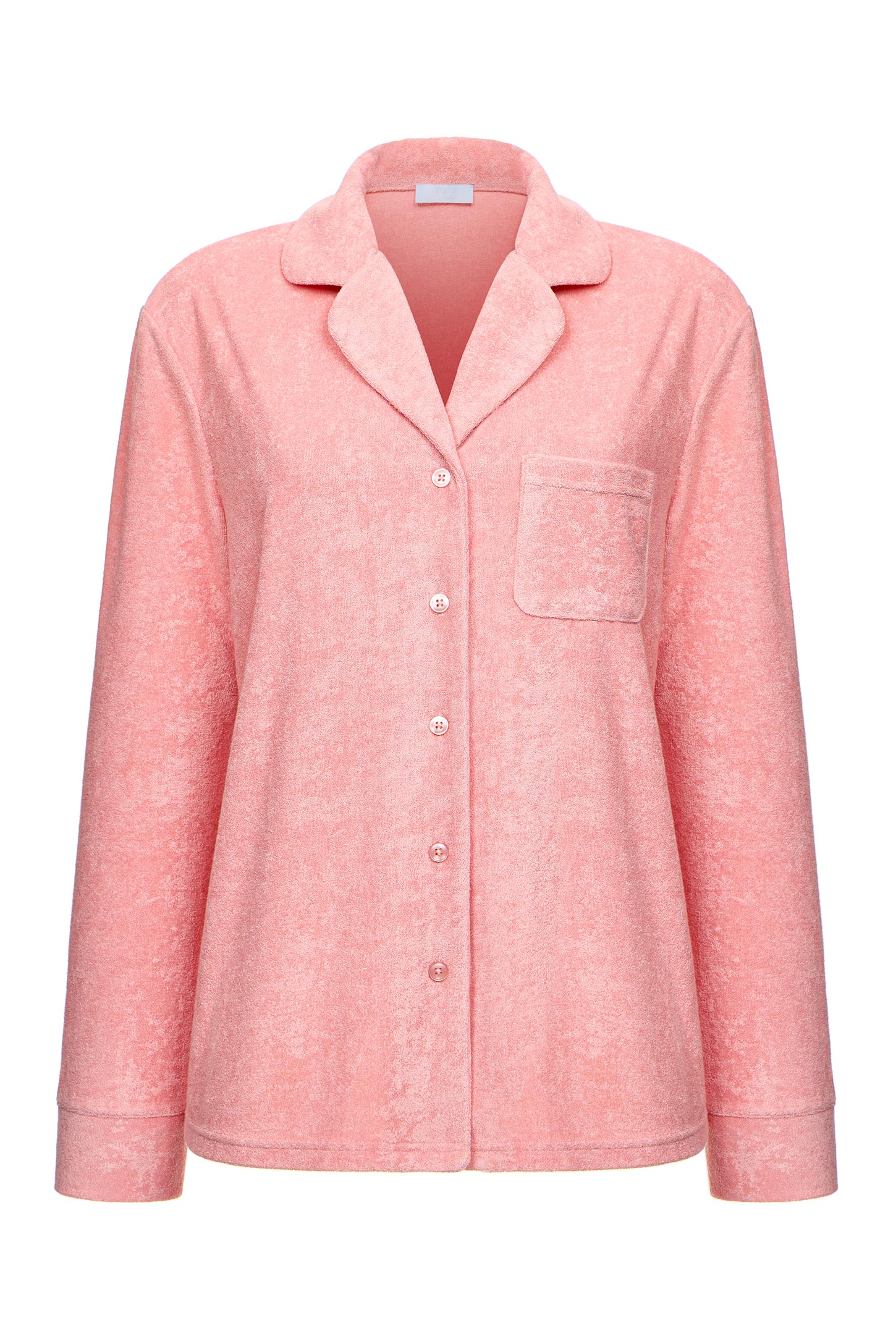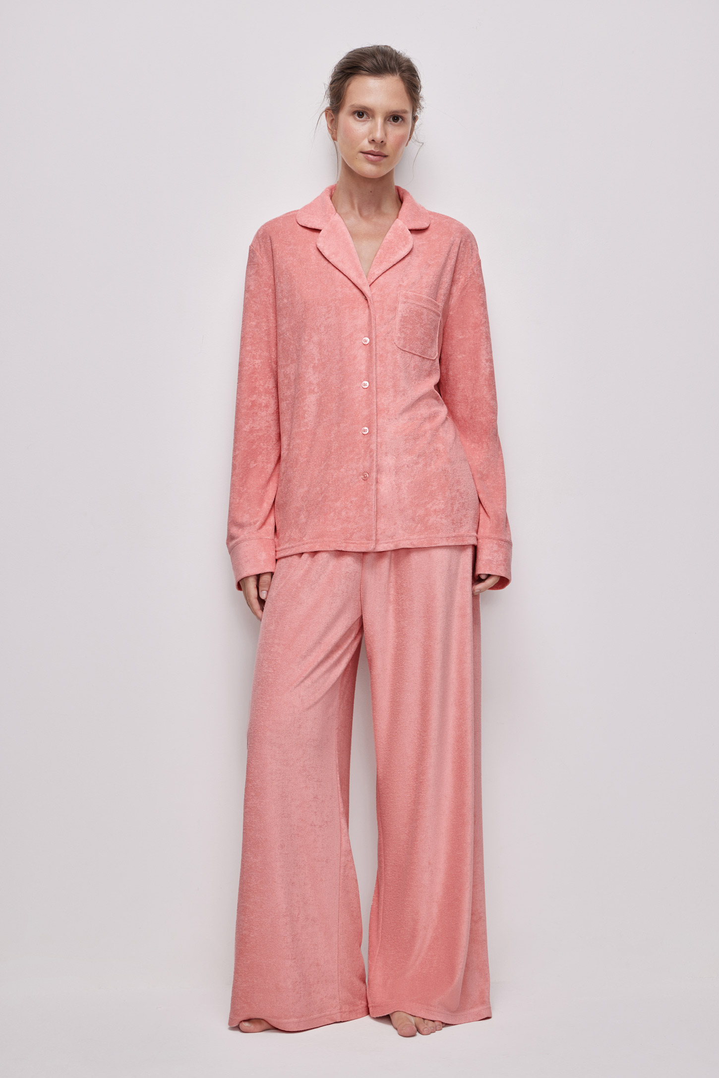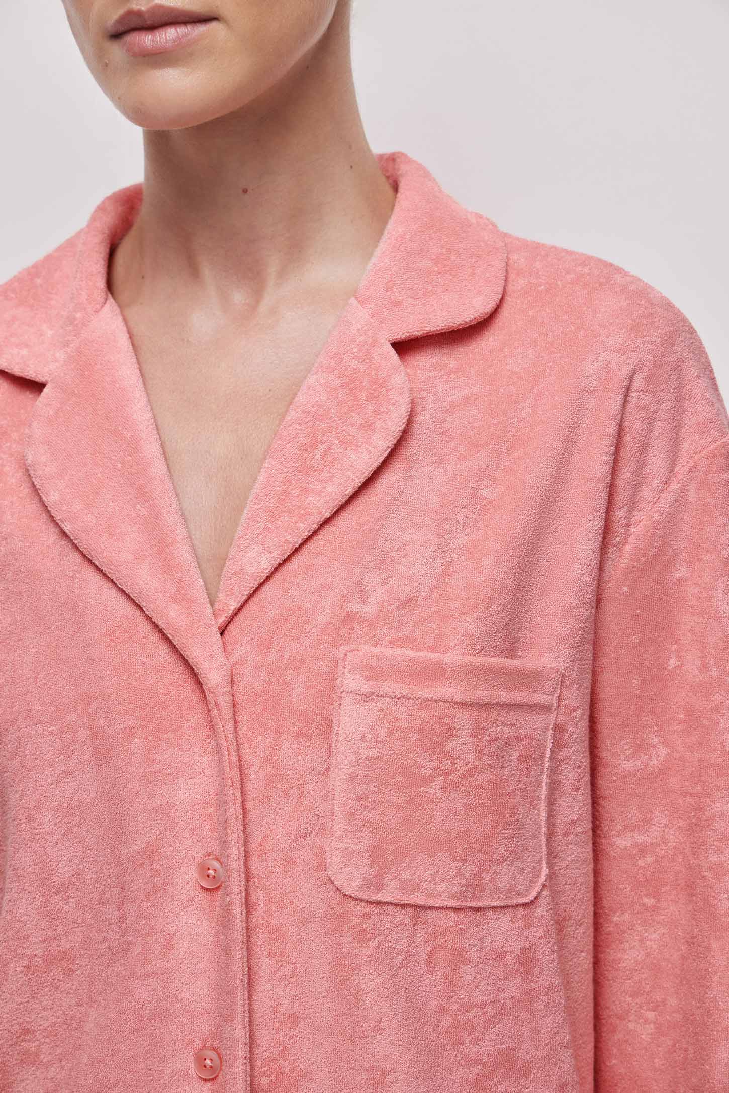 Пижамная рубашка прямого силуэта из тонкой махры приятной на ощупь. Аккуратный английский воротник подчеркивает линию лица и шеи, и придает образу утонченность. Декоративные манжеты на рукавах служат стильным акцентом рубашке. Накладной нагрудный карман дополняет дизайн и остается функциональным элементом для мелочей. Пуговицы в тон ткани создают единый лаконичный вид.