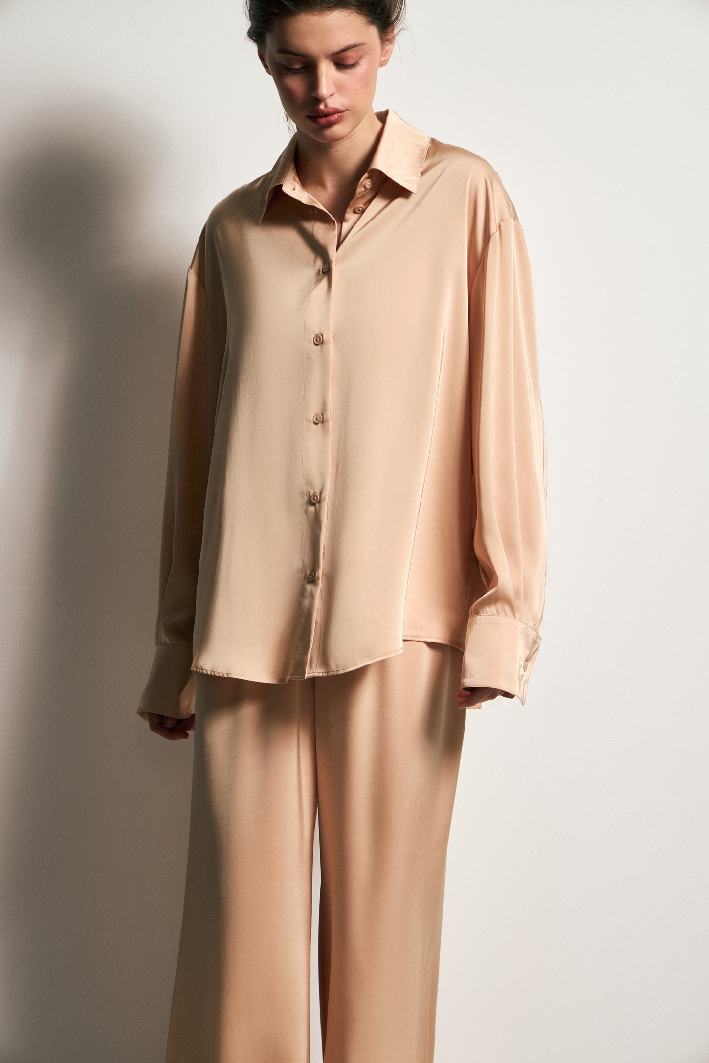 Женская пижамная рубашка прямого силуэта из тонкого сатина с классическим воротником и застёжкой на пуговицы-ракушки. Чёткие линии кроя подчёркивают силуэт, а мягкая гладкая ткань обеспечивает удобство и лёгкость движений.