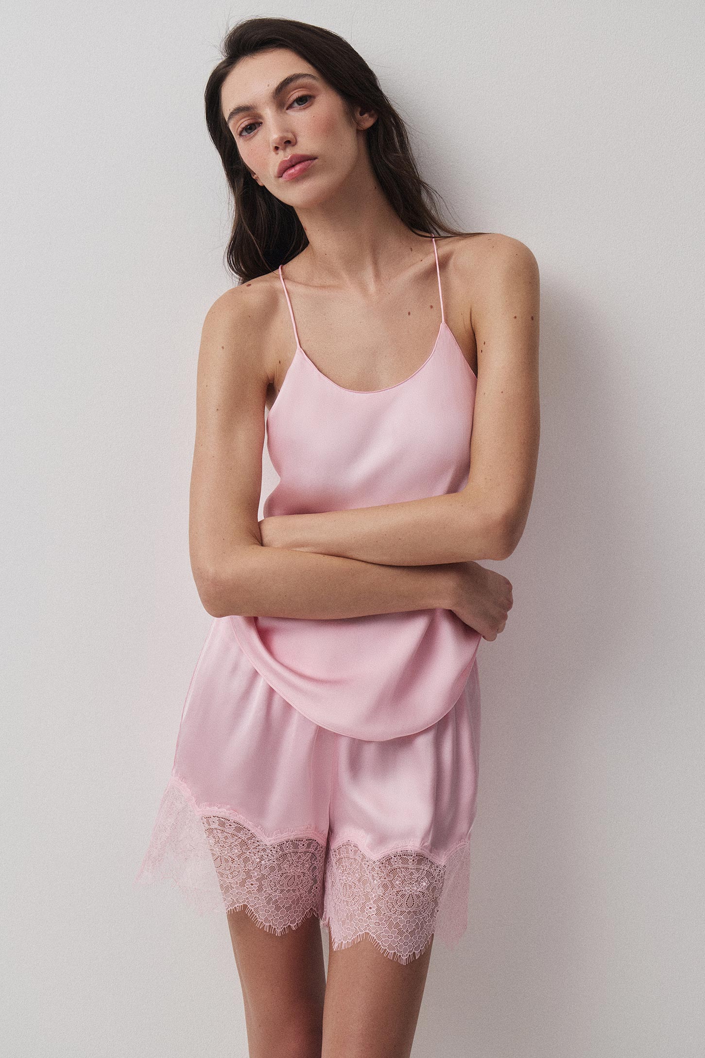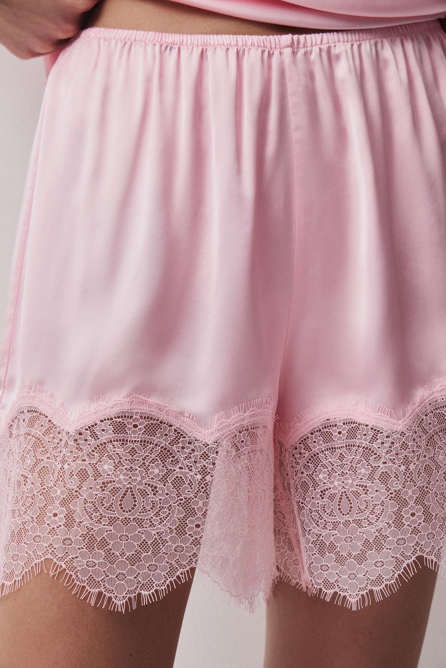 Шорты длины мини из сатиновой ткани с деликатным блеском. Тонкая резинка на талии обеспечивает комфортную посадку и аккуратный внешний вид. Низ изделия обработан широким ажурным кружевом с фестонами.