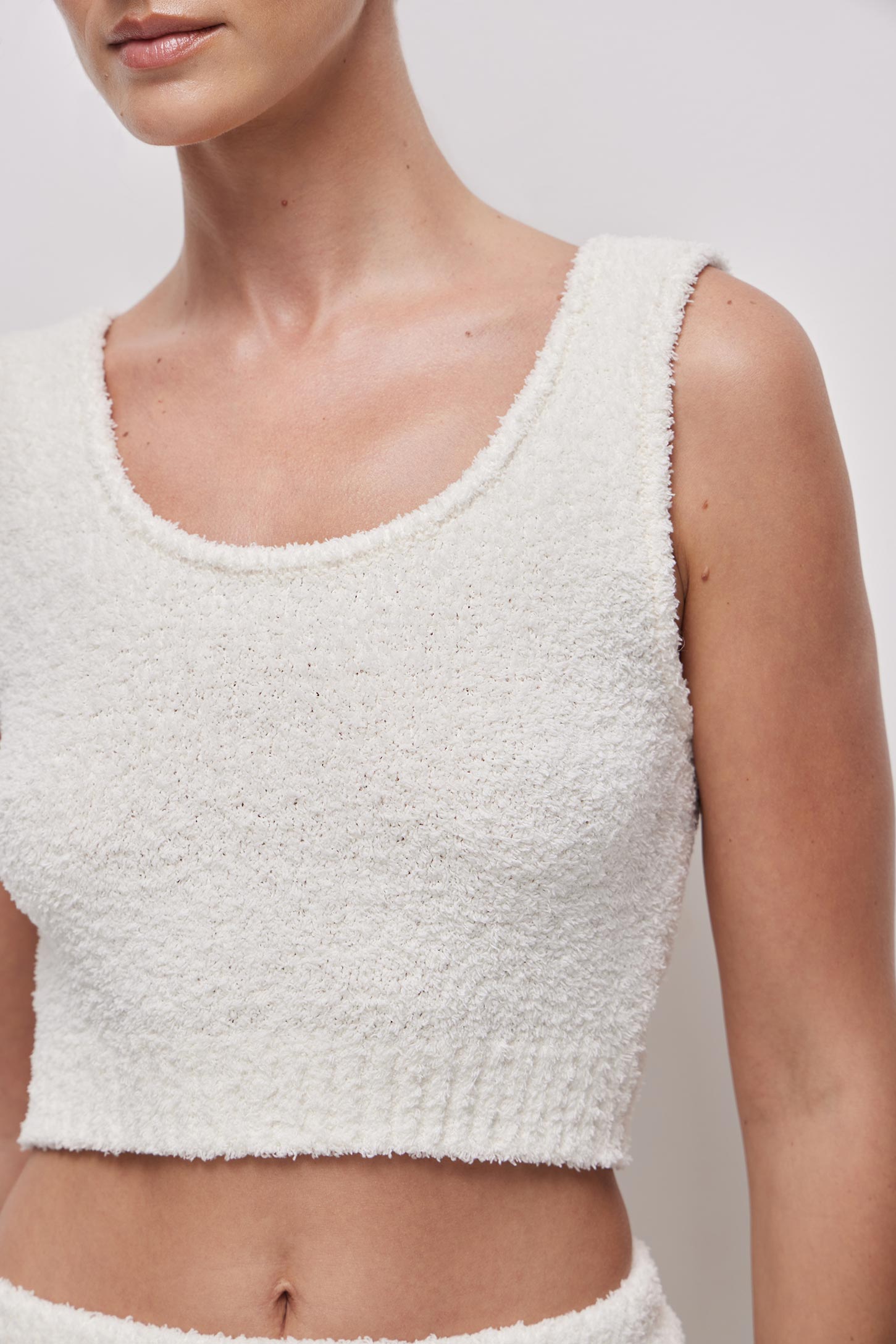 Топ на широких бретелях с круглым вырезом. Фактурный буклированный трикотаж мягко держит форму и комфортно ощущается на теле. Укороченный крой подчеркивает талию, а вырез красиво акцентирует зону декольте.