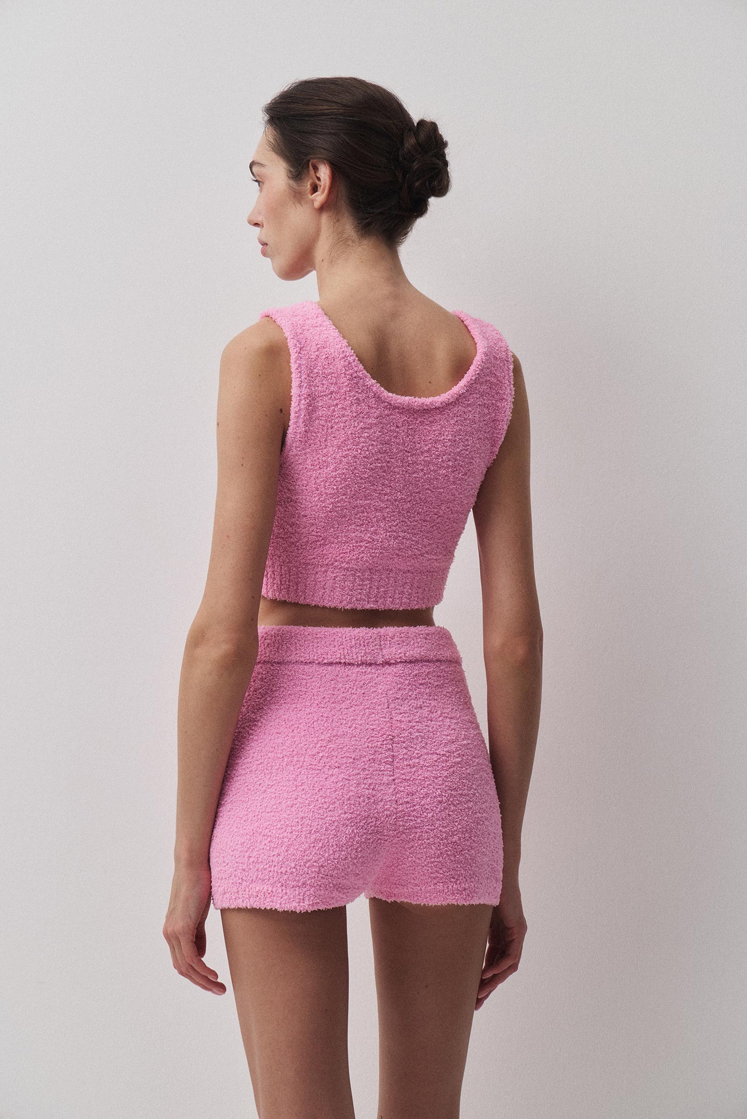Топ на широких бретелях с круглым вырезом. Фактурный буклированный трикотаж мягко держит форму и комфортно ощущается на теле. Укороченный крой подчеркивает талию, а вырез красиво акцентирует зону декольте.