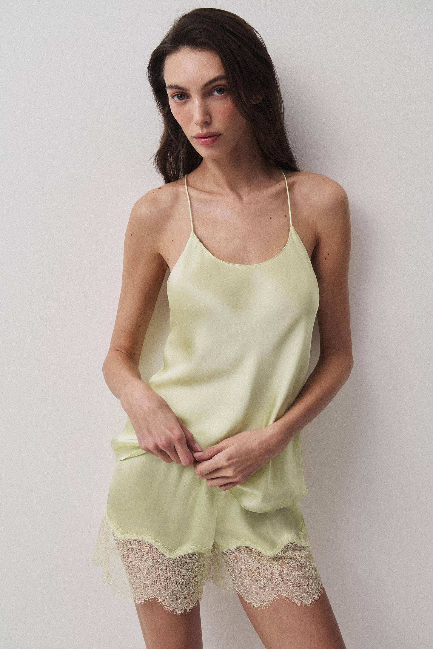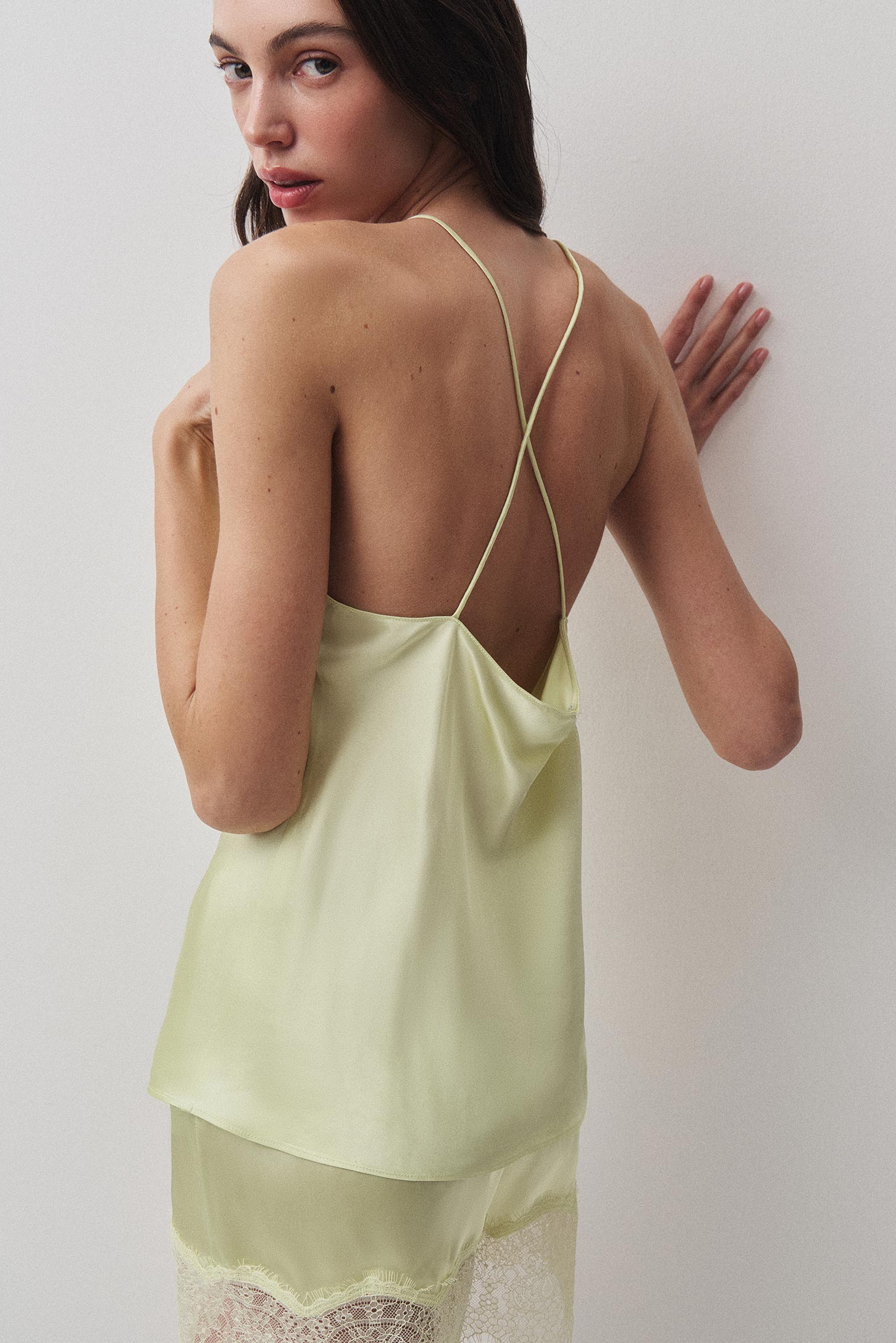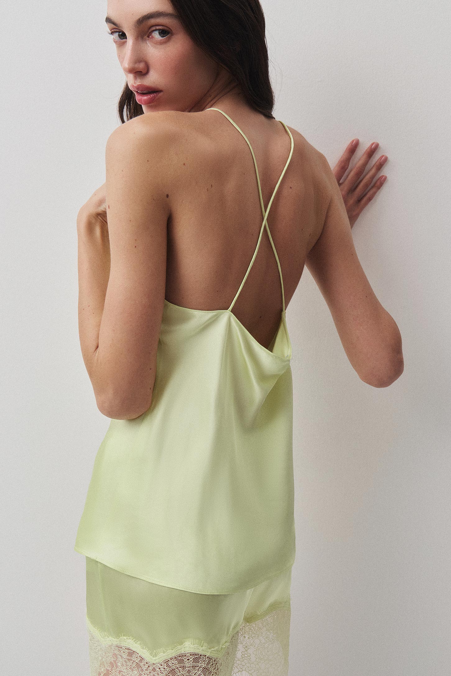 Топ на тонких бретелях, деликатного косого кроя, что обеспечивает полуприлегающий силуэт. Тонкие бретели из основной ткани подчеркивают зону делкольте. Хорошо подходит для домашних образов.