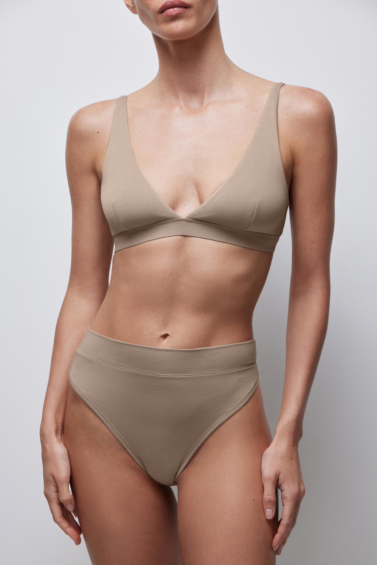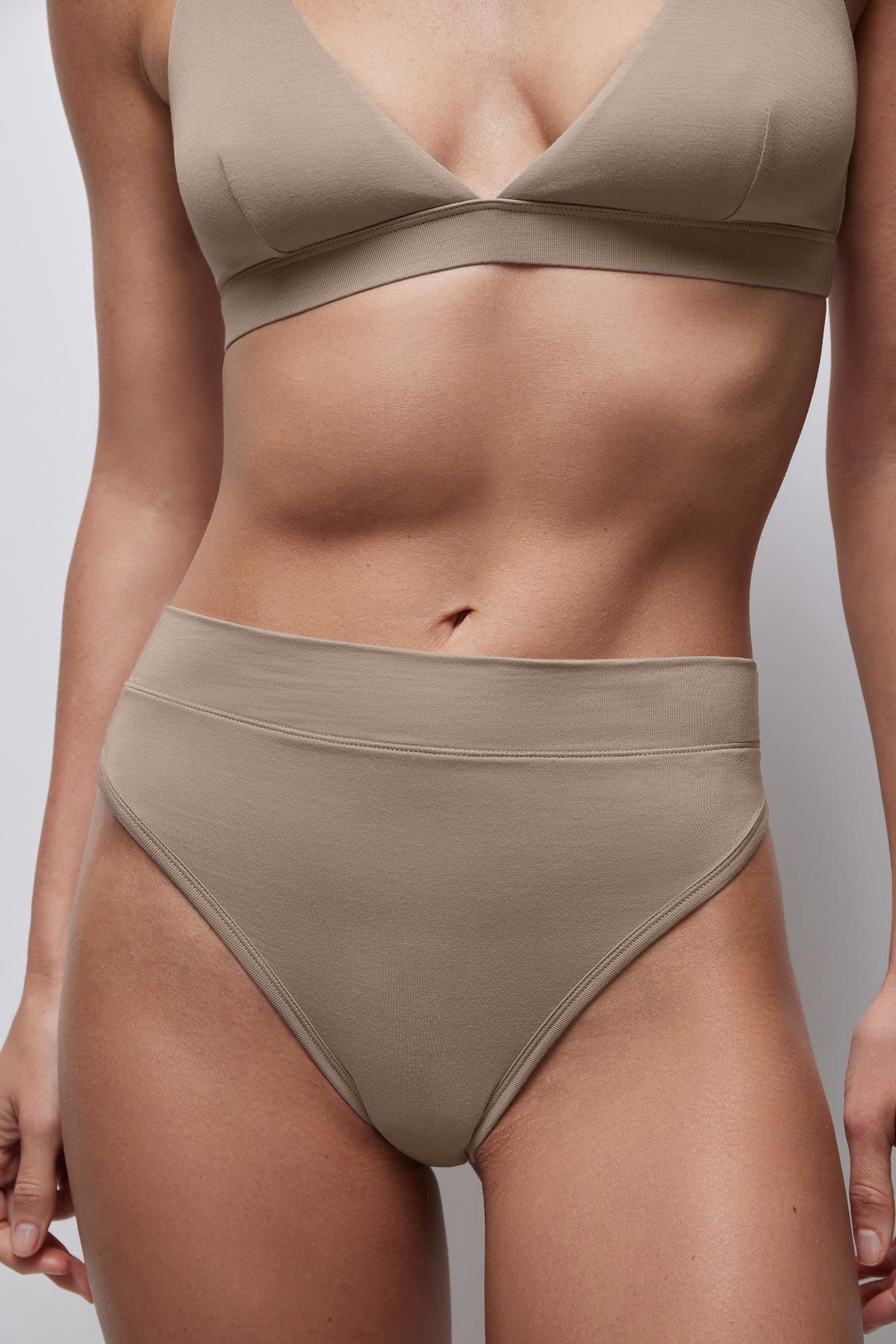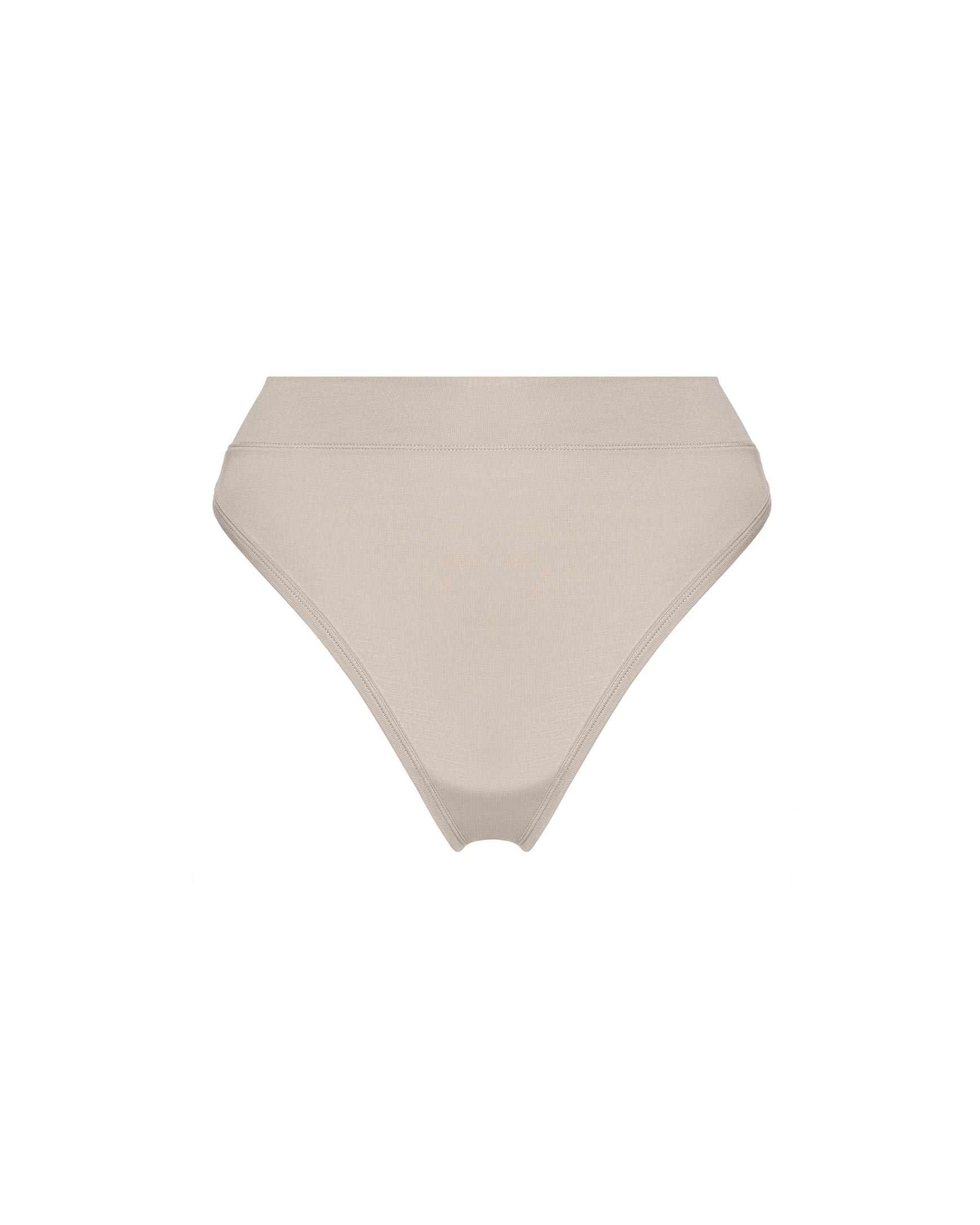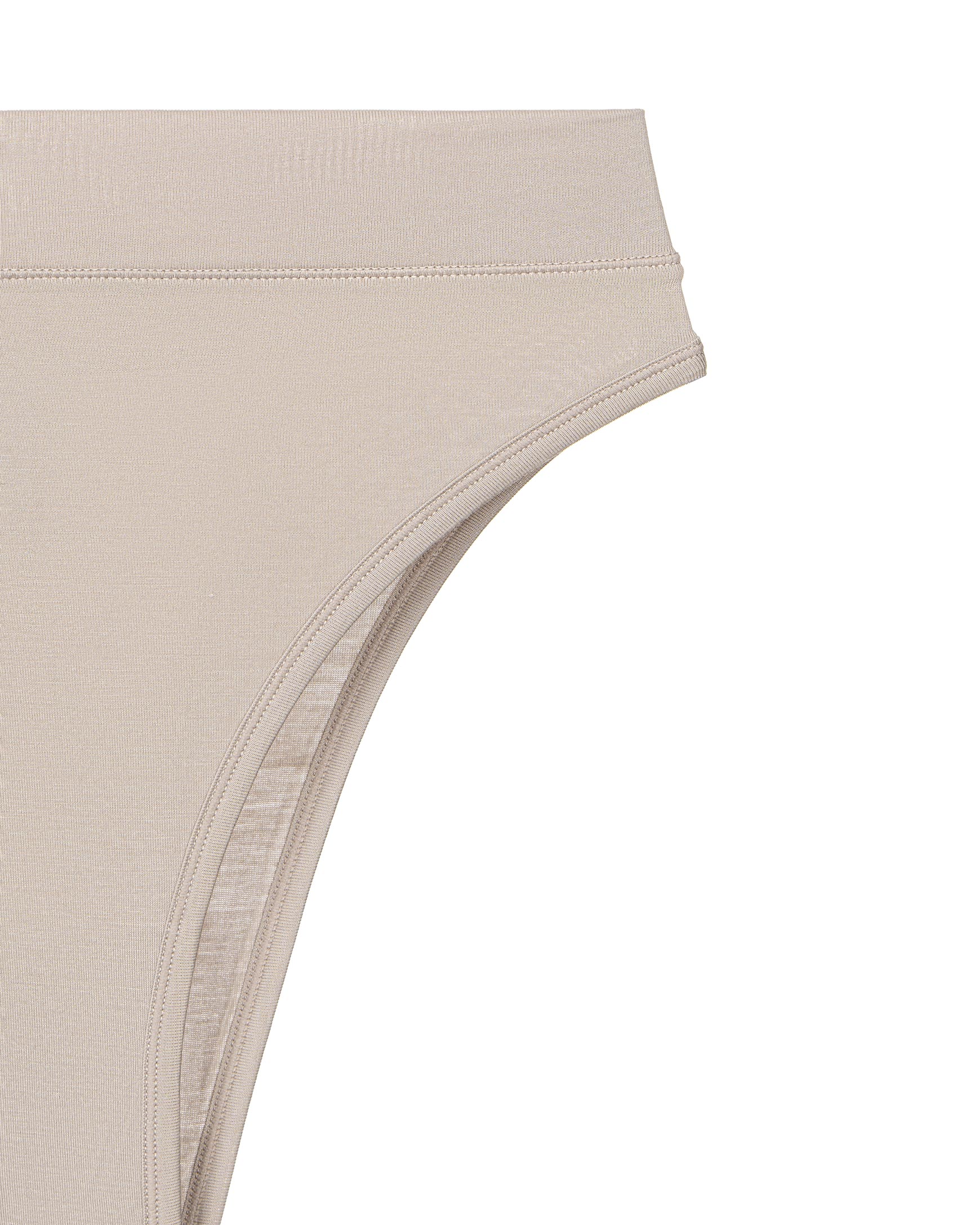 Трусы-бразилиано с высокой посадкой изготовлены из шелковистого бамбукового трикотажа. Широкий пояс без резинки мягко облегает фигуру. Изделие выполнено с декоративной окантовкой. Вырезы для ног окантованы широкой бейкой без резинки.