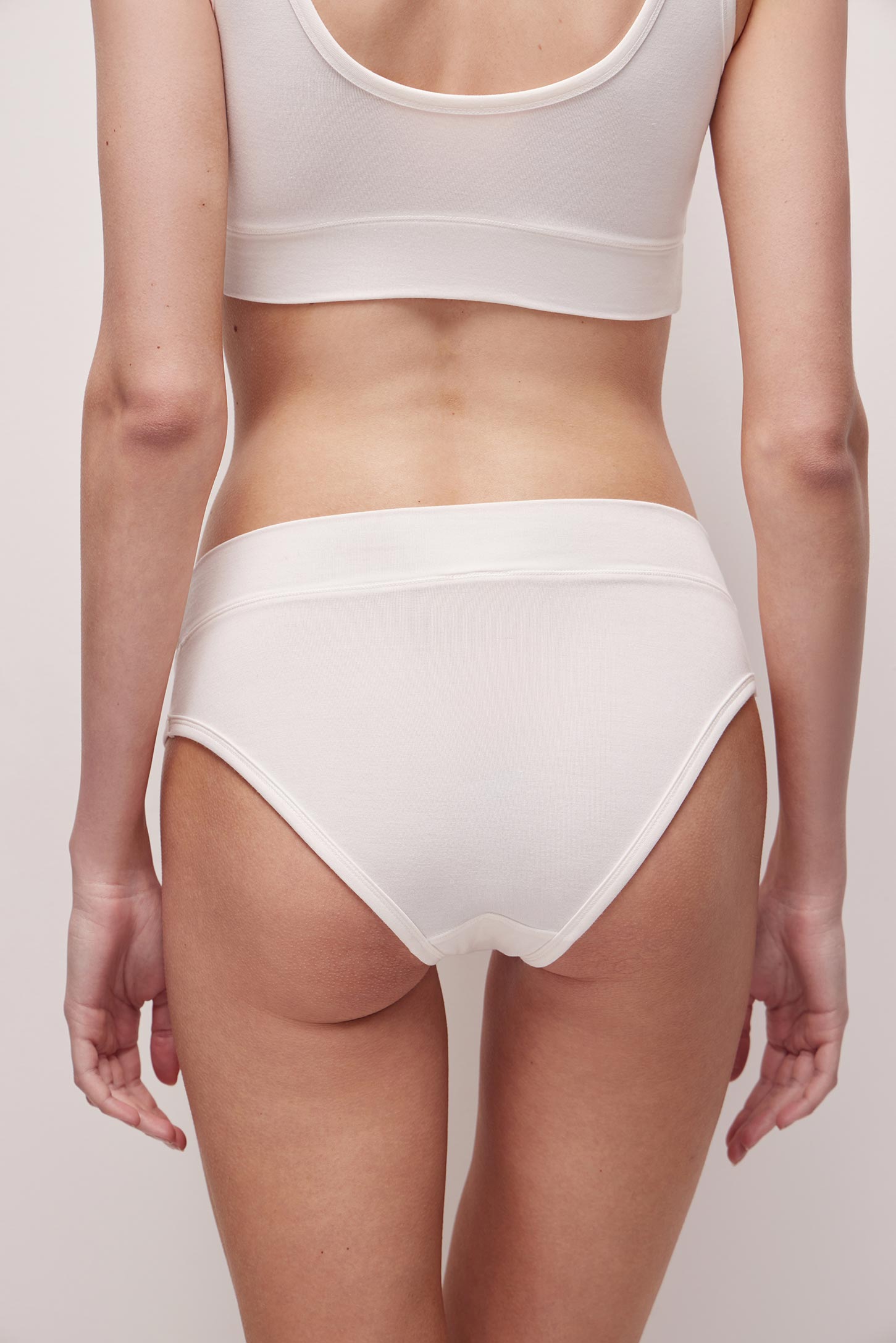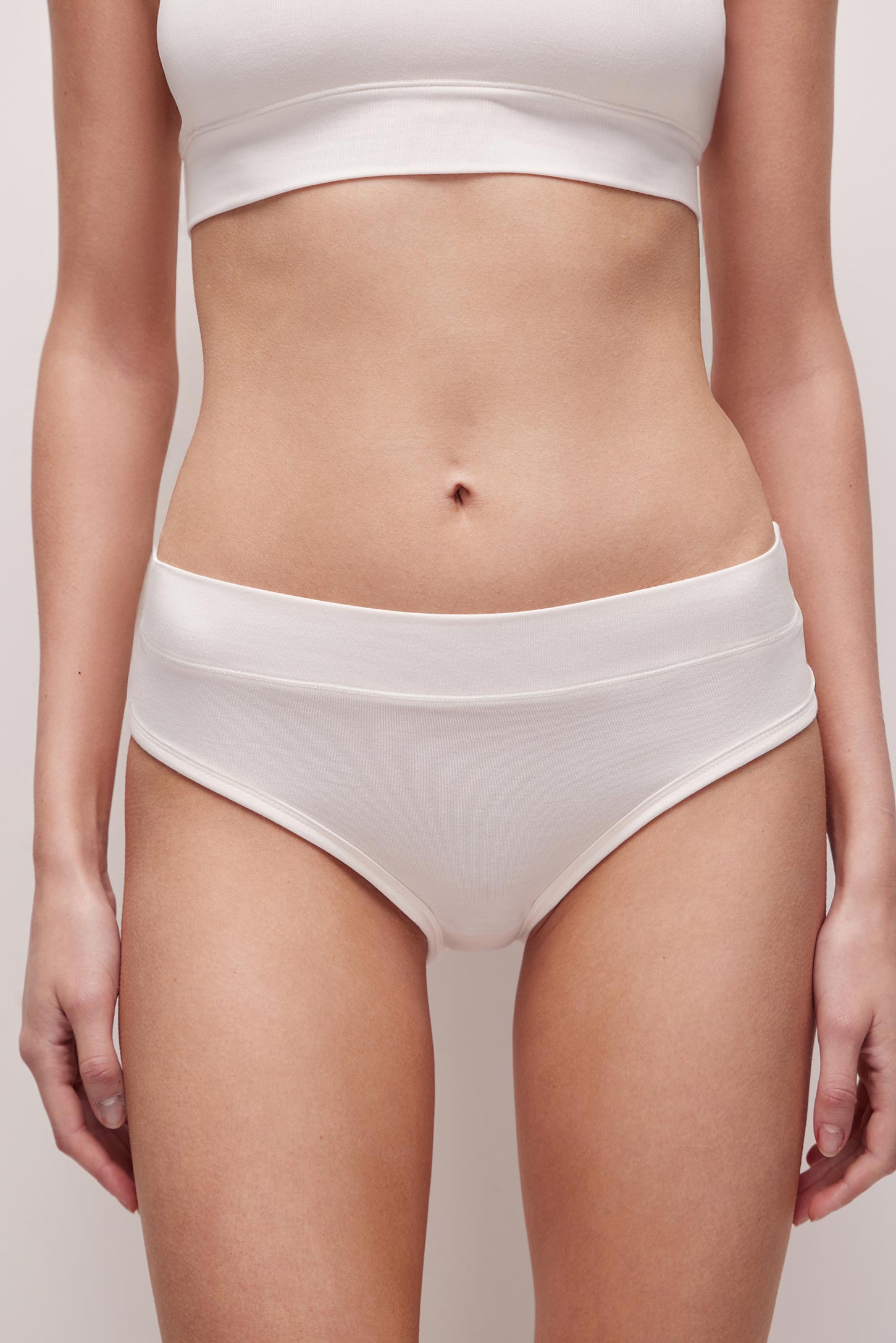 Трусы-слипы с высокой посадкой изготовлены из шелковистого бамбукового трикотажа. Широкий пояс без резинки мягко облегает фигуру. Изделие выполнено с декоративной окантовкой. Вырезы для ног окантованы широкой бейкой без резинки.