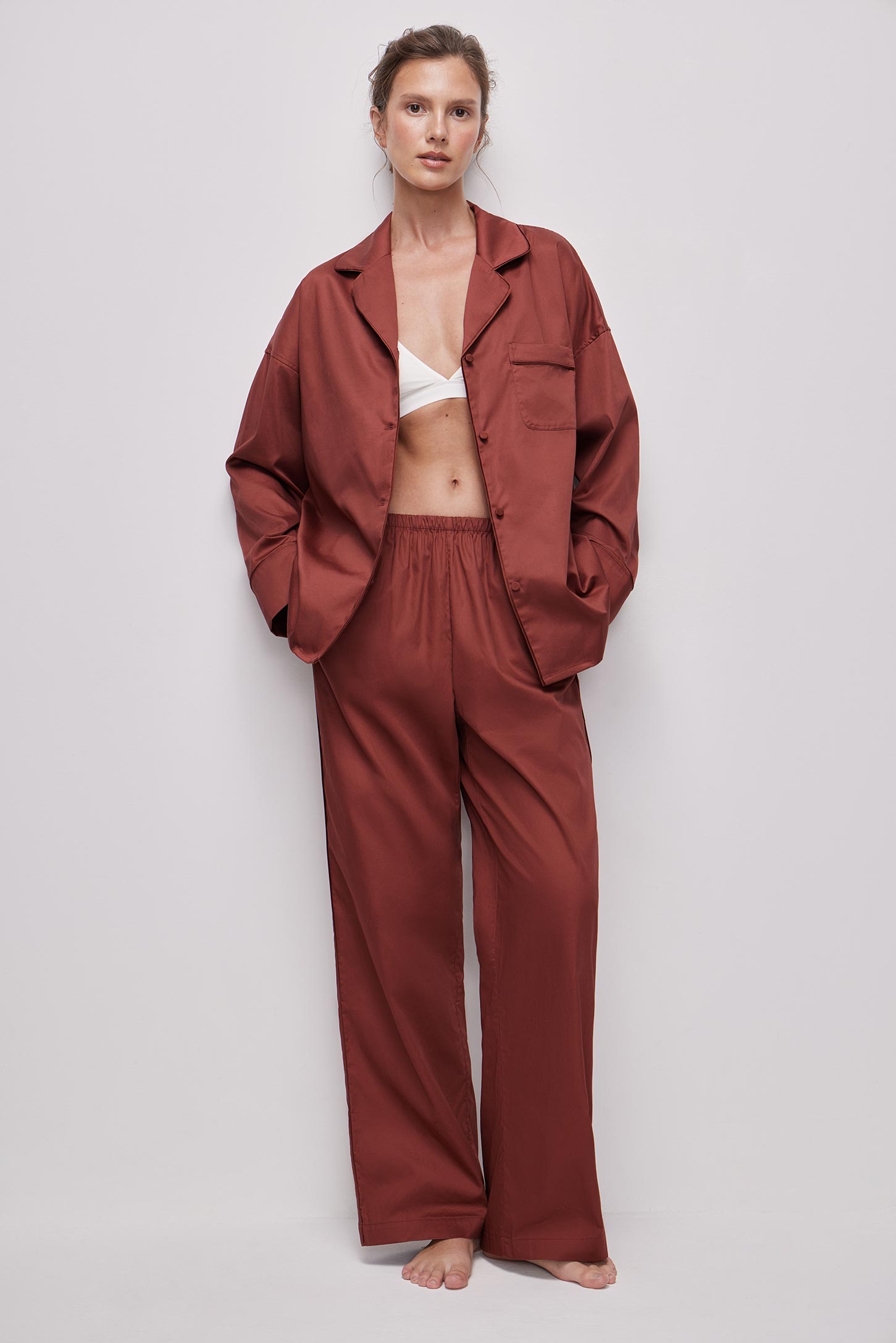 Пижамные брюки прямого силуэта с посадкой на линии талии. Пояс на мягкой резинке обеспечивает комфортную посадку изделия на разные типы фигур. Модель разработана с карманами в боковых швах. Брюки декорированы контрастным кантом по боковым швам.