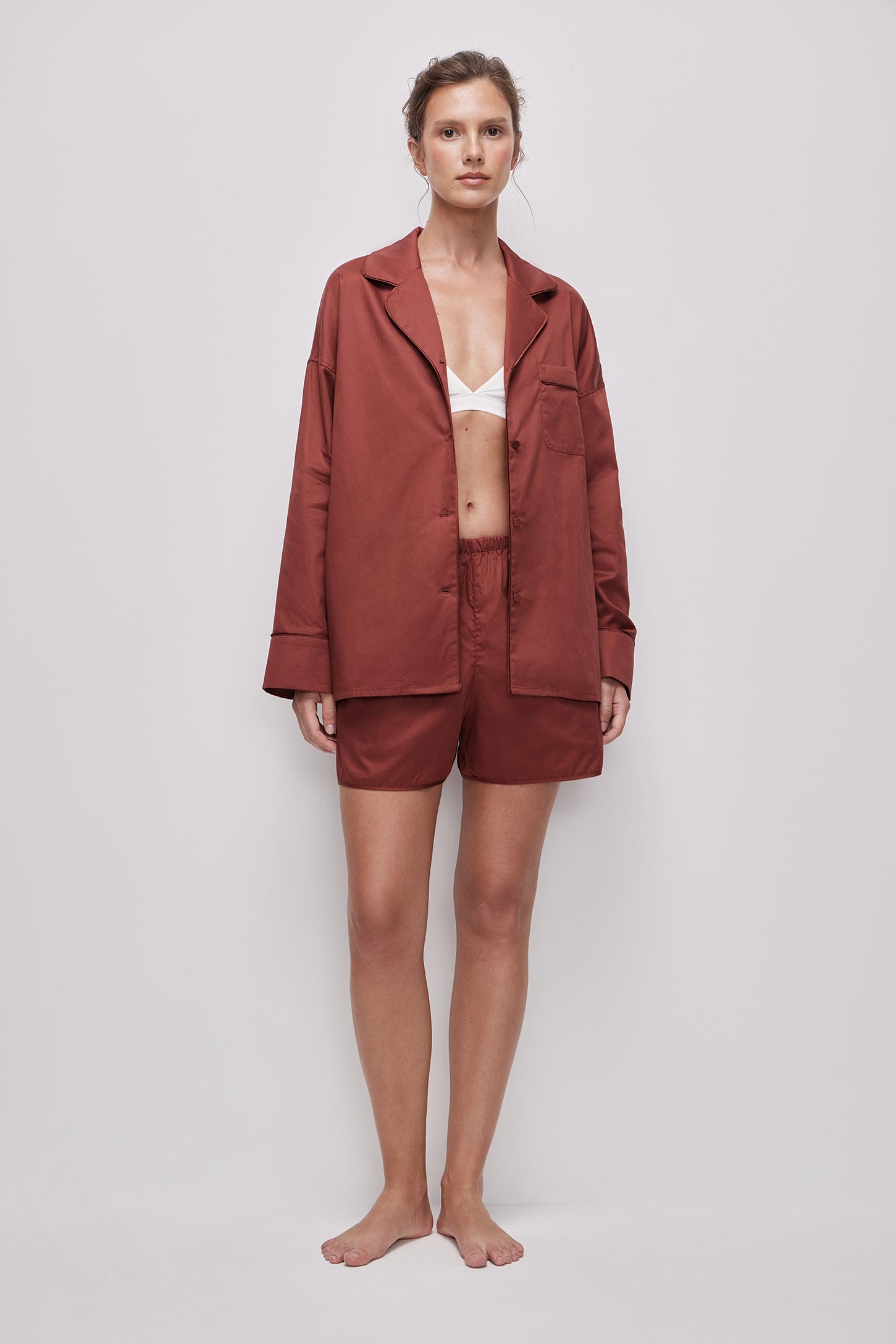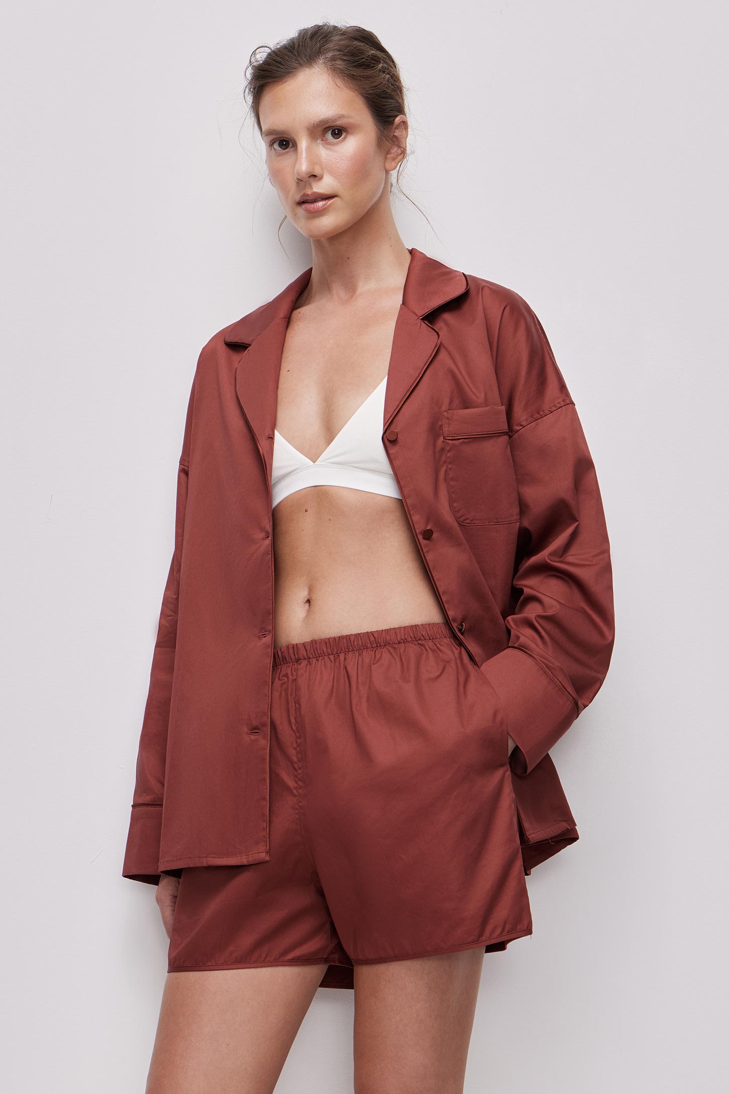 Пижамные шорты с посадкой на линии талии. Пояс на мягкой резинке обеспечивает комфортную посадку изделия на разные типы фигур. Шорты декорированы контрастным кантом по низу изделия. Модель имеет накладной карман на спинке. Силуэт модели трапециевидный.