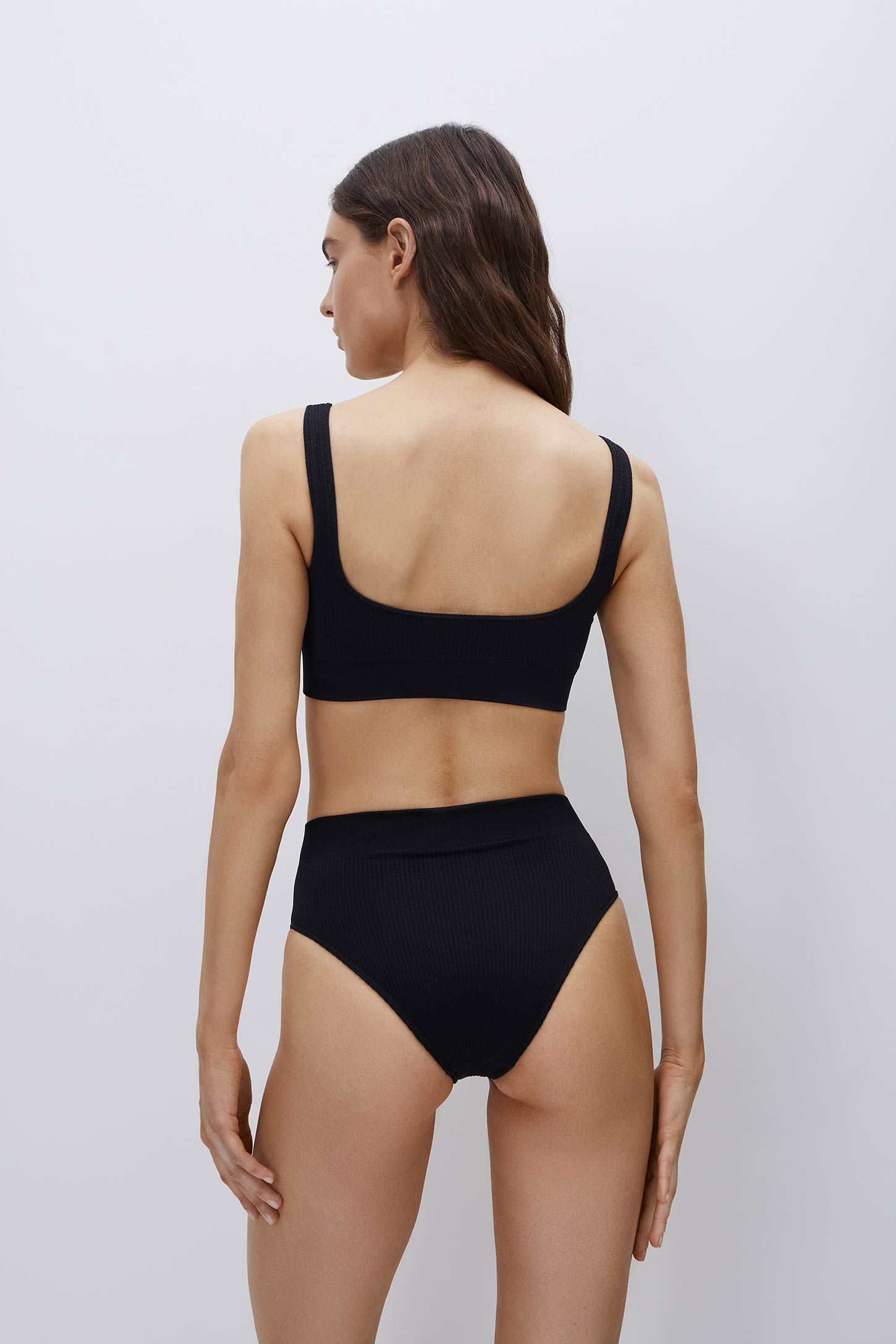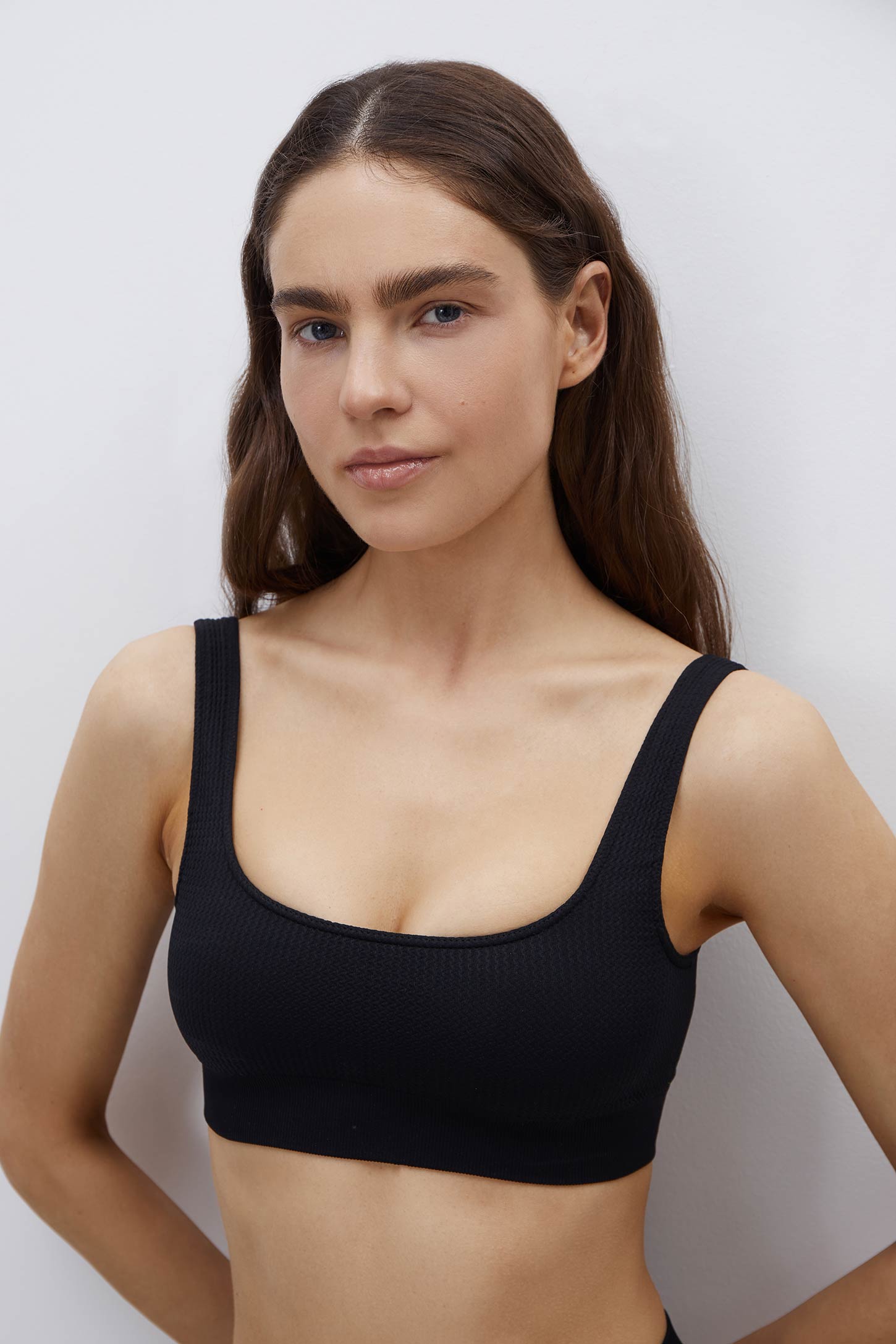 Купальный топ на широких бретелях изготовленный из мягкой микрофибры по современной технологии без боковых швов. Широкие бретели и резинка по низу топа обеспечивают комфортную поддержку груди. Модель дополнена эластичной мягкой подкладкой и съемными чашками.