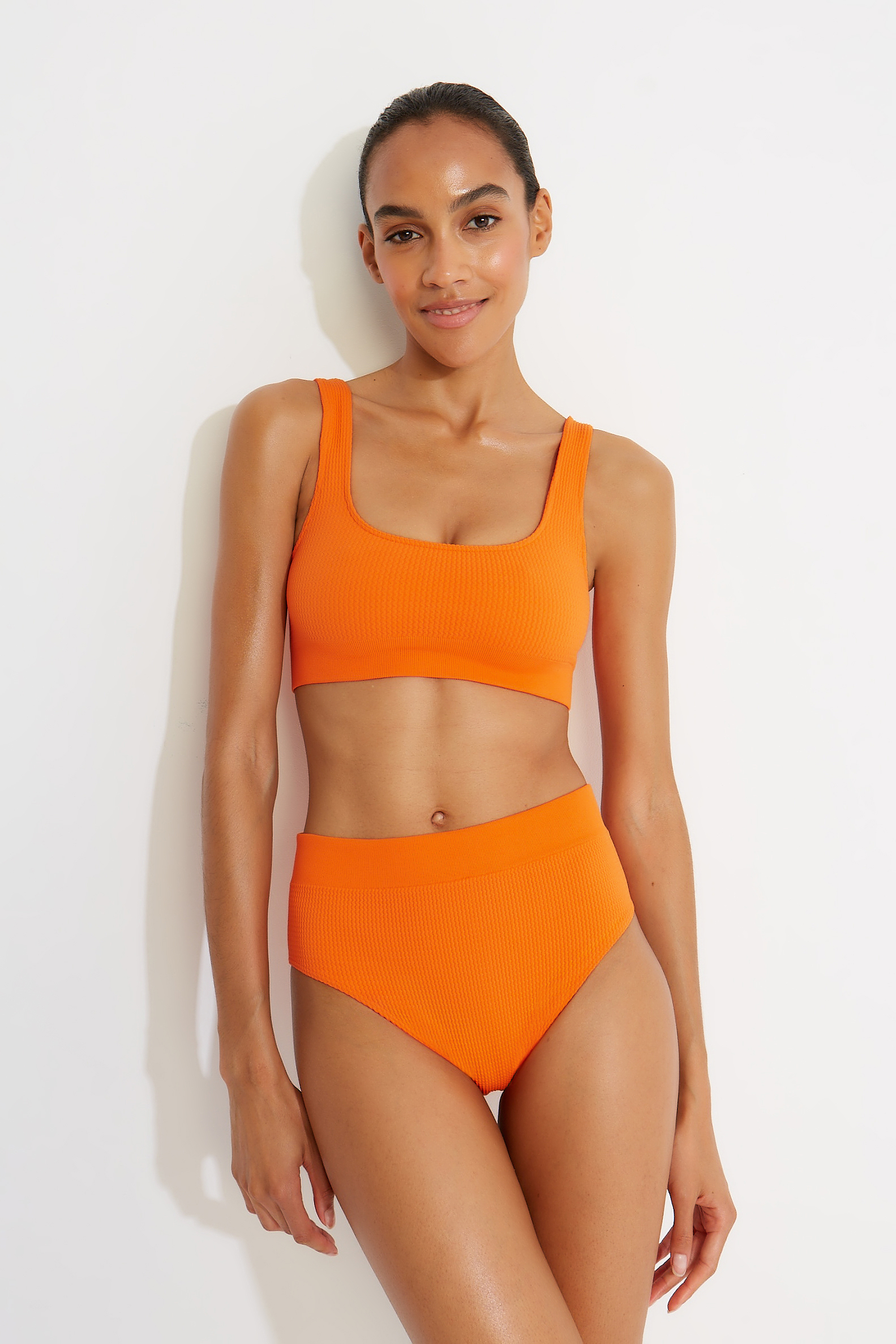 Топ из микрофибры с фактурным плетением выполнен по современной бесшовной технологии. Надёжную поддержку груди обеспечивает уплотненная резинка по низу топа. Изделие дополнено съемными чашками-вкладышами, которые моделируют форму груди. Модель полностью на подкладке. Топ повторяет изгибы фигуры и отлично подходит для пляжных образов, плавания и загара.