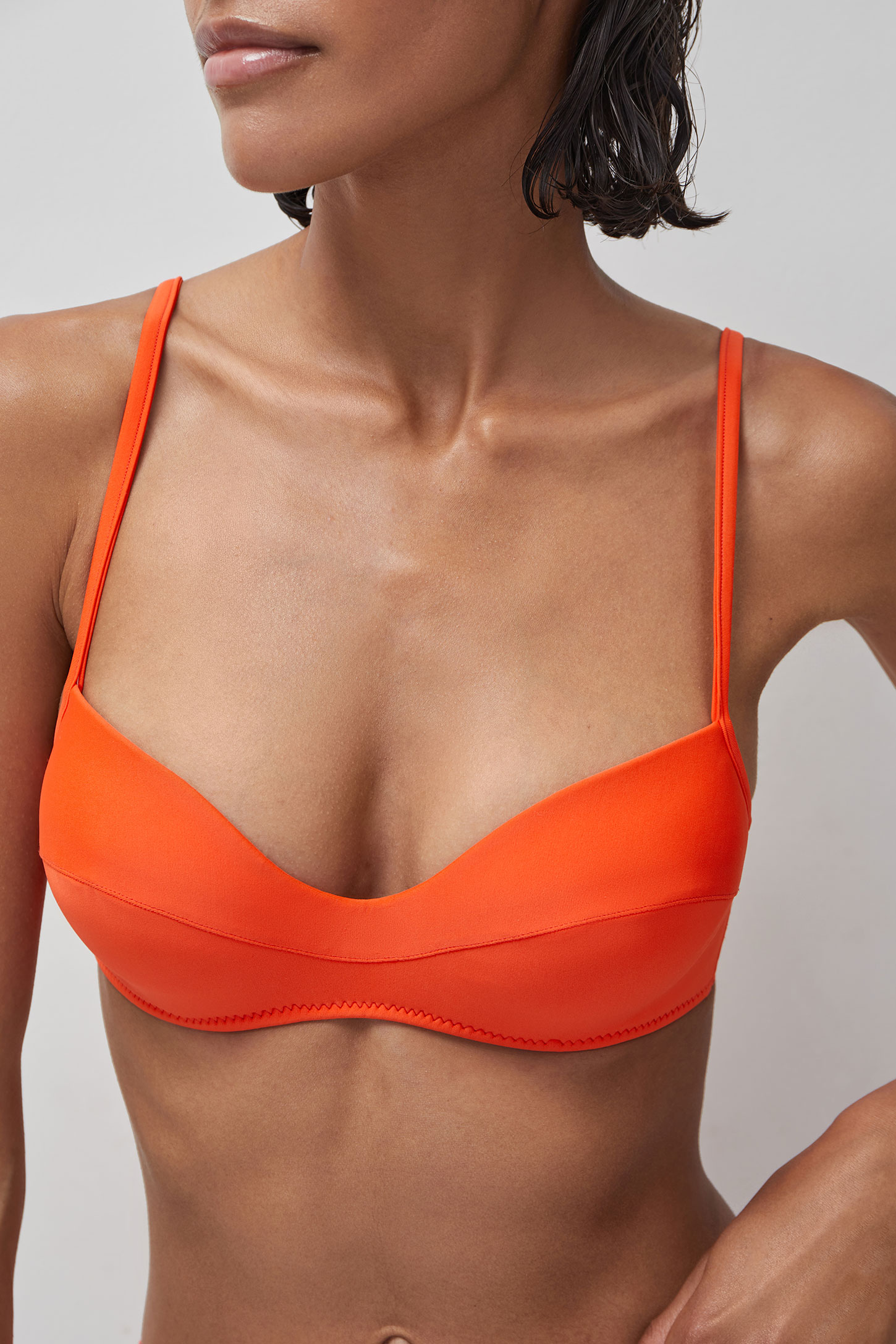 Топ на тонких бретелях с косточками изготовлен из итальянского матового бифлекса, обладающего высокой эластичностью и долговечностью. Топ с легким уплотнением чашки на подкладе фиксируется регулируемыми несъемными бретелями по верху и застежкой-крючком сзади. Топ в классическом исполнении прекрасно подойдет как для расслабленного времяпровождения, так и для плавания или занятий активными видами спорта.