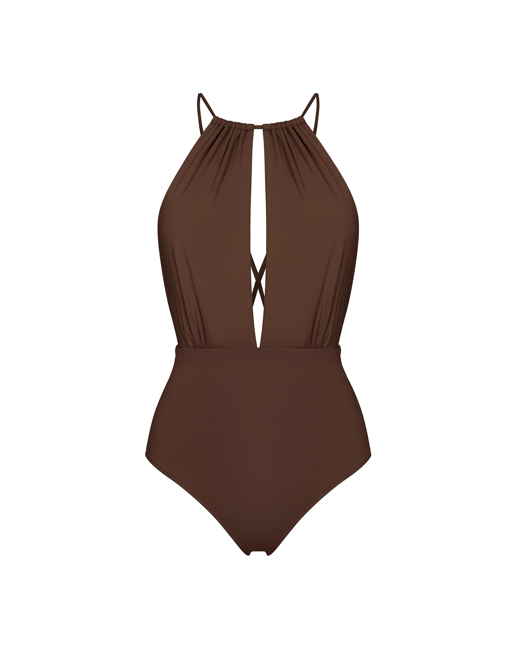 Сплошной купальник с открытой спиной изготовлен из гладкого шелковистого трикотажа. Материал по переду собран в мягкие складки на горловине, обрамляющие глубокий вырез. Тонкий эластичный шнурок позволяет фиксировать купальник различными способами завязывания. Модель дополнена подкладкой. Низ изделия, выполненный в форме танга, глубокие вырезы для ног обработаны тонкой эластичной резинкой.