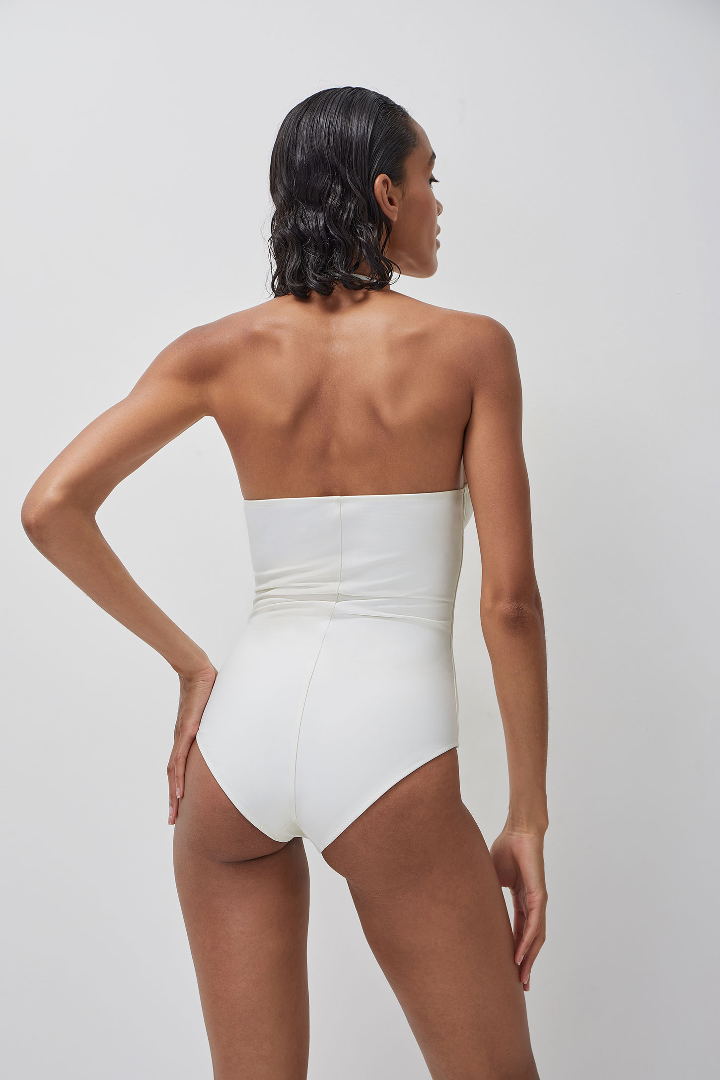 Сплошной купальник бандо изготовлен из итальянского матового бифлекса, обладающего высокой эластичностью и долговечностью. Чашки топа исполнены с легким уплотнением и дополнены каркасами для уверенной поддержки груди. Модель дополнена подкладом. Купальник фиксируется двумя различными способами с помощью тонкого шнурка-бретели, а также без него, за счет надежной фиксации, с помощью силиконовой резинки. Низ купальника имеет форму трусов-слипов. За счет эластичности материала высоту вырезов по ножке можно варьировать.