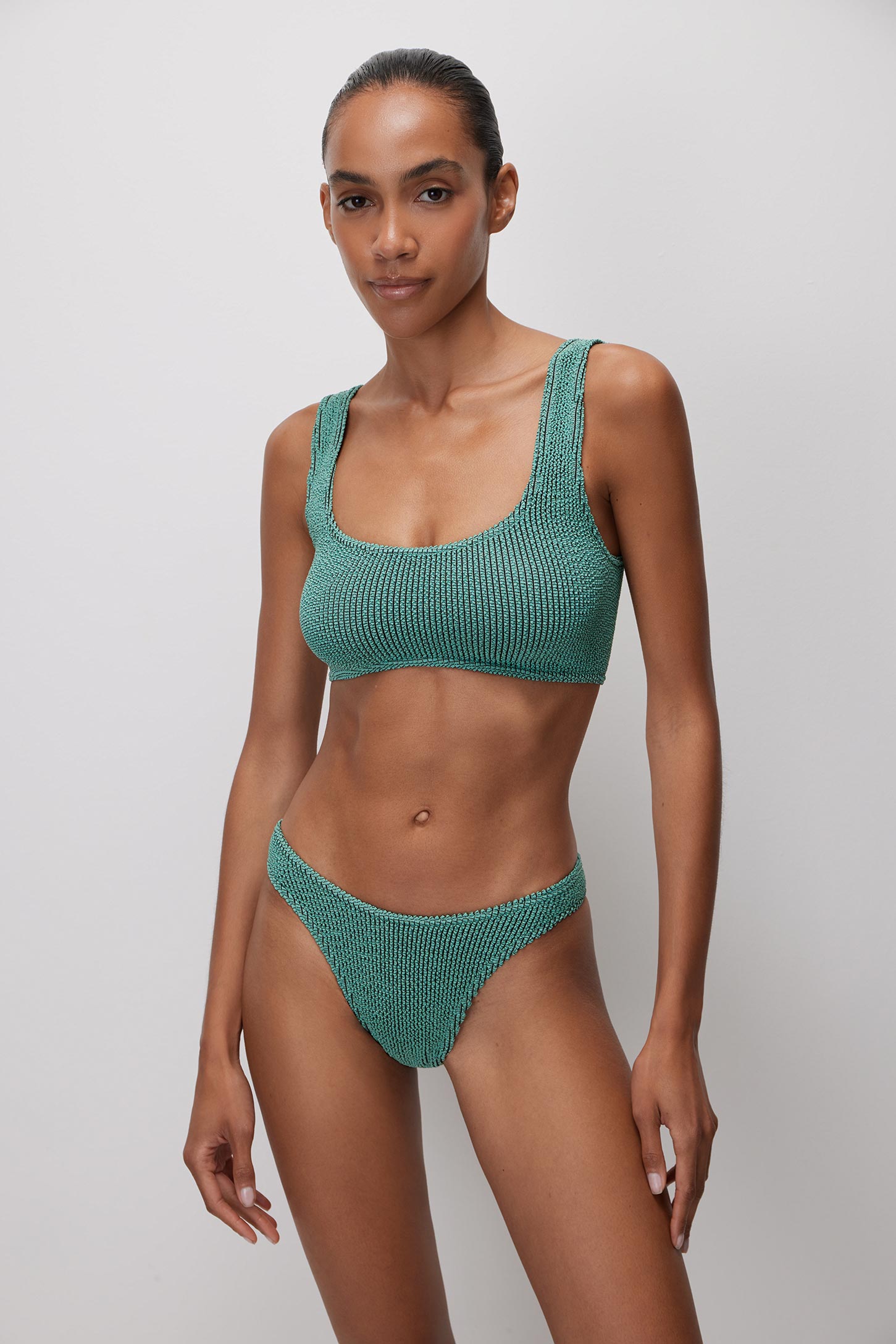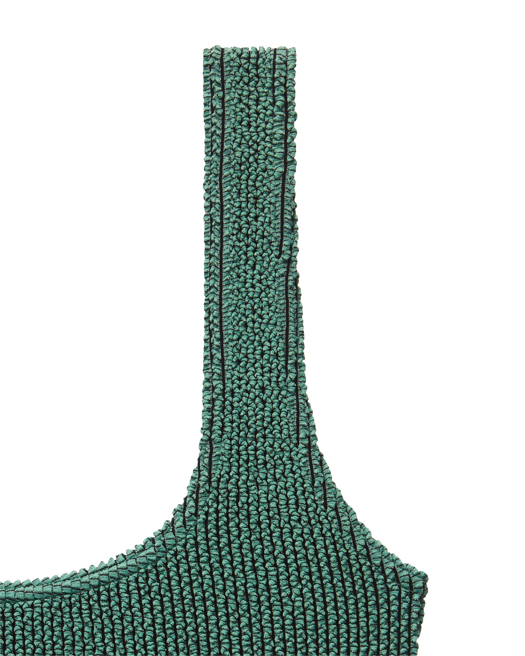 Купальный топ с глубоким вырезом спереди изготовлен из фактурного трикотажа по современной технологии seamless без боковых швов. Материал для этой капсулы обладает особой эластичностью, благодаря чему, купальник будет идеально сидеть на девушках с размером от XS до L. Купальный топ обеспечивает естественную поддержку груди, идеально облегает тело, подчеркивает силуэт и быстро сохнет. Глубокий вырез горловины красиво открывает линию декольте. Нить люрекса в плетении добавляет трикотажу благородный деликатный блеск.