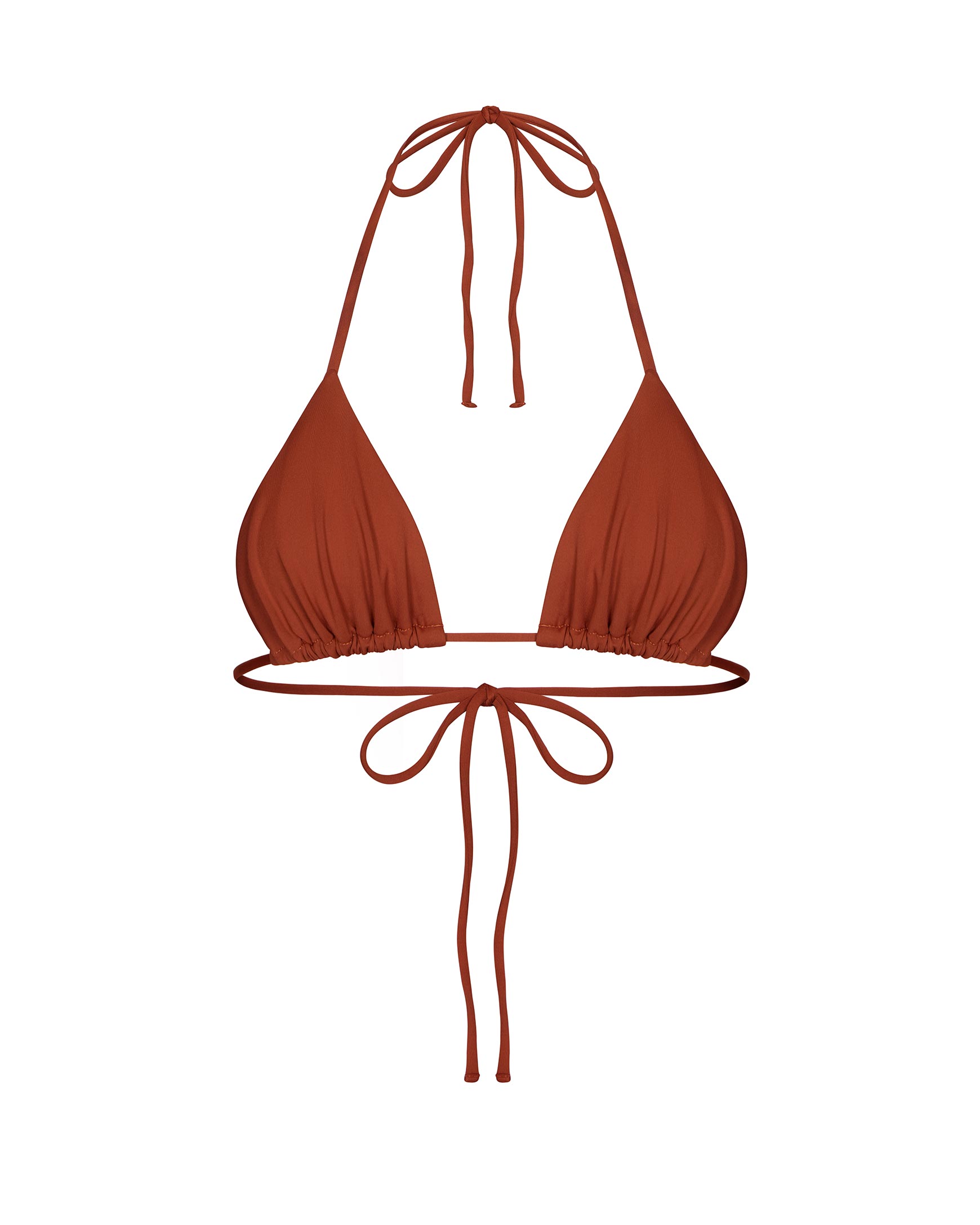 Купальный топ-бикини с треугольными чашками-вкладышами на подкладке, изготовленный из гладкого и шелковистого трикотажа, идеально подходит для тех, кто предпочитает максимально открытые модели для загара. Посадка топа и драпировка на чашках регулируется с помощью эластичных шнурков, которые фиксируются на шее и на спине различными способами.