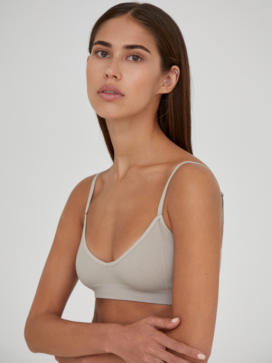 Базовый топ на тонких бретелях с V-образным вырезом горловины для девушек с небольшой аккуратной грудью. Модель выполнена по современной бесшовной технологии из мягкой микрофибры в рубчик, подкладка и чашечки не предусмотрены. Плавные декоративные линии в передней части лифа придают модели изящество и женственность. Топ подойдет на размеры A, B.
