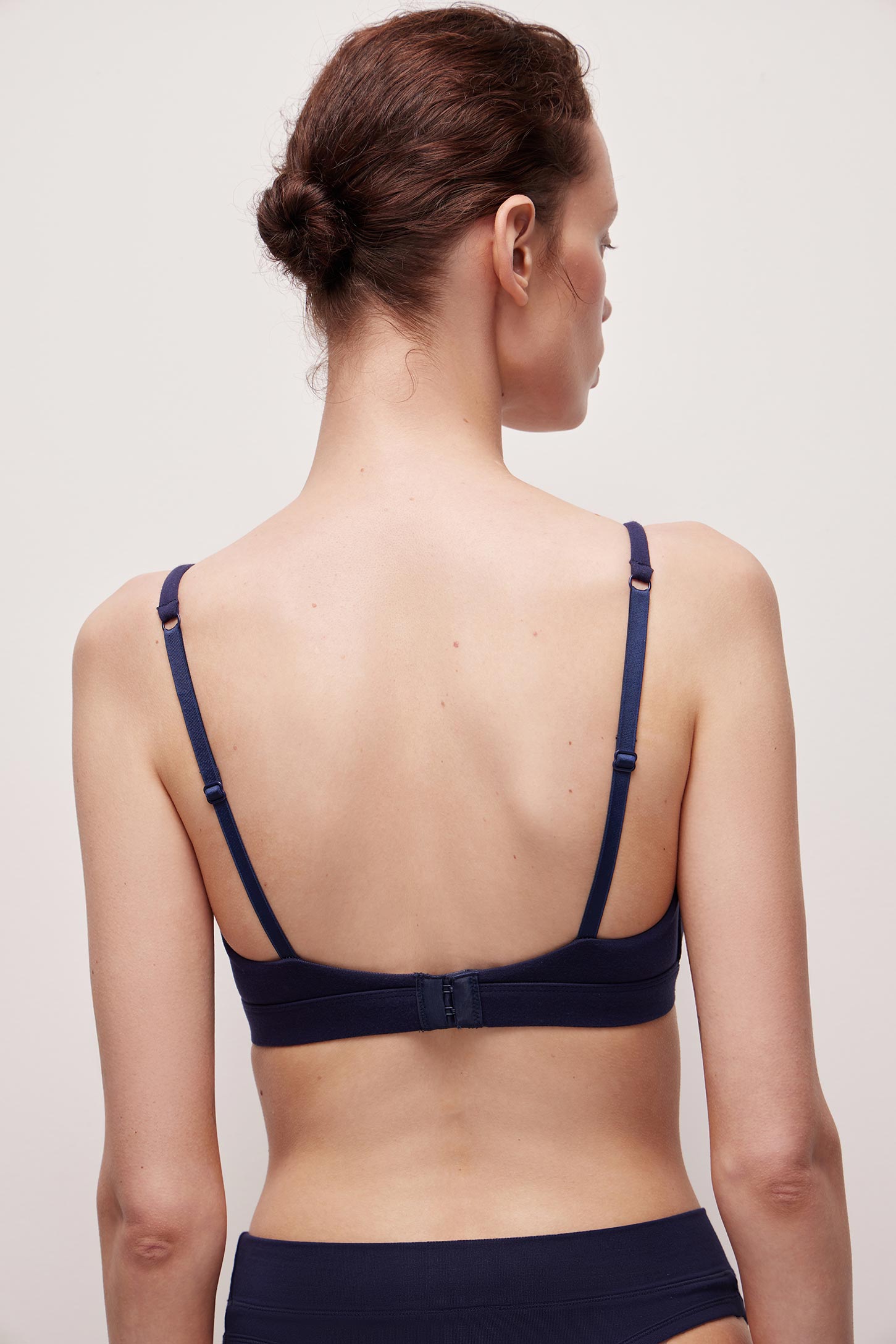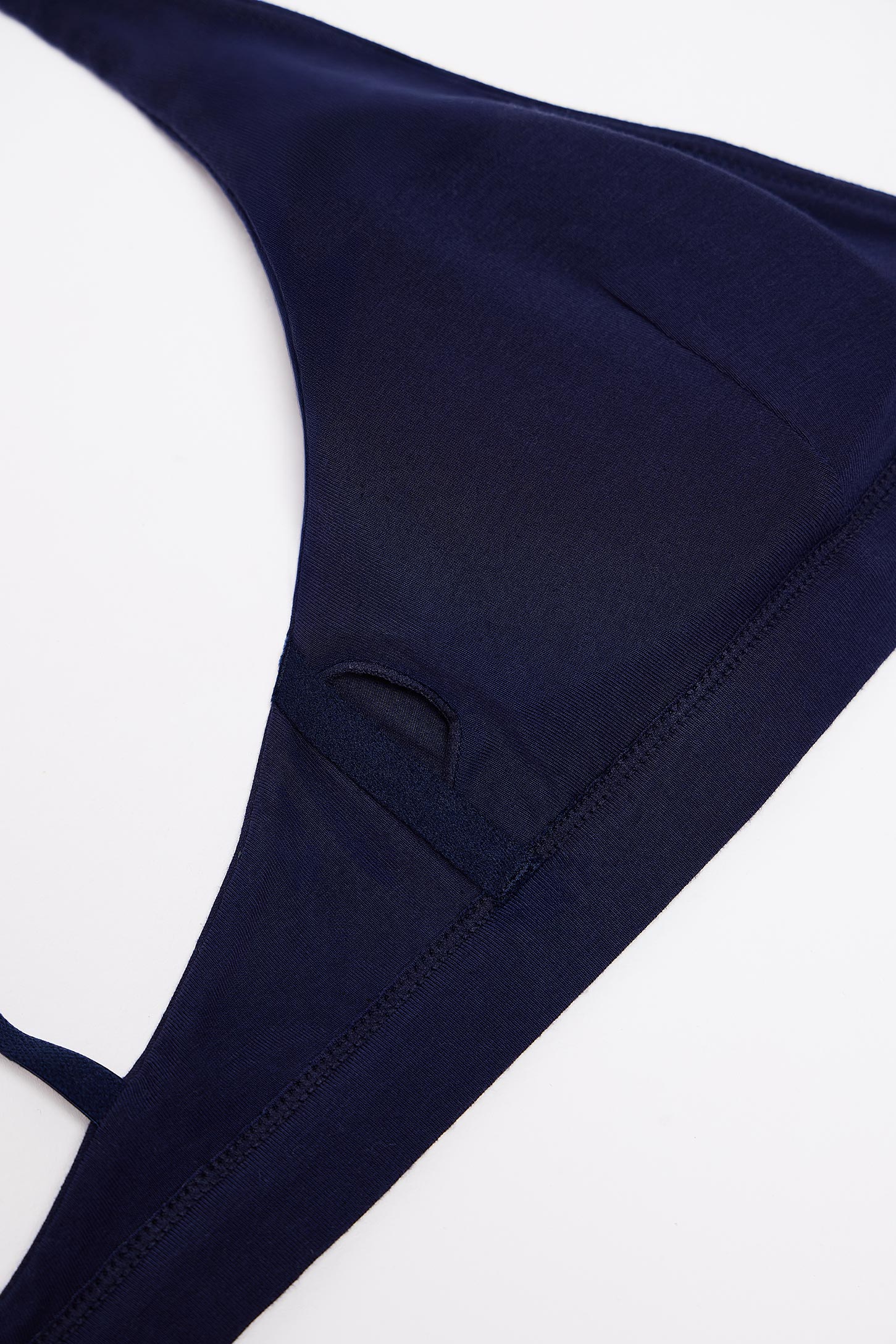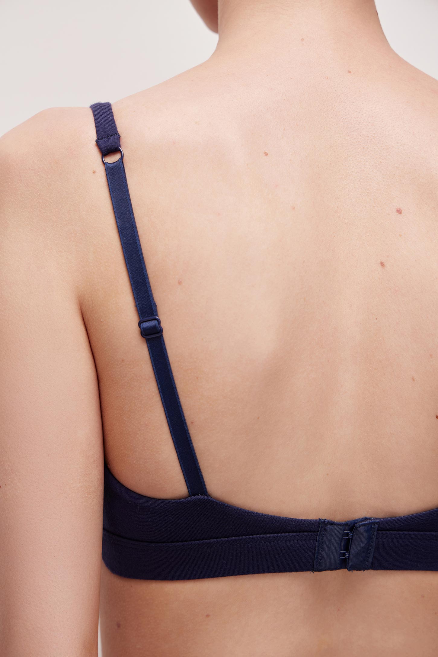 Бюстгальтер с V-образной формой декольте на тонких регулируемых бретелях и с застежкой по спинке. Изделие выполнено из шелковистого бамбукового трикотажа. Треугольная форма чашек на подкладке и дополнена съемными чашками-вкладышами. Застежка на крючках позволяет регулировать объем изделия под грудью и обеспечивает плотное прилегание.