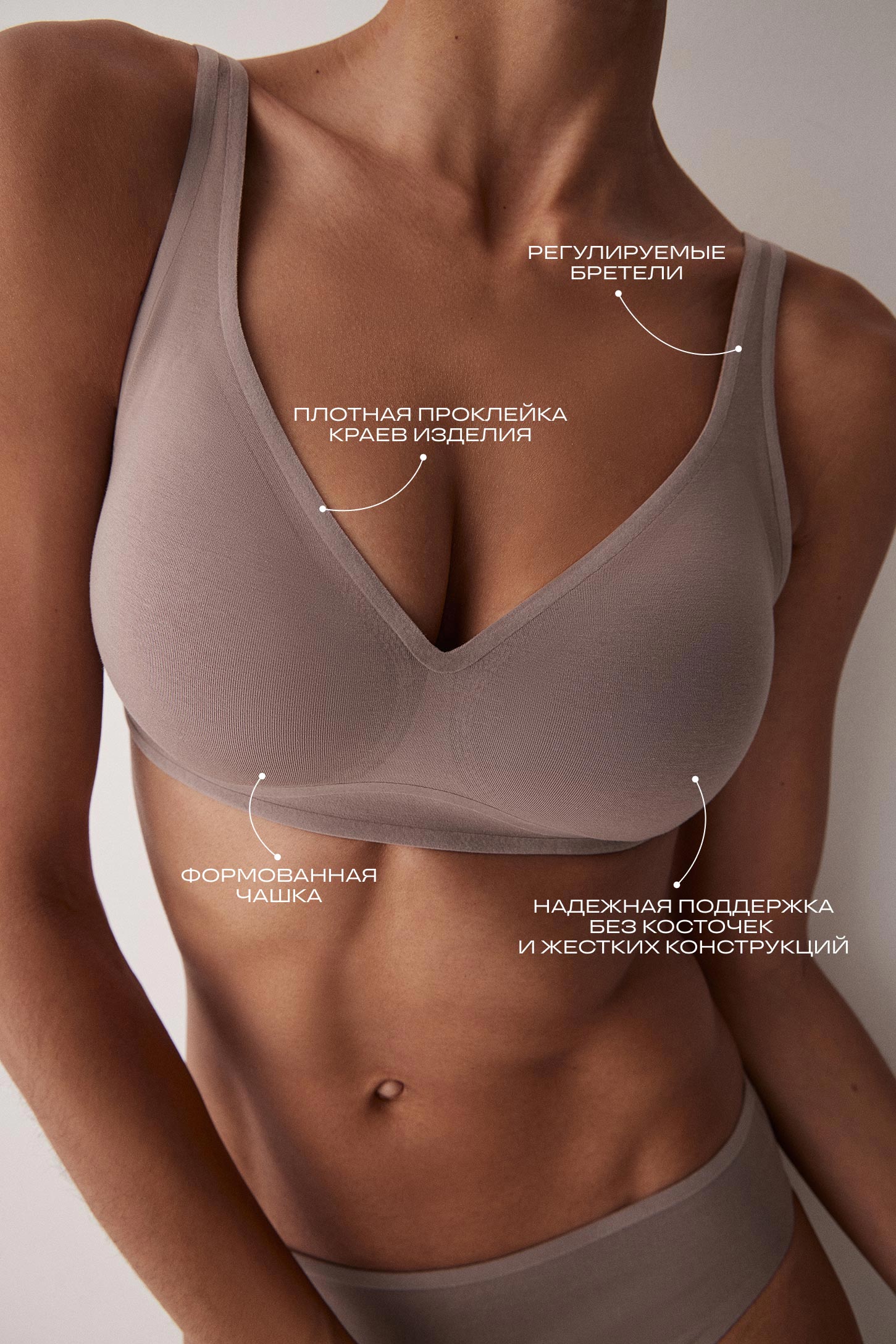 Женский бюстгальтер из мягкого хлопкового материала, без швов, с обработкой краев по технологии lasercut на регулируемых бретелях, с уплотненными чашками-вкладышами, без костей, на подкладке, с застежкой по центру спинки. Застежка на крючках позволяет регулировать объем изделия под грудью и обеспечивает плотное прилегание. Отсутствие швов позволяет изделию оставаться незаметным под одеждой.