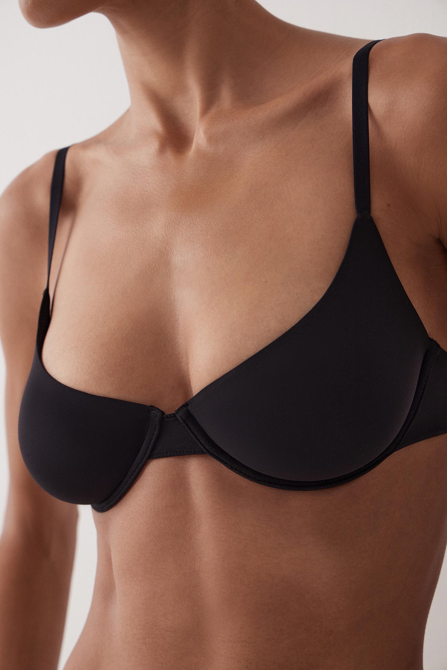 Бюстгалтер на тонких регулируемых бретелях с застежкой по спинке. Изготовлен из сверхтонкого и эластичного капронового трикотажа. Модель на подкладке, с костями, без чашек-вкладышей. Специальная обработка швов позволяет изделию оставаться незаметным под одеждой, обеспечивает