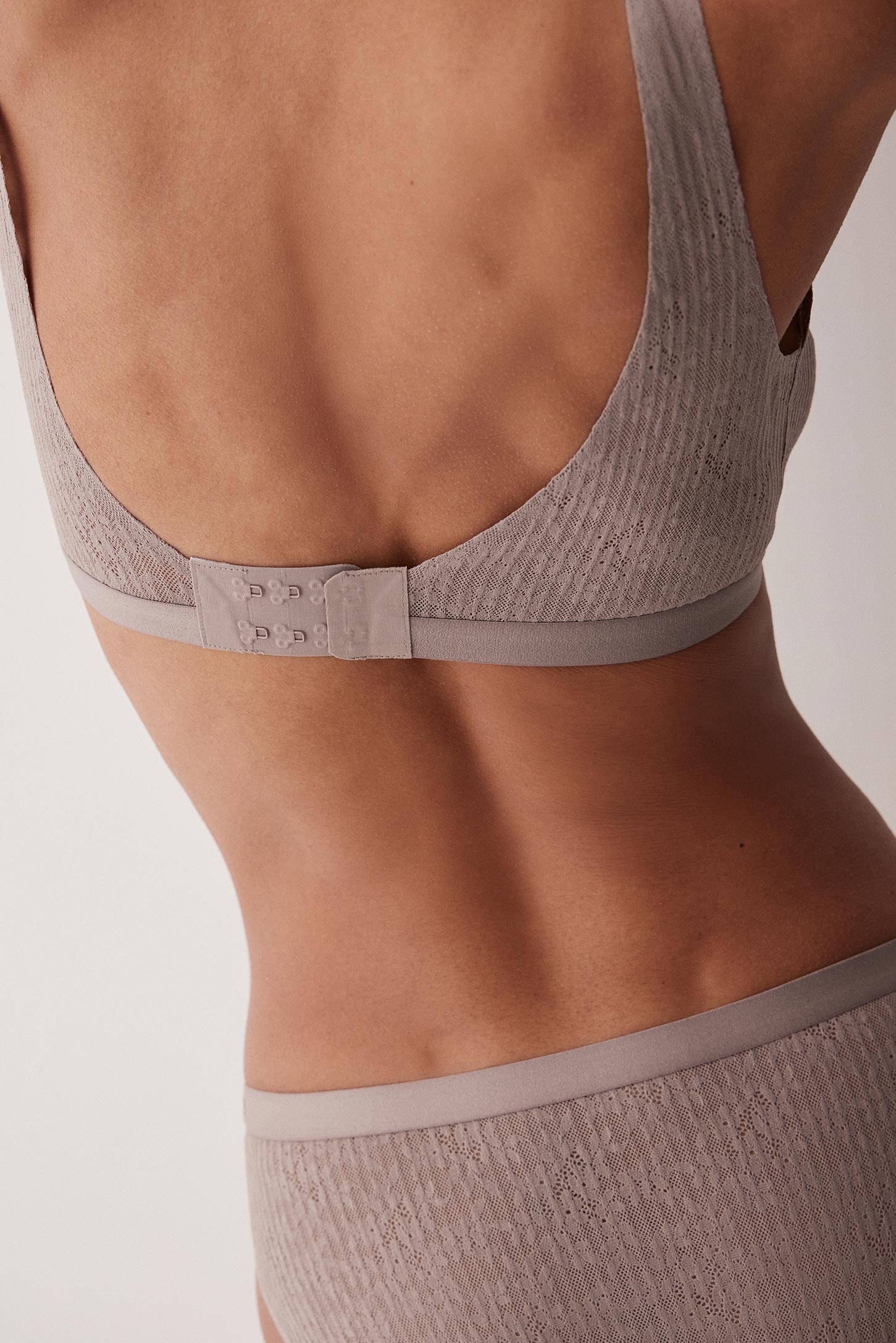 Бюстгальтер изготовлен из эластичного кружева с цветочным рисунком. Широкая резинка под грудью выполнена из эластичного материала. Широкие бретели и линия горловины обработаны эластичной тесьмой. Регуляторы на бретелях позволяют корректировать посадку изделия. На спинке расположена застежка на крючки. Бюстгальтер на подкладке, без чашек-вкладышей, обеспечивает естественную поддержку груди.