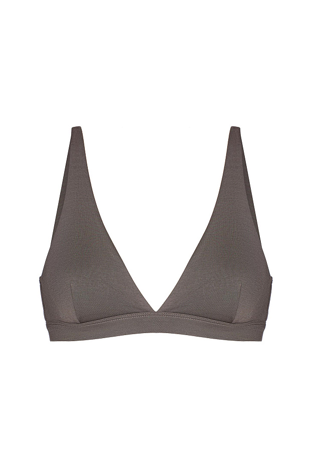 Бюстгальтер с V-образной формой декольте на тонких регулируемых бретелях и с застежкой по спинке. Изделие выполнено из шелковистого бамбукового трикотажа. Треугольная форма чашек на подкладке и дополнена съемными чашками-вкладышами. Застежка на крючках позволяет регулировать объем изделия под грудью и обеспечивает плотное прилегание.