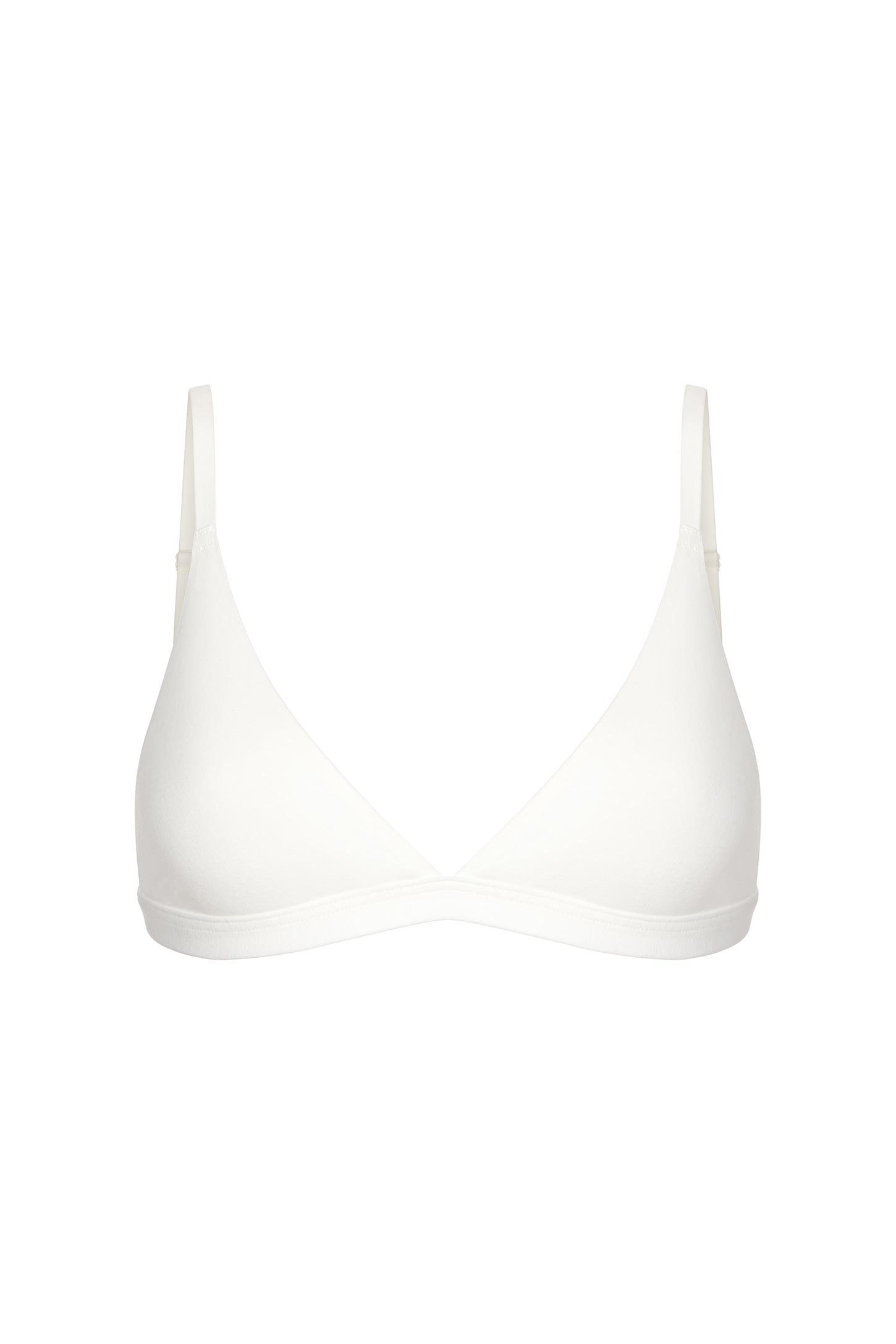 Бюстгальтер на тонких регулируемых бретелях с застежкой по спинке изготовлен из из мягкого и эластичного хлопка. Треугольная форма чашек на подкладке, без вытачек. Без чашек-вкладышей. Застежка на крючках позволяет регулировать объем изделия под грудью и обеспечивает плотное прилегание.