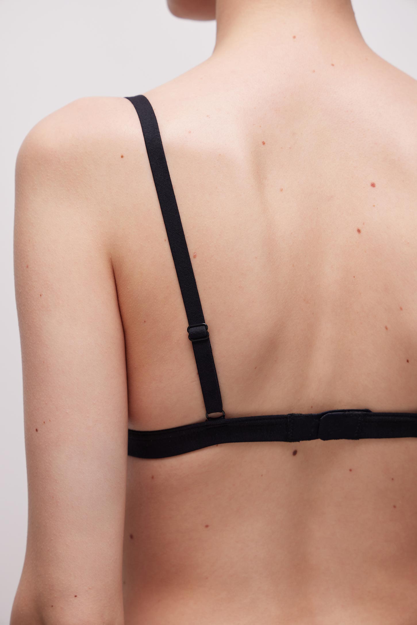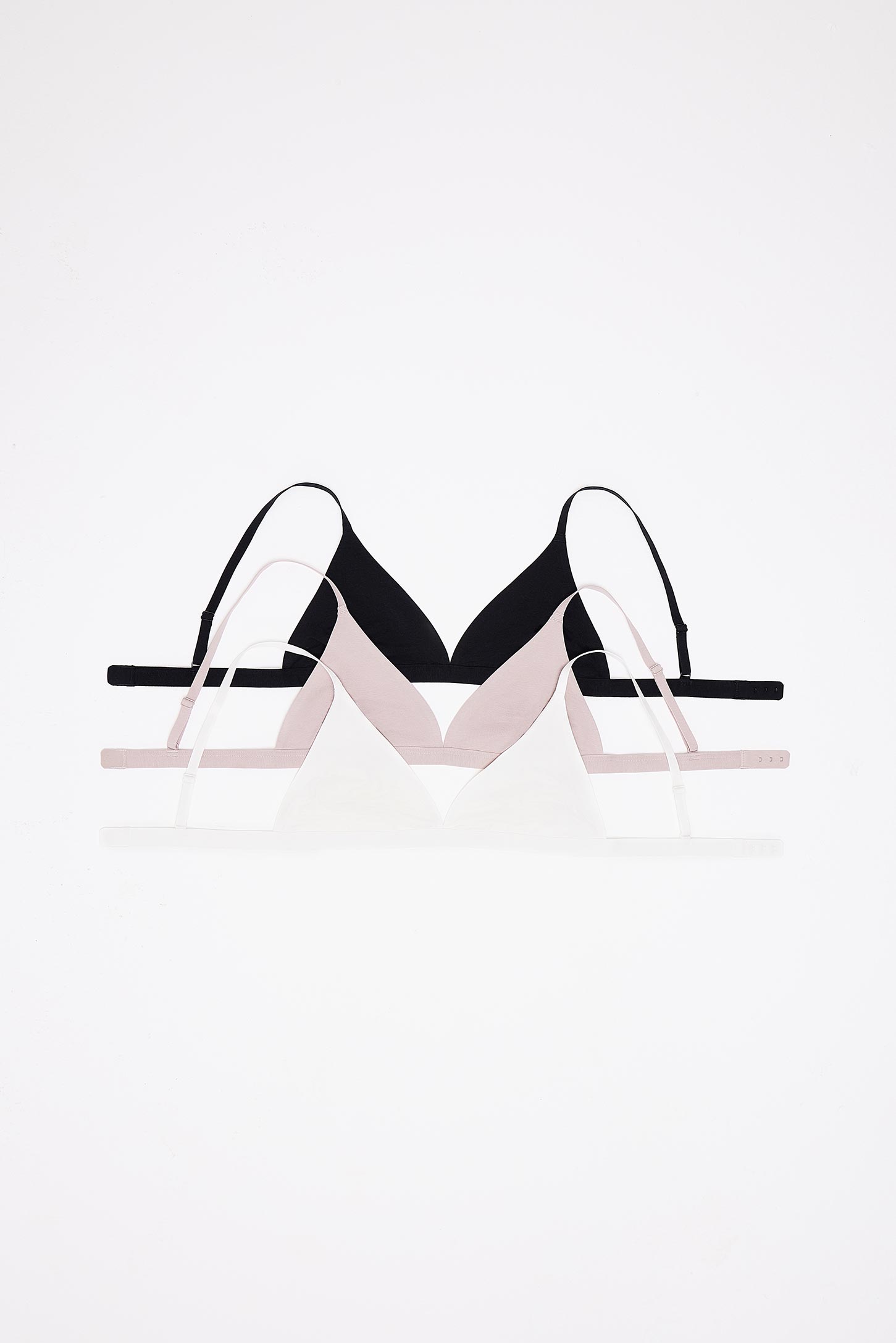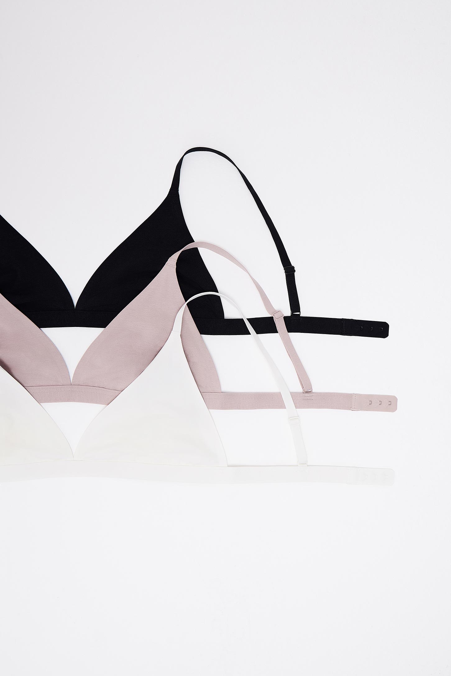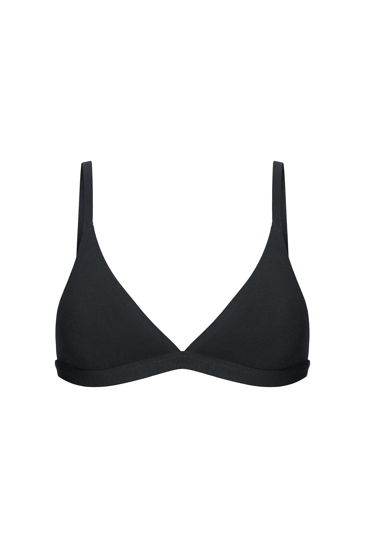 Бюстгальтер на тонких регулируемых бретелях с застежкой по спинке изготовлен из из мягкого и эластичного хлопка. Треугольная форма чашек на подкладке, без вытачек. Без чашек-вкладышей. Застежка на крючках позволяет регулировать объем изделия под грудью и обеспечивает плотное прилегание.