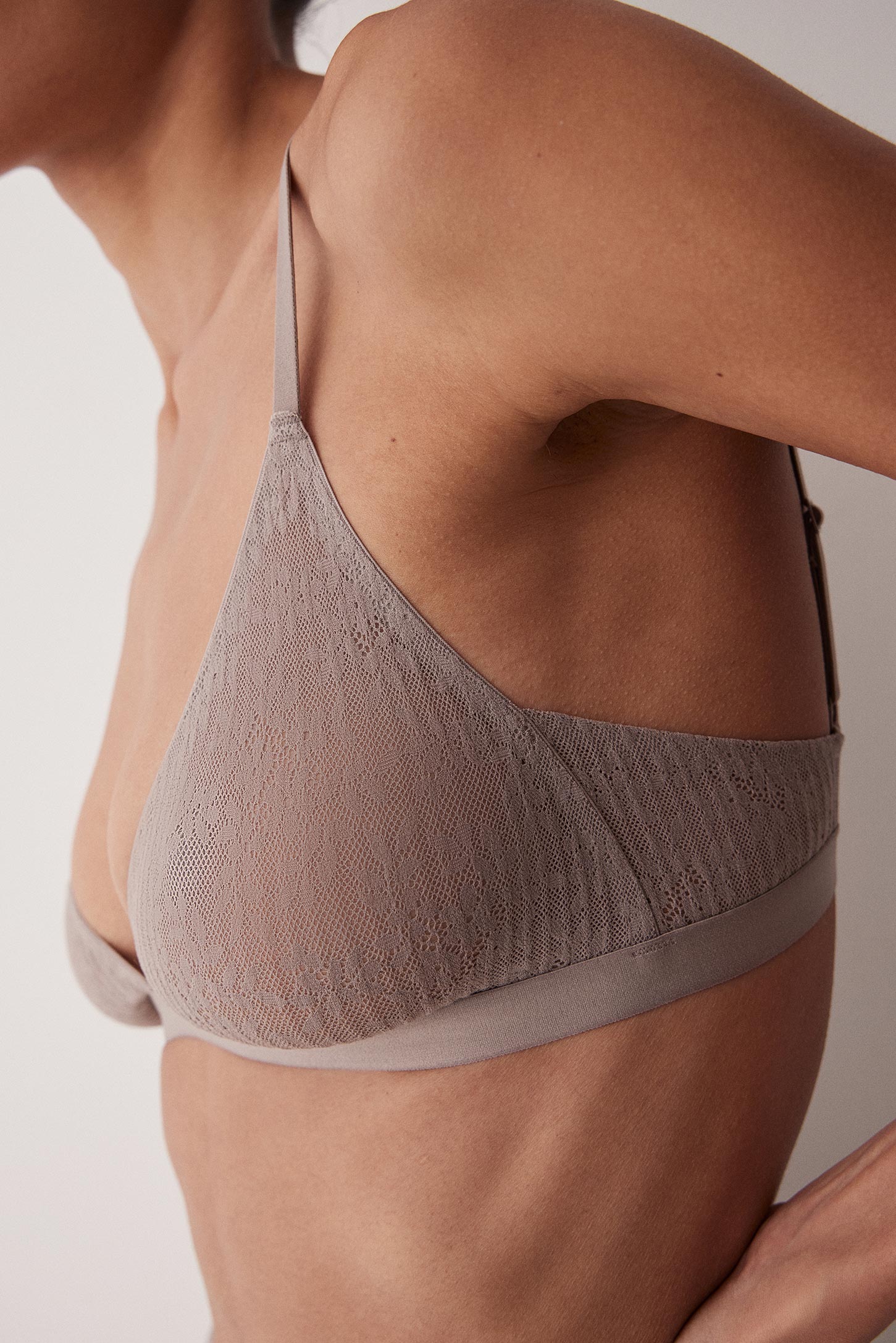 Бюстгальтер с треугольными чашками изготовлен из эластичного кружева с цветочным рисунком. Тонкие бретели и широкая резинка под грудью выполнены из эластичного материала. Линия горловины и спинки обработаны эластичной тесьмой. Регуляторы на бретелях позволяют корректировать посадку изделия. На спинке расположена застежка на крючки. Бюстгальтер без подкладки, без чашек-вкладышей, обеспечивает естественную поддержку груди.