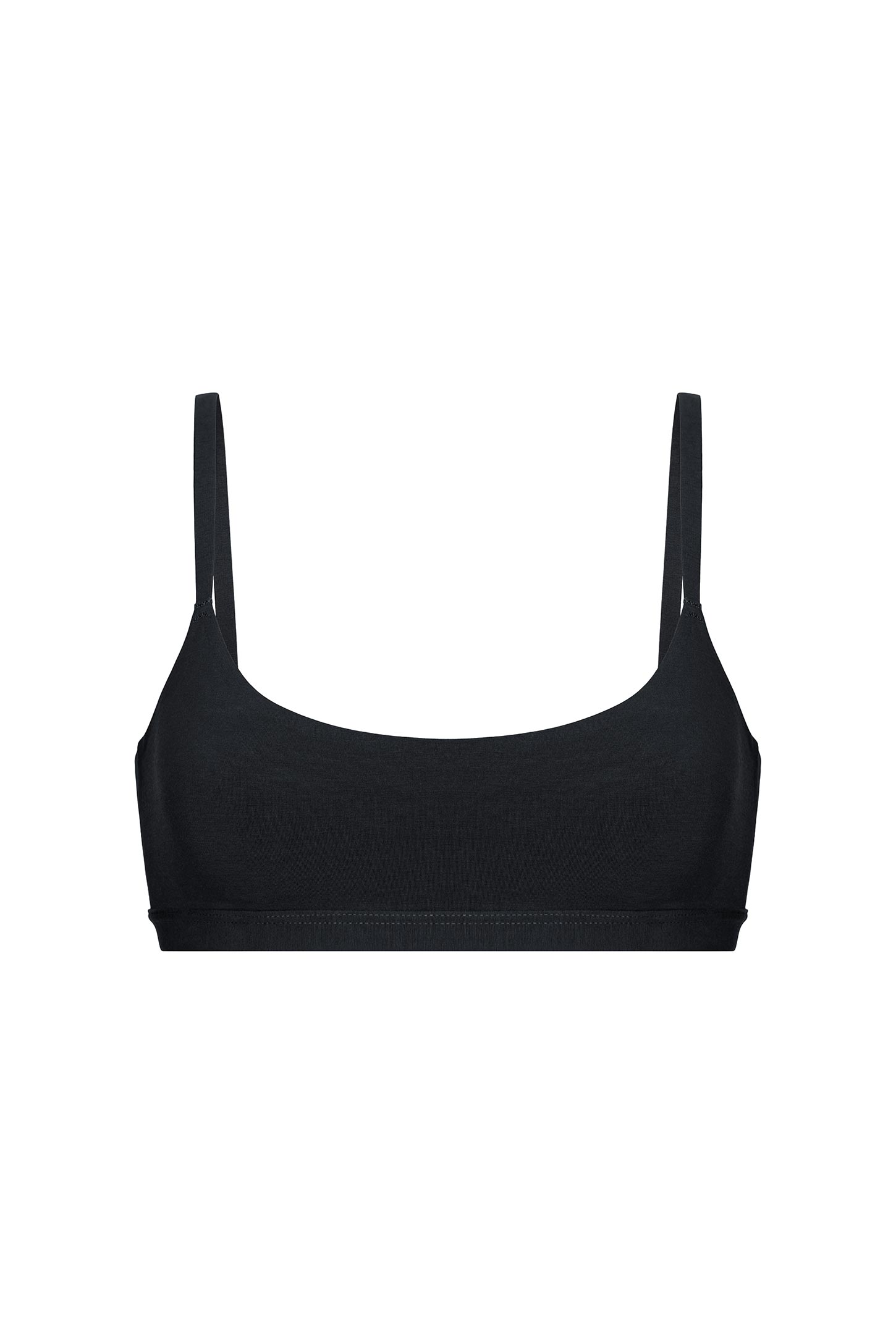 Топ на тонких регулируемых бретелях с эластичной резинкой под грудью. Модель из мягкого и эластичного хлопка, с анатомическим формованием чашек на подкладке, без вытачек. Без чашек-вкладышей.