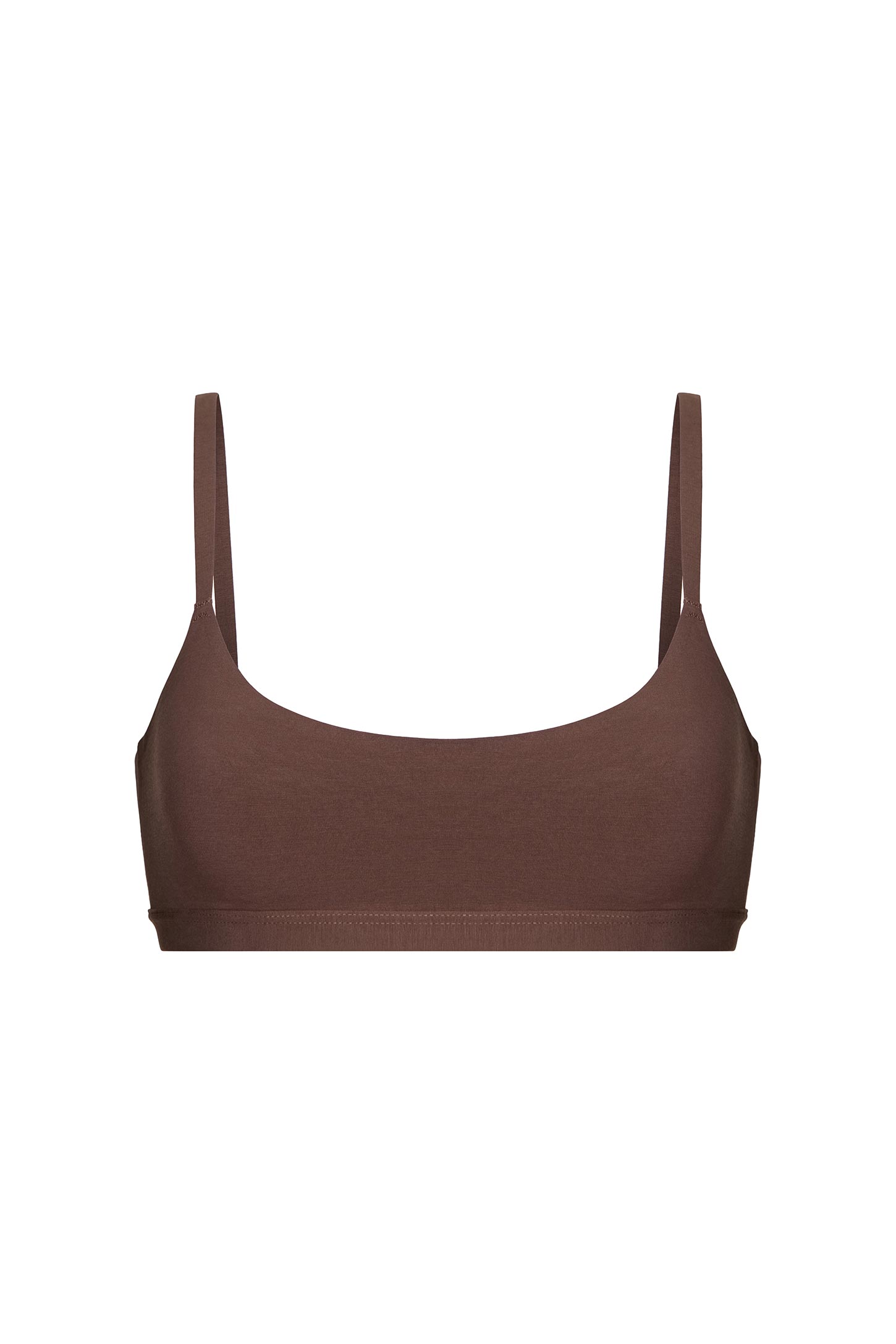 Топ на тонких регулируемых бретелях с эластичной резинкой под грудью. Модель из мягкого и эластичного хлопка, с анатомическим формованием чашек на подкладке, без вытачек. Без чашек-вкладышей.