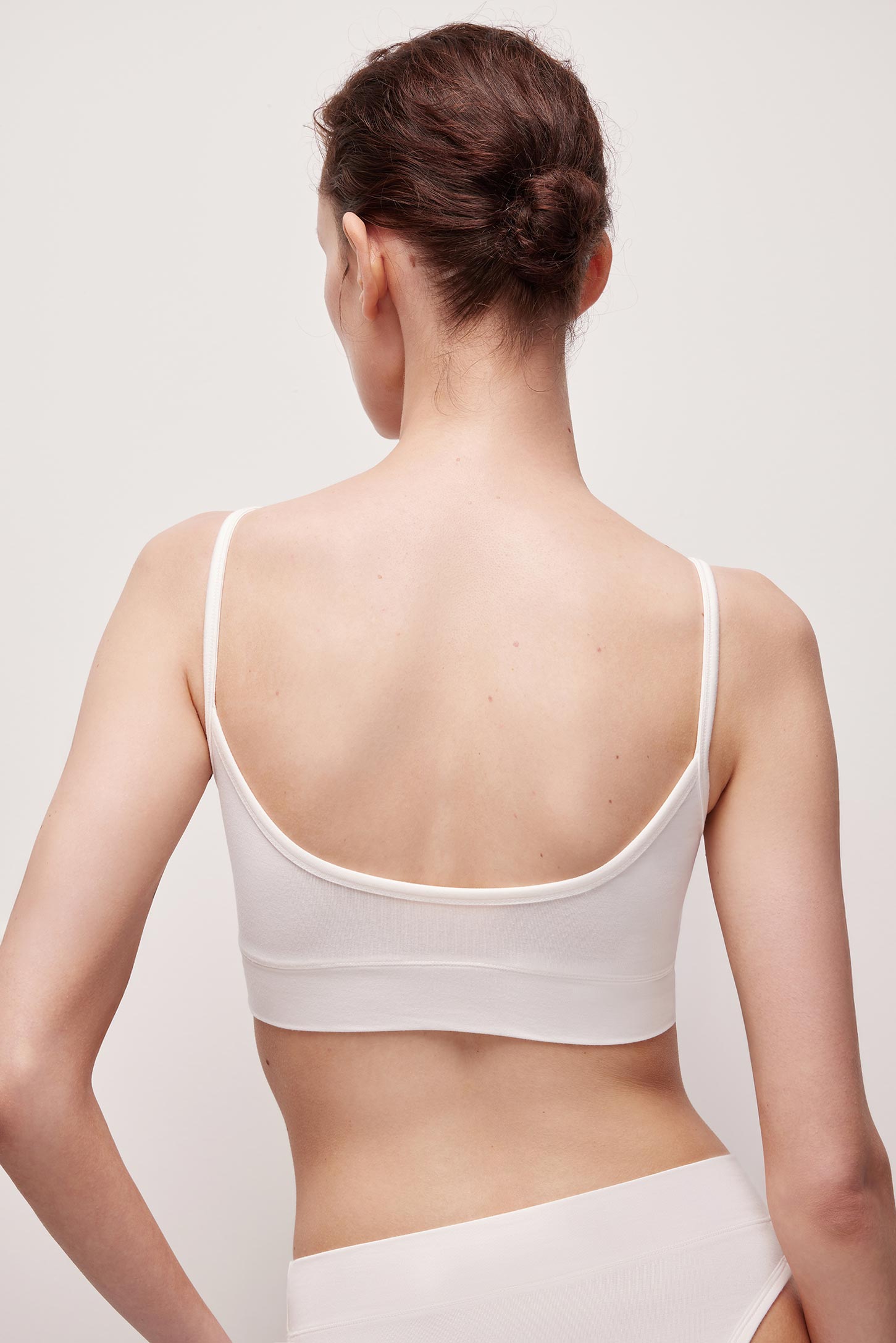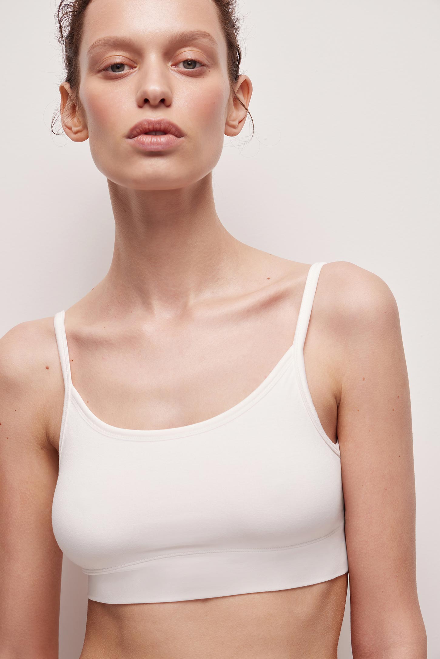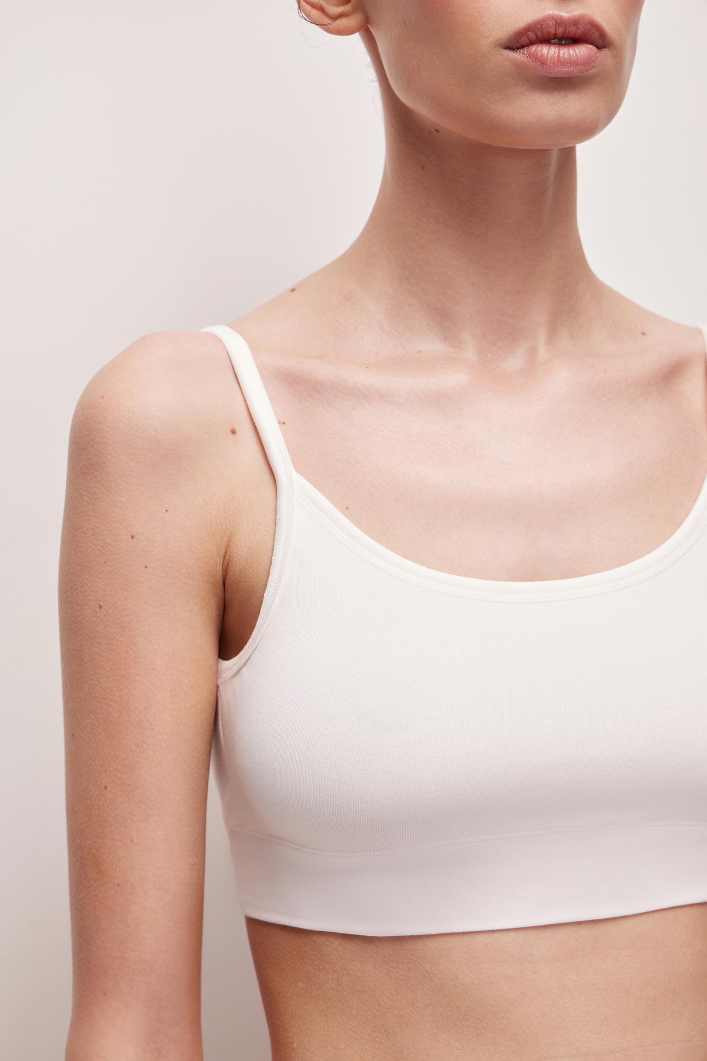 Топ на тонких бретелях без чашек-вкладышей, изготовлен из шелковистого бамбукового трикотажа. Широкий пояс по низу изделия гарантирует комфортную посадку по фигуре и обеспечивает фиксацию. Передняя часть топа дополнена подкладкой.