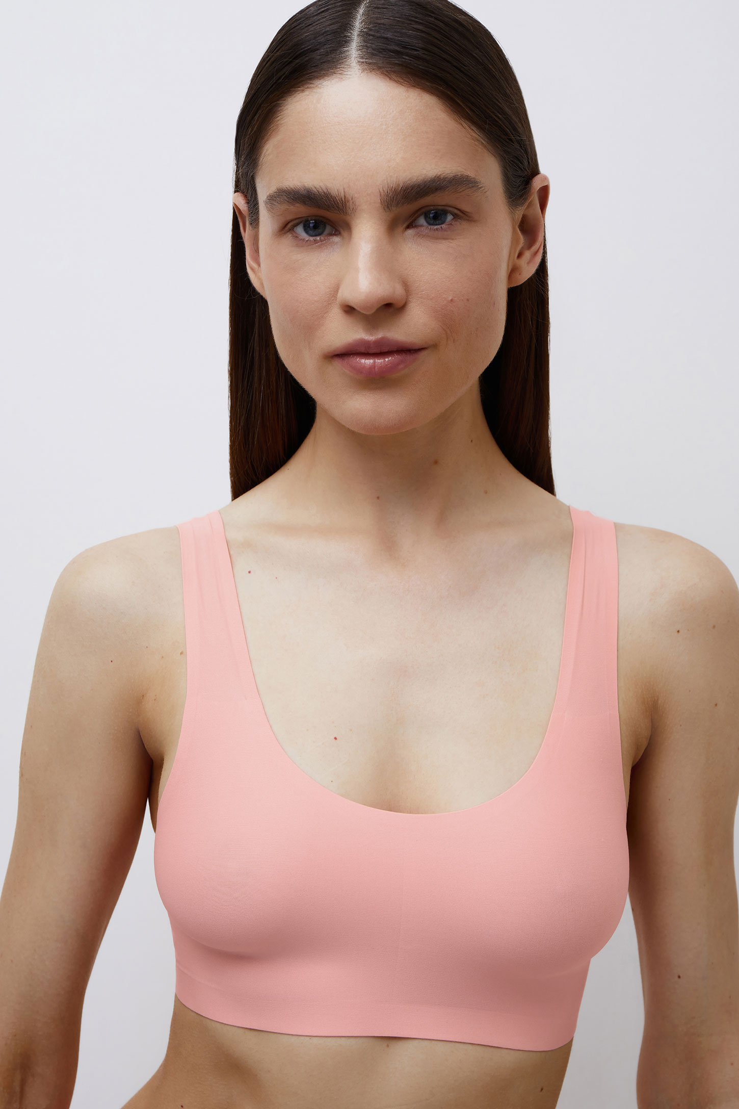 Базовый топ на широких бретелях с округлым вырезом горловины изготовлен из сверхтонкого и эластичного капронового трикотажа по технологии “Lasercut” с высококачественным клеевым краем. Передняя часть топа выполнена на подкладке и дополнена мягкими съемными чашками-вкладышами из силикона с перфорированным трикотажным покрытием, выполненным в цвет изделия. Отсутствие швов позволяет изделию оставаться незаметным под одеждой, обеспечивает максимальный комфорт и идеальное облегание фигуры. Подходит для повседневной носки, а также в качестве белья для занятий спортом или йогой. *Сверхтонкий эластичный материал позволяет подбирать размер исходя из предпочтений по плотности посадки, например, XS/S может подойти для параметров M/L, а M/L для парaметров XL/XXL.