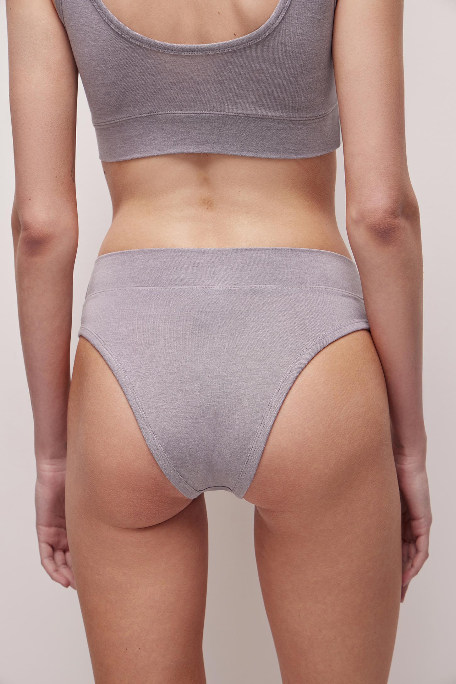 Трусы-бразилиано с высокой посадкой изготовлены из шелковистого бамбукового трикотажа. Широкий пояс без резинки мягко облегает фигуру. Изделие выполнено с декоративной окантовкой. Вырезы для ног окантованы широкой бейкой без резинки.