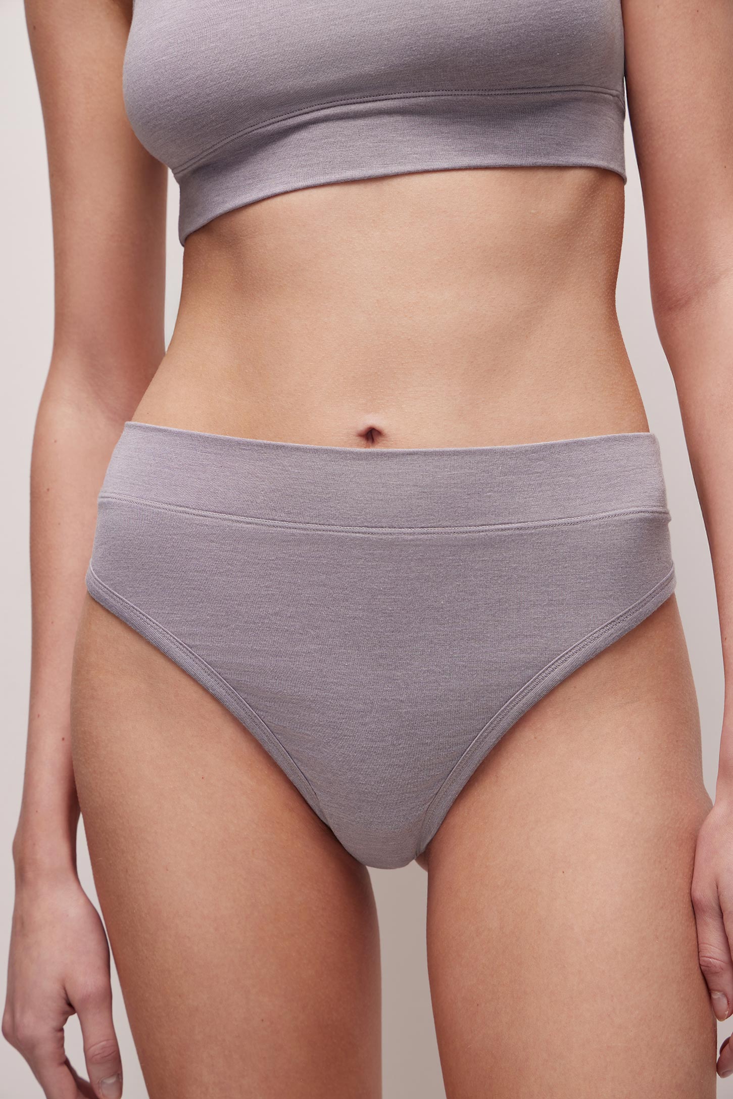 Трусы-стринги с высокой посадкой изготовлены из шелковистого бамбукового трикотажа. Широкий пояс без резинки мягко облегает фигуру. Изделие выполнено с декоративной окантовкой. Вырезы для ног окантованы широкой бейкой без резинки.